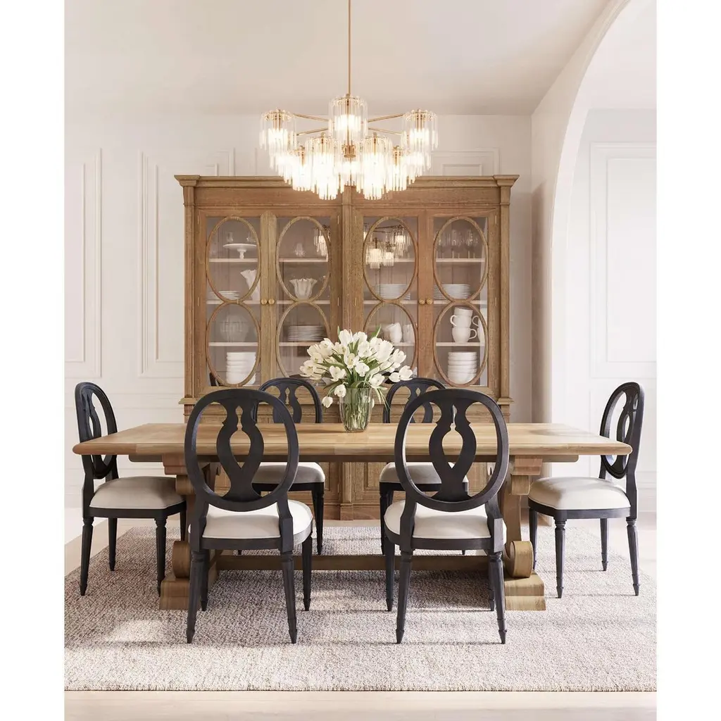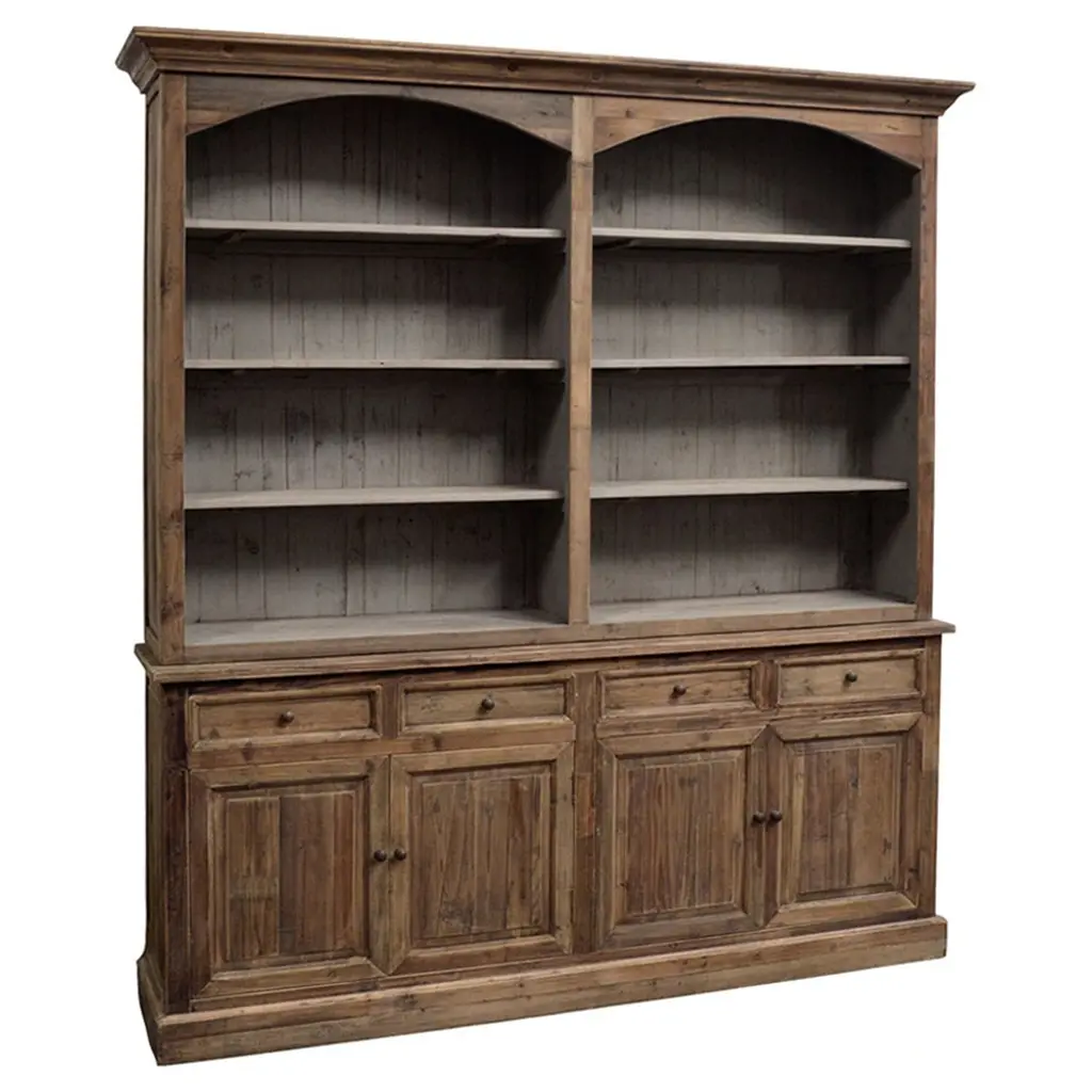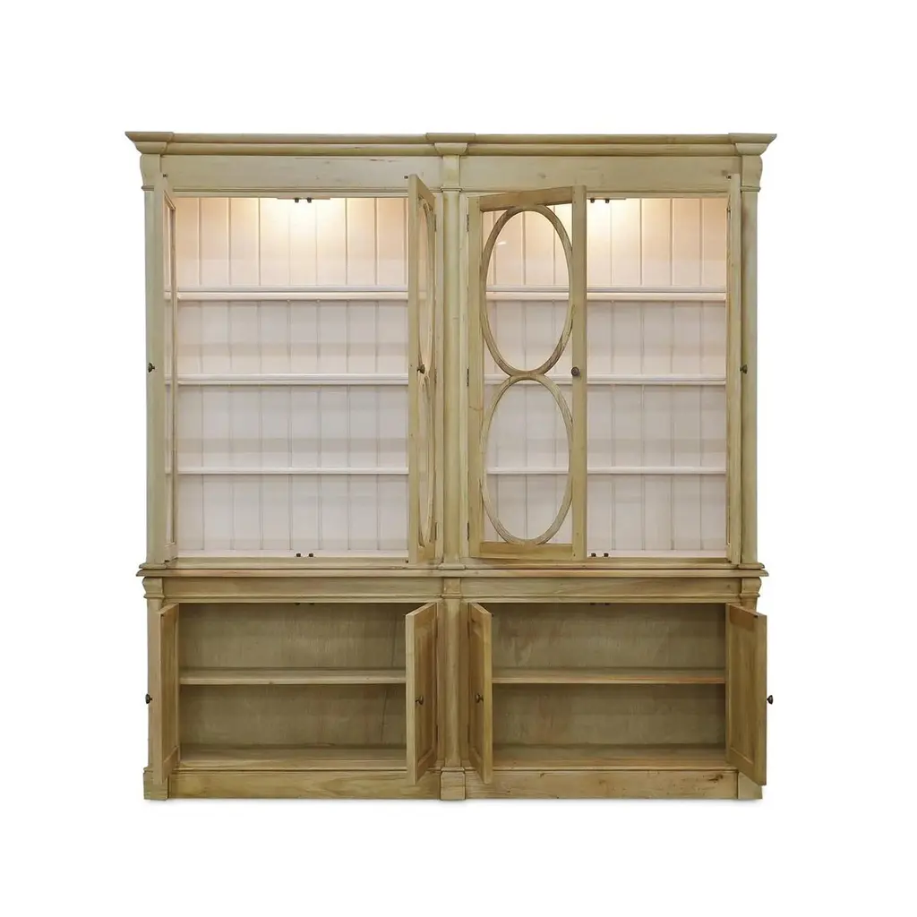 The cabinet has a lightly distressed fruitwood finish, giving it an aged patina that feels both elegant and lived-in. The interior, fitted with LED lighting and painted in putty cream, offers a clean backdrop for books, china, or display objects.Glass doors with classic oval motifs lend architectural interest and soft sophistication, while the paneled doors below offer concealed storage. Crown molding and subtle columnar accents enhance its stately silhouette, making it ideal for living rooms, dining areas, or libraries with French country or European-influenced styling.Dimensions: 96" W x 19" D x 96" HCustom finish options are also available. Contact us to learn more.Lead time 20 - 24 weeks.This exterior finish requires bleaching, which often leads to variation in wood color.