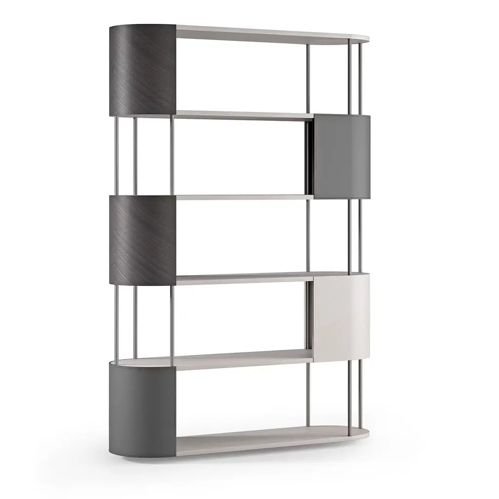 Inspired by the volumetry of the Milanese Gae Aulenti Square after which it is named, this bookcase exemplifies contemporary taste for sleek volumes and artful details. A tubular metal frame sustains the five shelves (130cm long but also available in a 220cm variant upon request), marked by rounded extremities embraced by curved elements finished in light or dark Tay, Canaletto walnut, or leather. Please check all customization options with the Concierge.