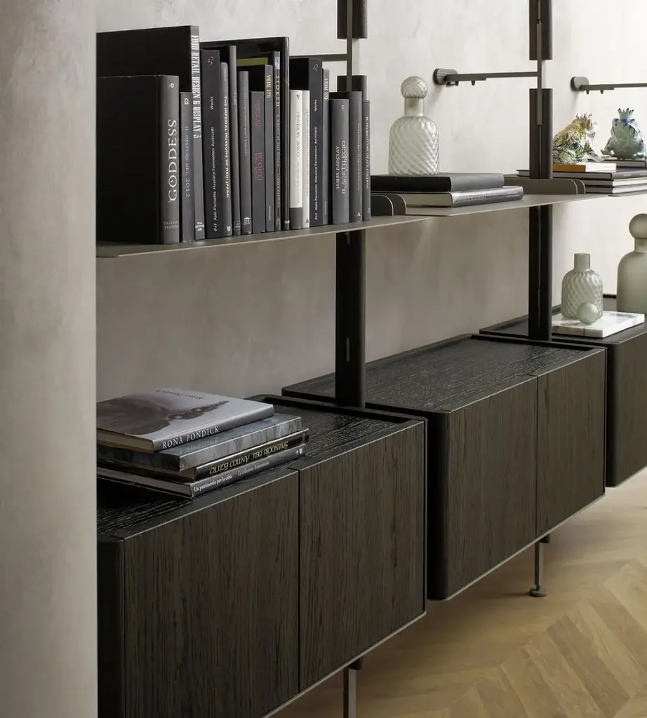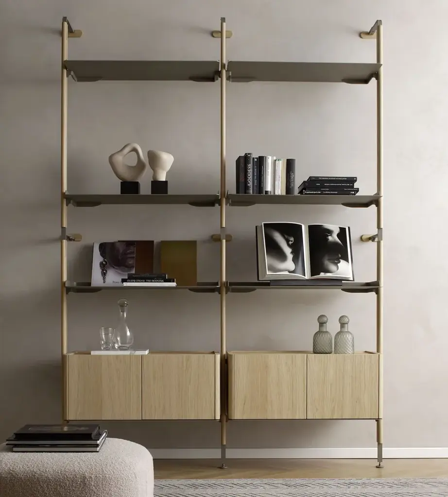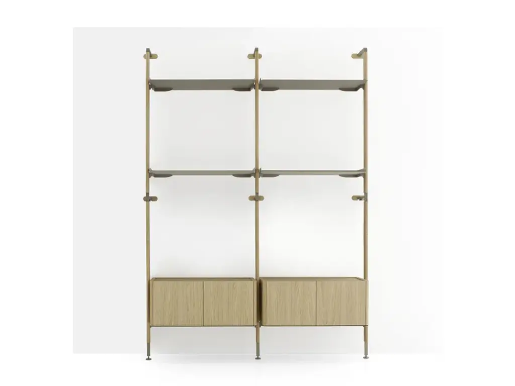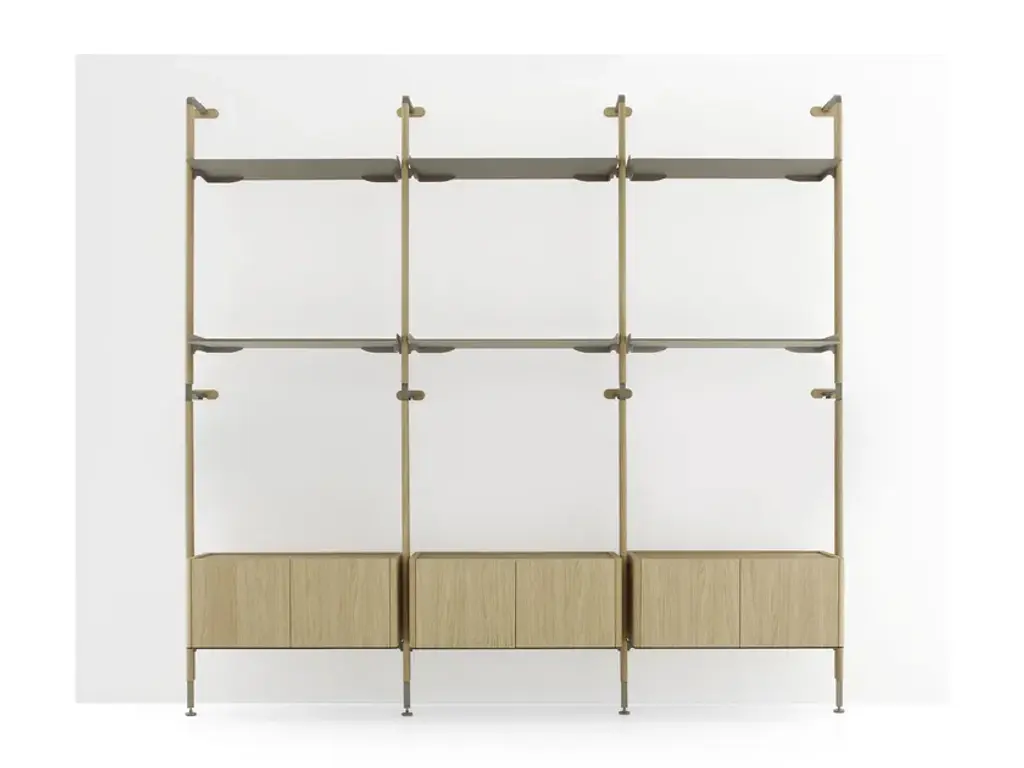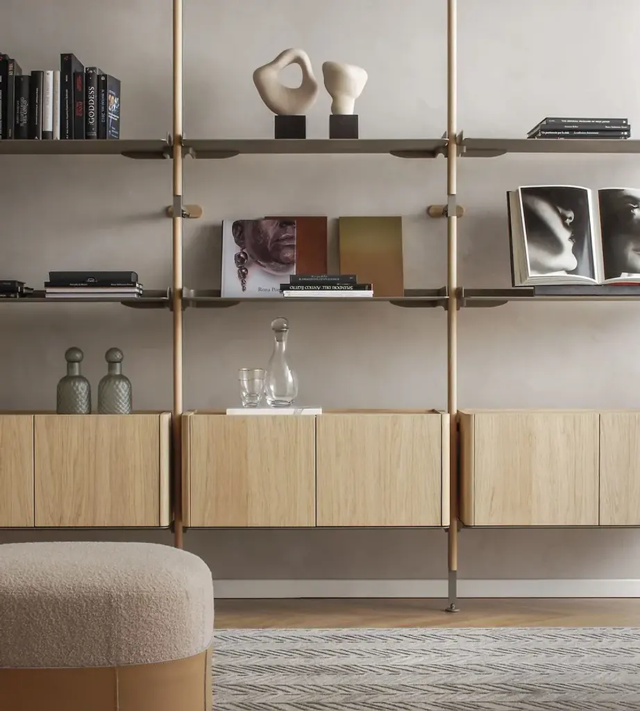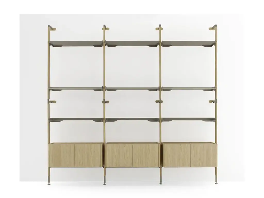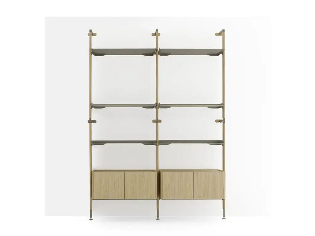 Modular wall composition with solid wood uprights and metal shelves. The bookcase is modular and made up of individual modules, each consisting of two vertical uprights and a Champagne metal fixing system with a solid wood cover. The shelves are customizable (minimum 1 – maximum 4) and can be paired with curved storage boxes in veneered MDF. An optional storage box can be inserted at the bottom. Available in different finishes.HM.GAL.COC.RL.MC: 3 modules II, 9 Champagne metal shelves, 3 curved storage boxes in veneered MDF oak Laguna.HM.GAL.COC.RN.MC: 3 modules II, 9 Champagne metal shelves, 3 curved storage boxes in veneered MDF Natural Oak.HM.GAL.COE.RL.MC: 3 modules III, 6 Champagne metal shelves, 3 curved storage boxes in veneered MDF oak Laguna.HM.GAL.COE.RN.MC: 3 modules III, 6 Champagne metal shelves, 3 curved storage boxes in veneered MDF Natural Oak.HM.GAL.COF.RL.MC: 2 modules III, 4 Champagne metal shelves, 2 curved storage boxes in veneered MDF oak Laguna.HM.GAL.COF.RN.MC: 2 modules III, 4 Champagne metal shelves, 2 curved storage boxes in veneered MDF Natural Oak.HM.GAL.COG.RL.MC: 2 modules II, 6 Champagne metal shelves, 2 curved storage boxes in veneered MDF oak Laguna.HM.GAL.COG.RN.MC: 2 modules II, 6 Champagne metal shelves, 2 curved storage boxes in veneered MDF Natural Oak.Haute Couture gets its inspiration from high fashion, where stitching, workmanship and materials are at the core of the design. Dressers are outfitted using hand-crafted leather, the furniture is embellished using precious marble, and the wood is selected on the basis of its grain. The synthesis of this collection is a modern line with a contemporary slant that is embodied in a luxury that is not overly flashy but grounded in sophistication. Timeless products made with high quality materials and handcrafted in Italy.
