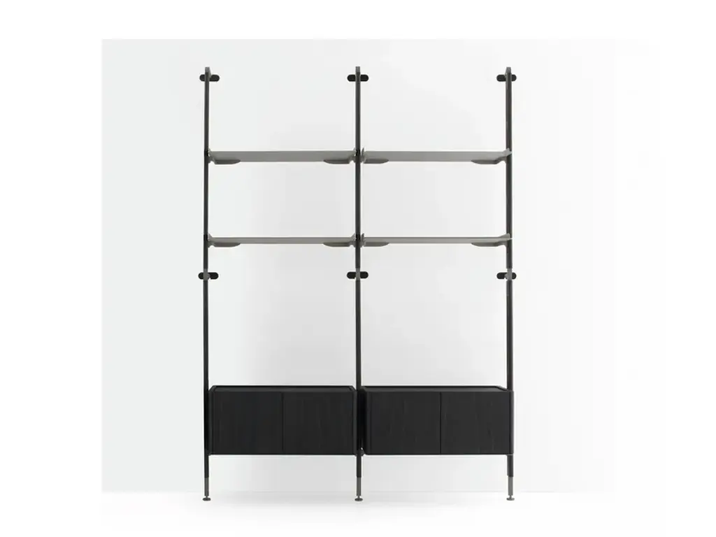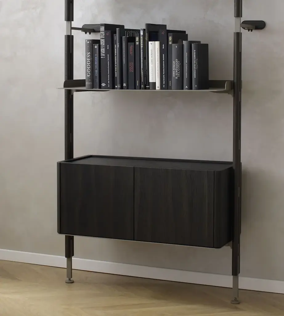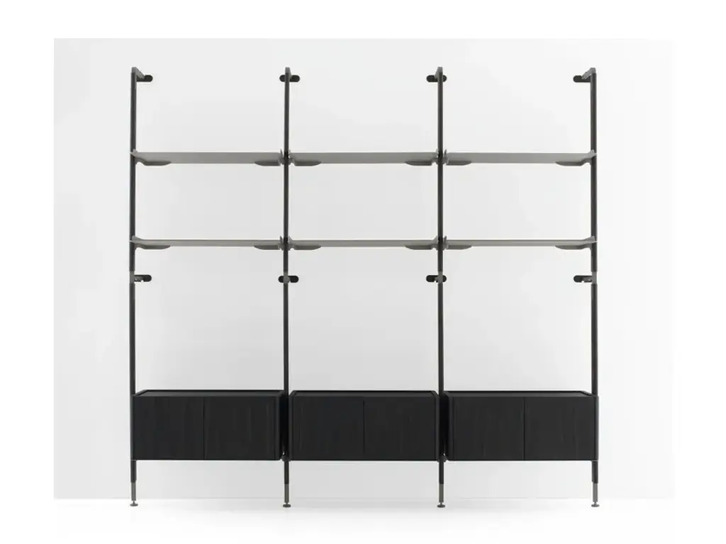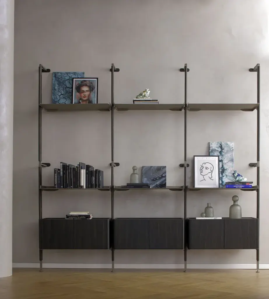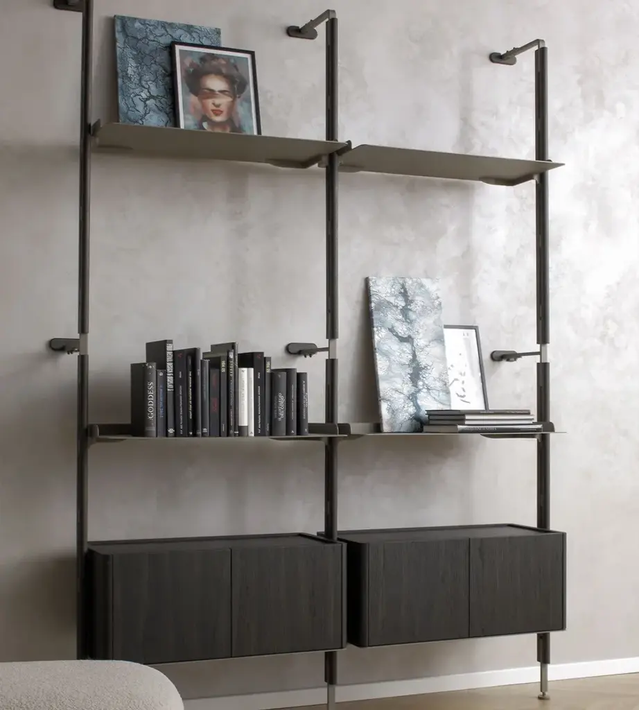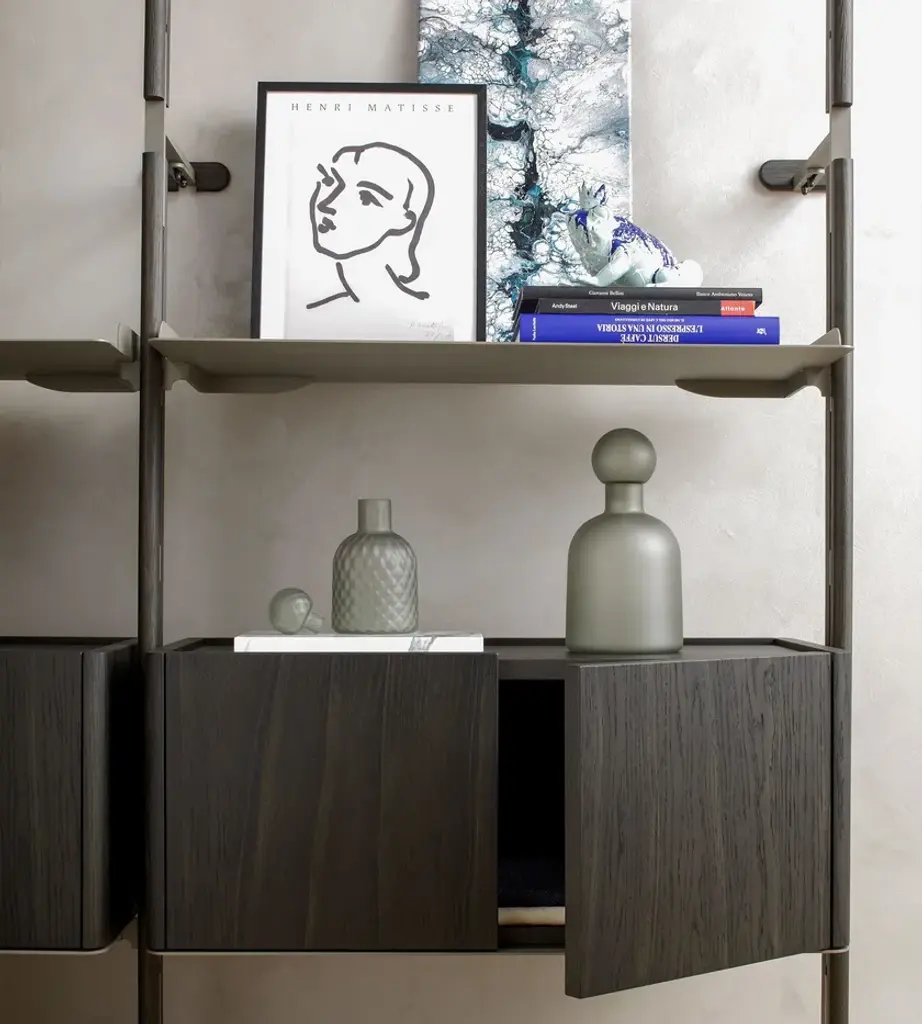 Modular wall composition with solid wood uprights and metal shelves. The bookcase is modular and made up of individual modules, each consisting of two vertical uprights and a Champagne metal fixing system with a solid wood cover. The shelves are customizable (minimum 1 – maximum 4) and can be paired with curved storage boxes in veneered MDF. An optional storage box can be inserted at the bottom. Available in different finishes.HM.GAL.COC.RL.MC: 3 modules II, 9 Champagne metal shelves, 3 curved storage boxes in veneered MDF oak Laguna.HM.GAL.COC.RN.MC: 3 modules II, 9 Champagne metal shelves, 3 curved storage boxes in veneered MDF Natural Oak.HM.GAL.COE.RL.MC: 3 modules III, 6 Champagne metal shelves, 3 curved storage boxes in veneered MDF oak Laguna.HM.GAL.COE.RN.MC: 3 modules III, 6 Champagne metal shelves, 3 curved storage boxes in veneered MDF Natural Oak.HM.GAL.COF.RL.MC: 2 modules III, 4 Champagne metal shelves, 2 curved storage boxes in veneered MDF oak Laguna.HM.GAL.COF.RN.MC: 2 modules III, 4 Champagne metal shelves, 2 curved storage boxes in veneered MDF Natural Oak.HM.GAL.COG.RL.MC: 2 modules II, 6 Champagne metal shelves, 2 curved storage boxes in veneered MDF oak Laguna.HM.GAL.COG.RN.MC: 2 modules II, 6 Champagne metal shelves, 2 curved storage boxes in veneered MDF Natural Oak.Haute Couture gets its inspiration from high fashion, where stitching, workmanship and materials are at the core of the design. Dressers are outfitted using hand-crafted leather, the furniture is embellished using precious marble, and the wood is selected on the basis of its grain. The synthesis of this collection is a modern line with a contemporary slant that is embodied in a luxury that is not overly flashy but grounded in sophistication. Timeless products made with high quality materials and handcrafted in Italy.