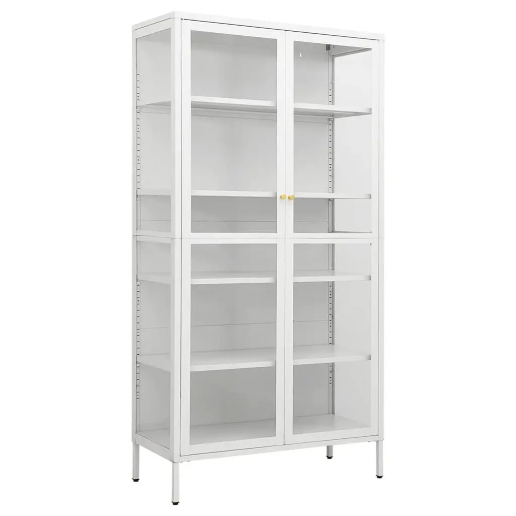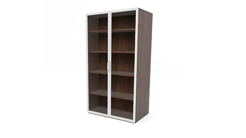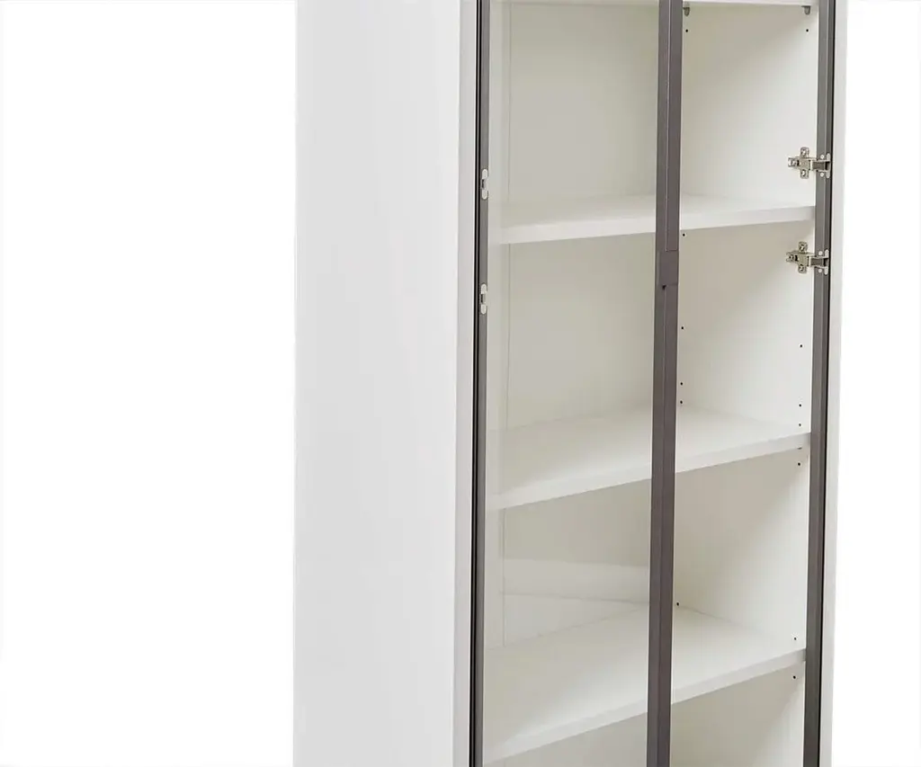 Choose the Gammel High Bookcase when you have a need for more storage. Made in Italy from eco-friendly recycled materials, this white, high-gloss piece offers simple, sophisticated storage that is practical and versatile in any space. Protect and organize your books, binders, collections and more, but keep them readily visible behind the glass doors. The melamine surfaces of this piece are designed to mirror the look of real wood complete with intentional, rustic saw marks.