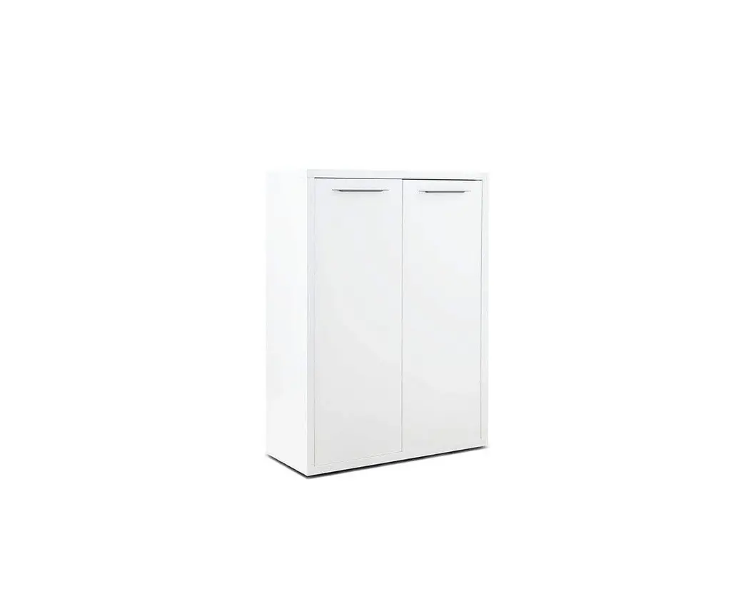 Made in Italy from eco-friendly recycled materials, the Gammel Low Bookcase with Doors in white is a versatile solution for modern workspaces. Clean lines and a high-gloss finish define this sturdy piece, allowing it to coordinate with multiple styles of decor. Two adjustable shelves provide options to meet your storage needs. The melamine surfaces of this piece are designed to mirror the look of real wood complete with intentional, rustic saw marks.