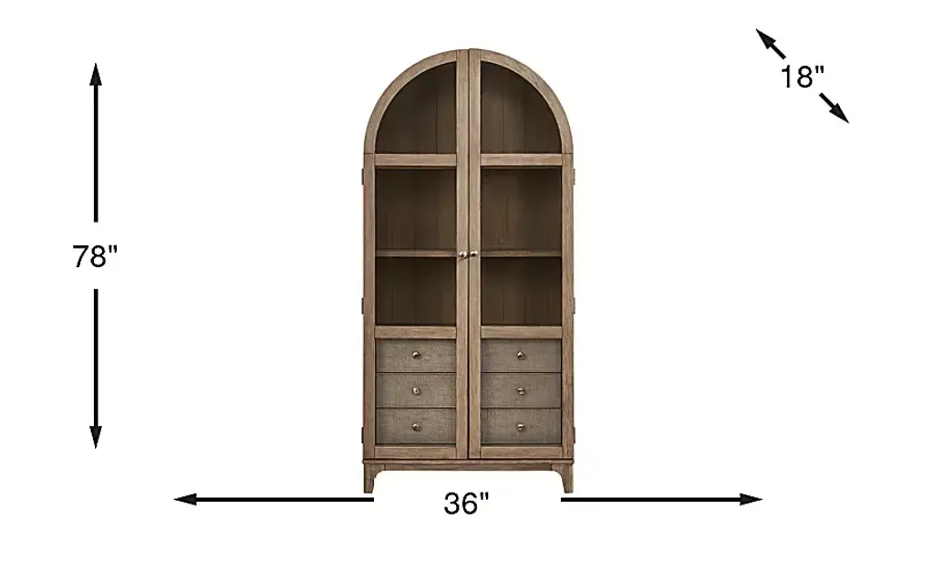 Timeless form with organic textures, warm tones and woven details in the Garden Grove collection brings the enduring charm of a warm cup of tea and heartwarming memories. Transitional in style, this bookcase is finished in warm brown and features a stylish arched frame. Two glass doors reveal three spacious open shelves for display space and six brown wicker inlayed drawers ideal for organizing everyday essentials. Silver knobs add a subtle, stylish touch that completes the look with understated elegance.