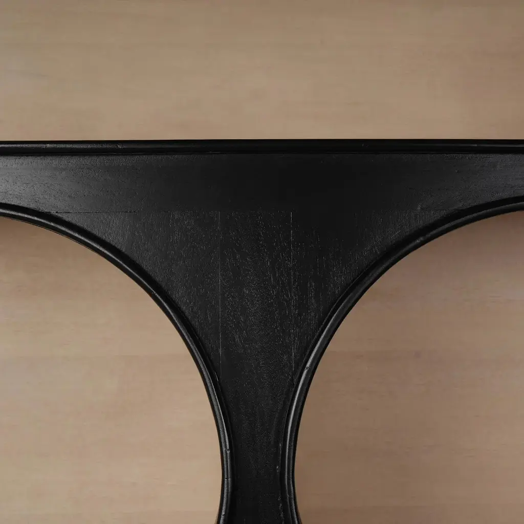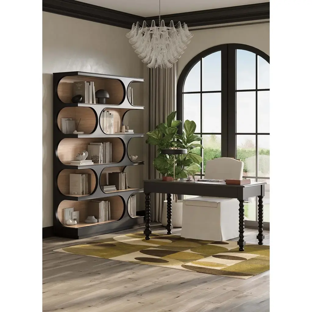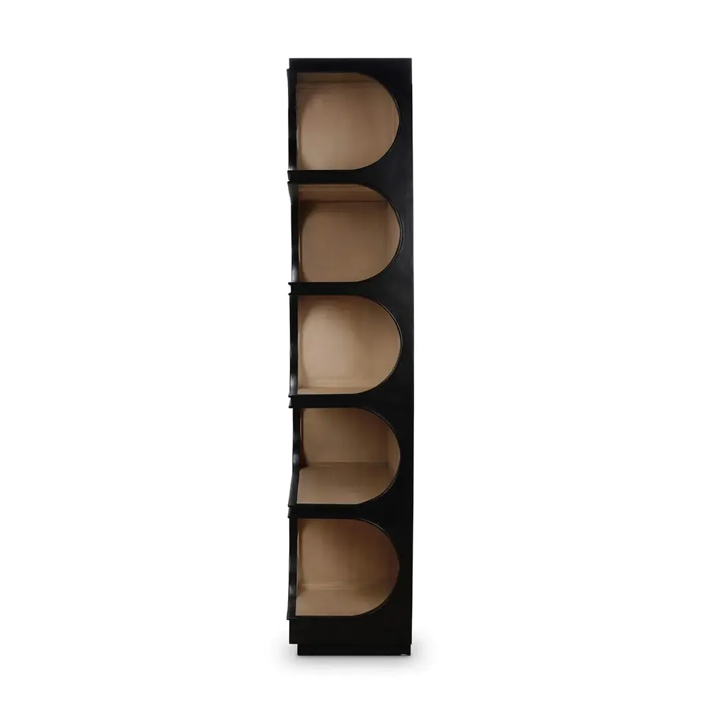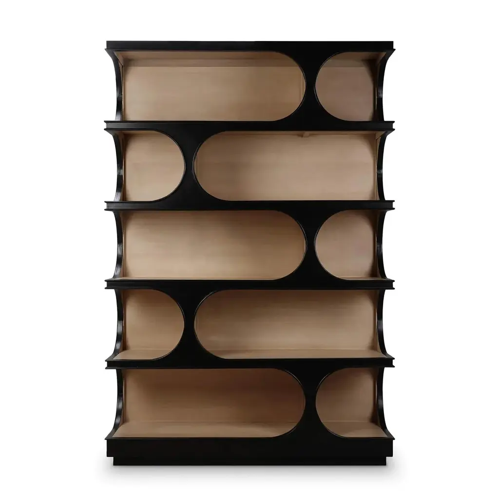 Finished in Batavia Black with a Sandbar finish interior, this bookcase showcases rhythmic, crescent-shaped oval cut-outs that form an architectural silhouette—an homage to the sculptural experimentation of 1960s modernism. Its open, asymmetrical shelving offers dramatic visual contrast while allowing for flexible display of books, objects, and art. The two-tone finish enhances its gallery-like presence, making it a sophisticated focal point for contemporary or retro-inspired spaces. Dimensions: 59" W x 18" D x 87" H