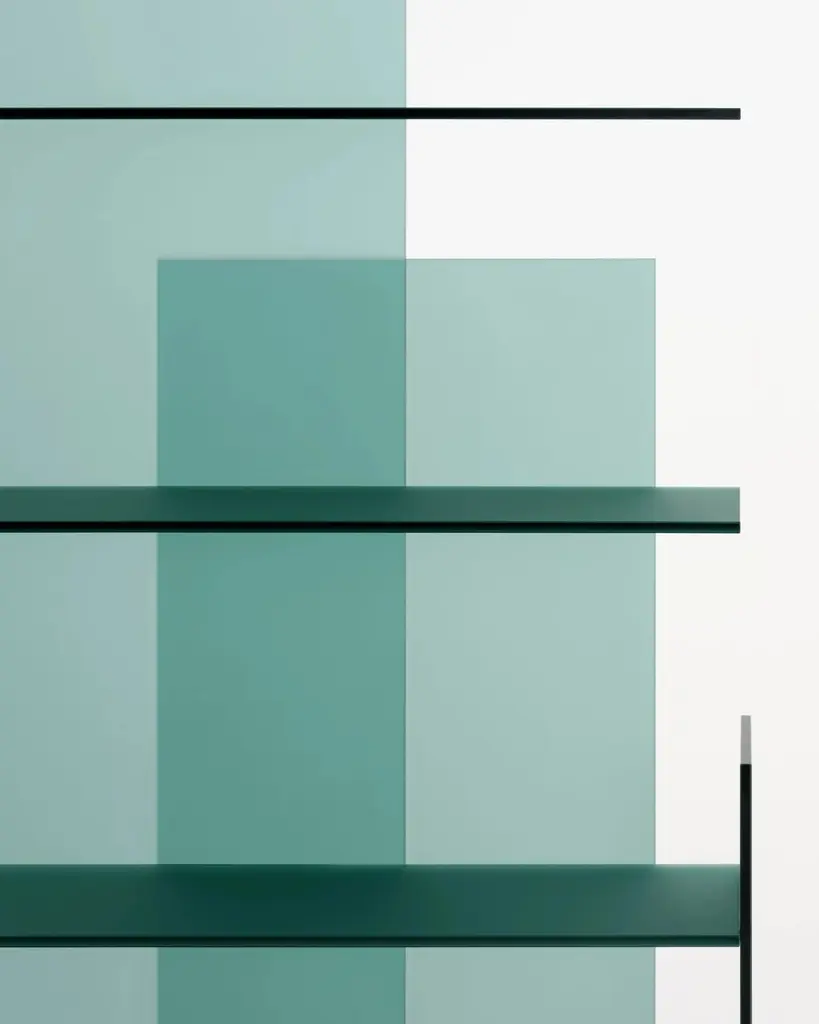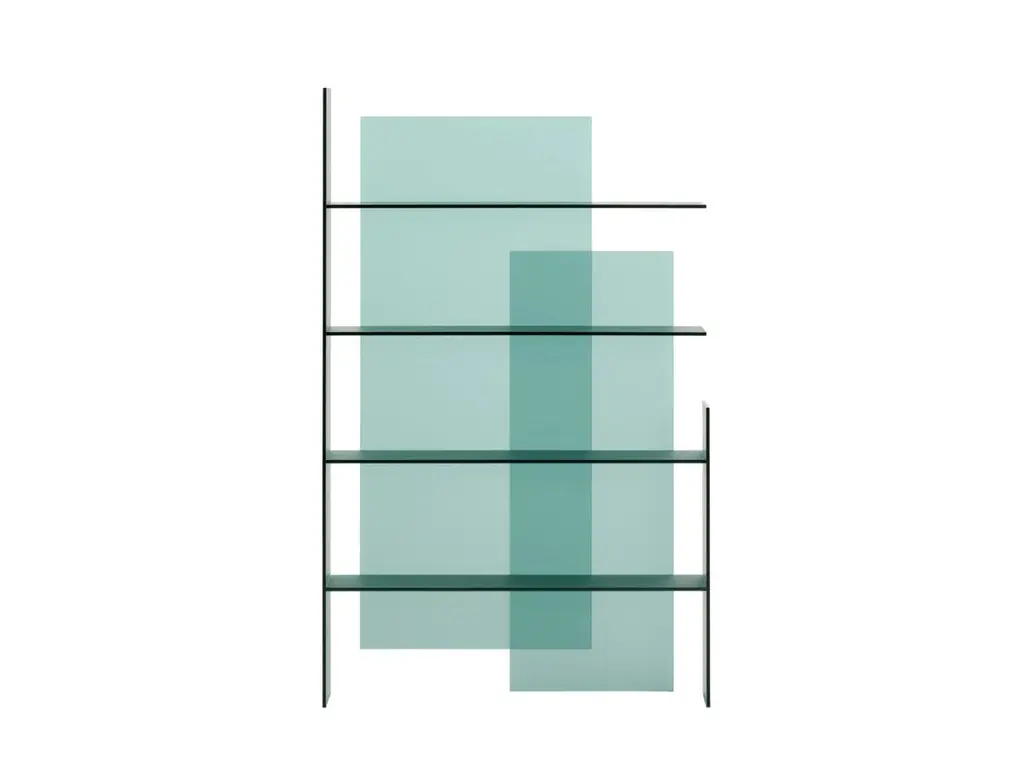 Collection of furniture comprising shelves, consoles, bookcase and low tables, completely made of a special 10 mm tempered green or extra-clear double-sided acid-etched glass. Each item is a composition of interlocked and overlapping glass sheets which, through a special UV bonding method, realizes pure and refined sculptural furnishing elements characterized by a rigorous form. The shelves can be wall-mounted in either orientation.Not available custom made.DIMENSIONS:L106 W32 H170