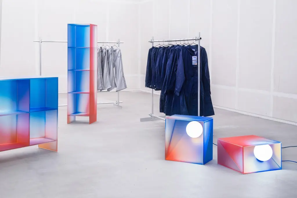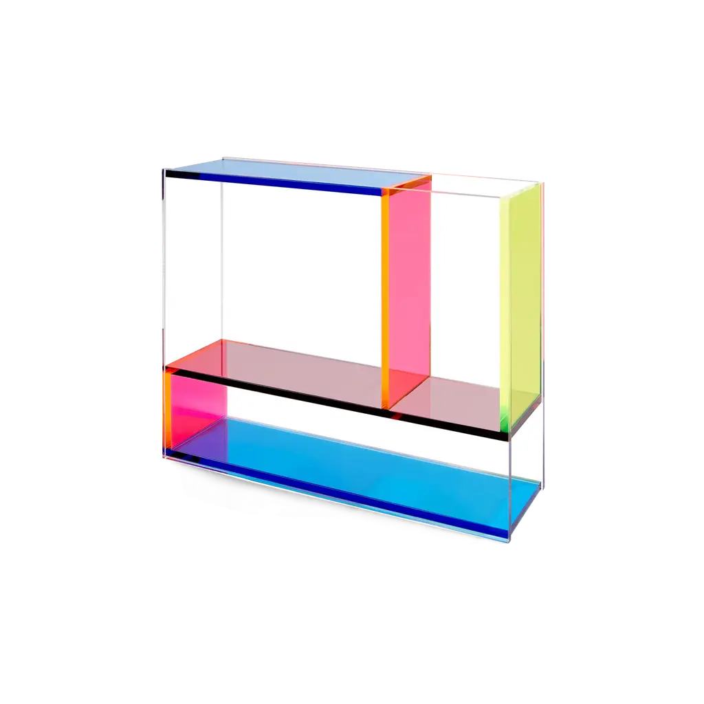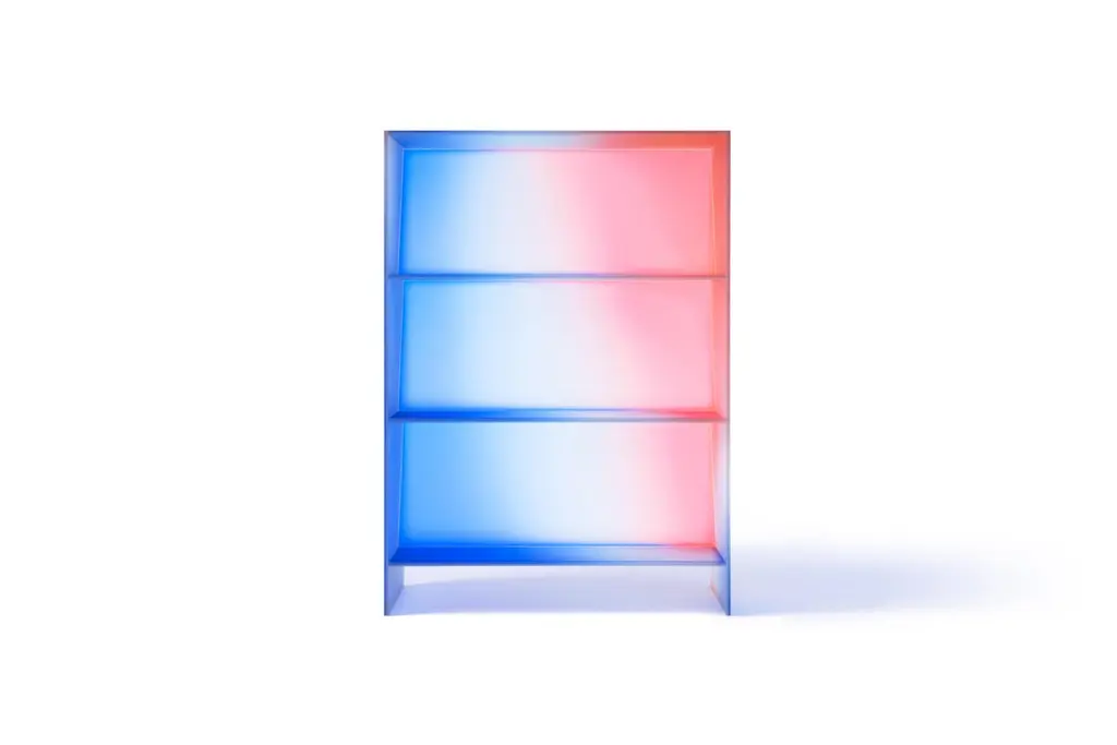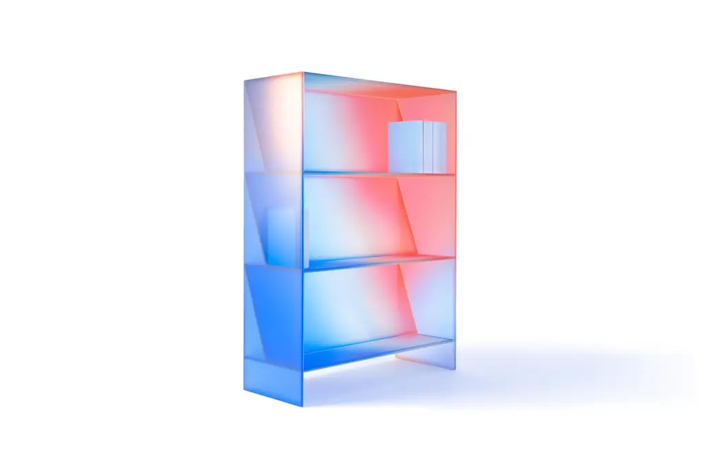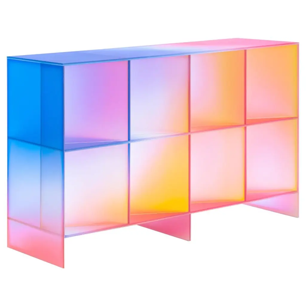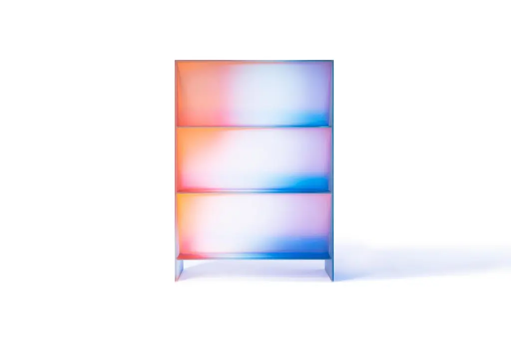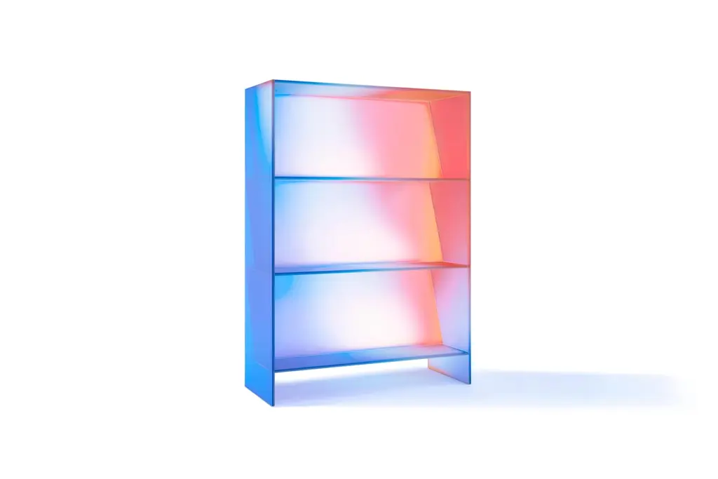 'HALO' collection by Buzao - Bookcase or cabinetLaminated dichroic glass, gradient colors 100 x 40 x H 139 cmStudio Buzao from Guangzhou (China) is exploring innovation with furniture and lighting design. From marble to lava stone, from electroplated stainless steel to laminated glass: Buzao always works with exclusive materials in a very contemporary style. With this new collection 'HALO', Buzao created a set of furnitures and lightings made of dichroic glass which gives unique gradient colors from pink to blue. We enjoy every minute looking at this piece like a sunset or a rainbow.