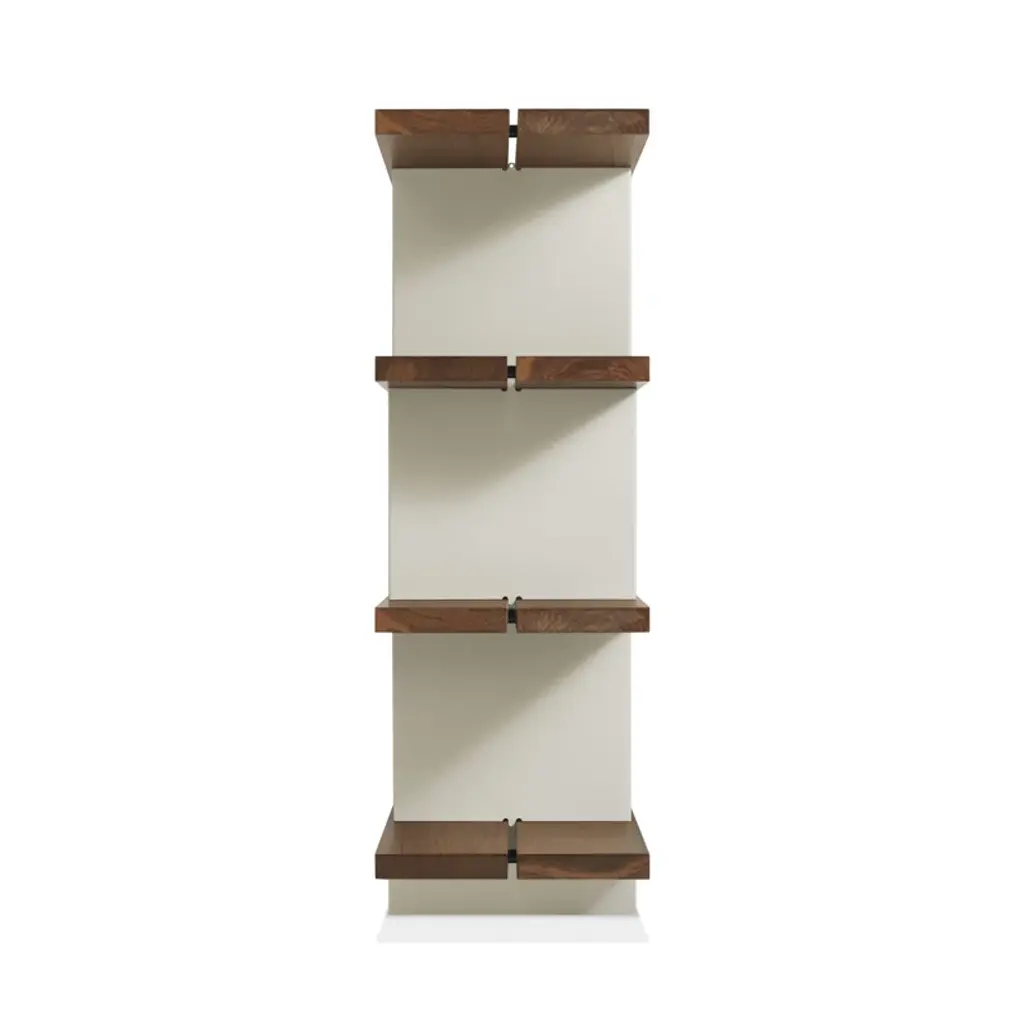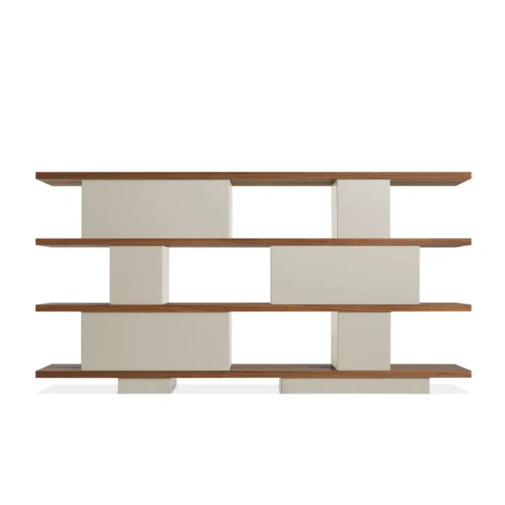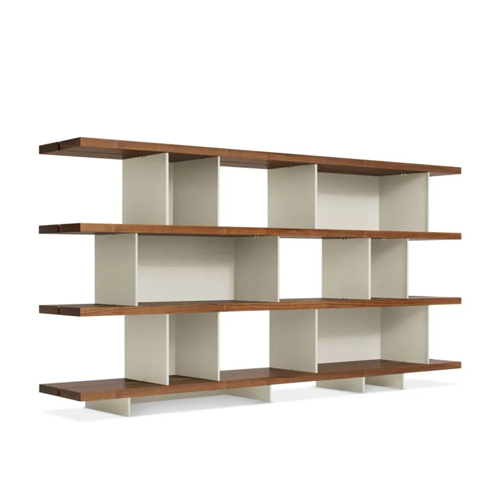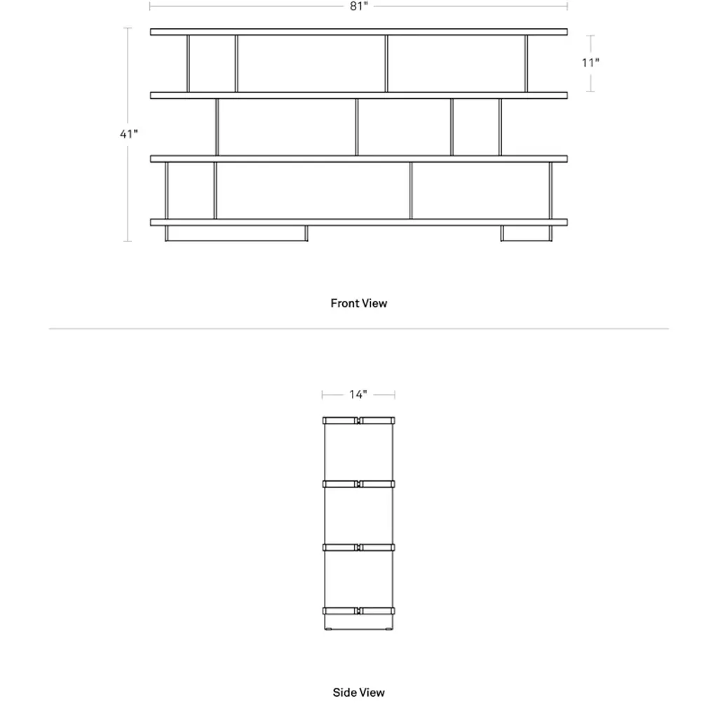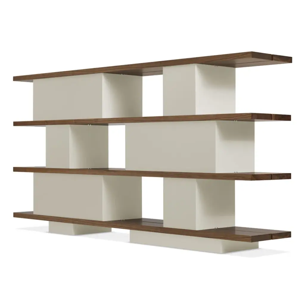 Wood shelves and metal blocks stack without the need for hardware forming beautiful voids and cubbies to house all things in a perfectly curated manner. Two widths of foot and shelf blocks celebrate asymmetry while bringing stability and visual appeal.