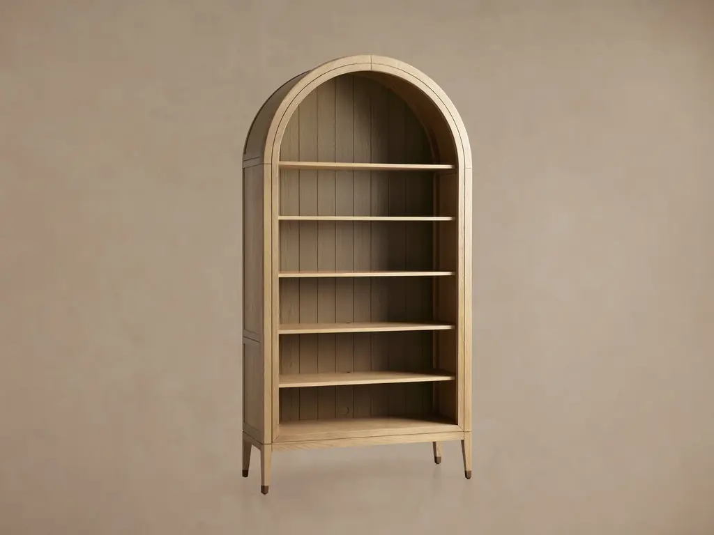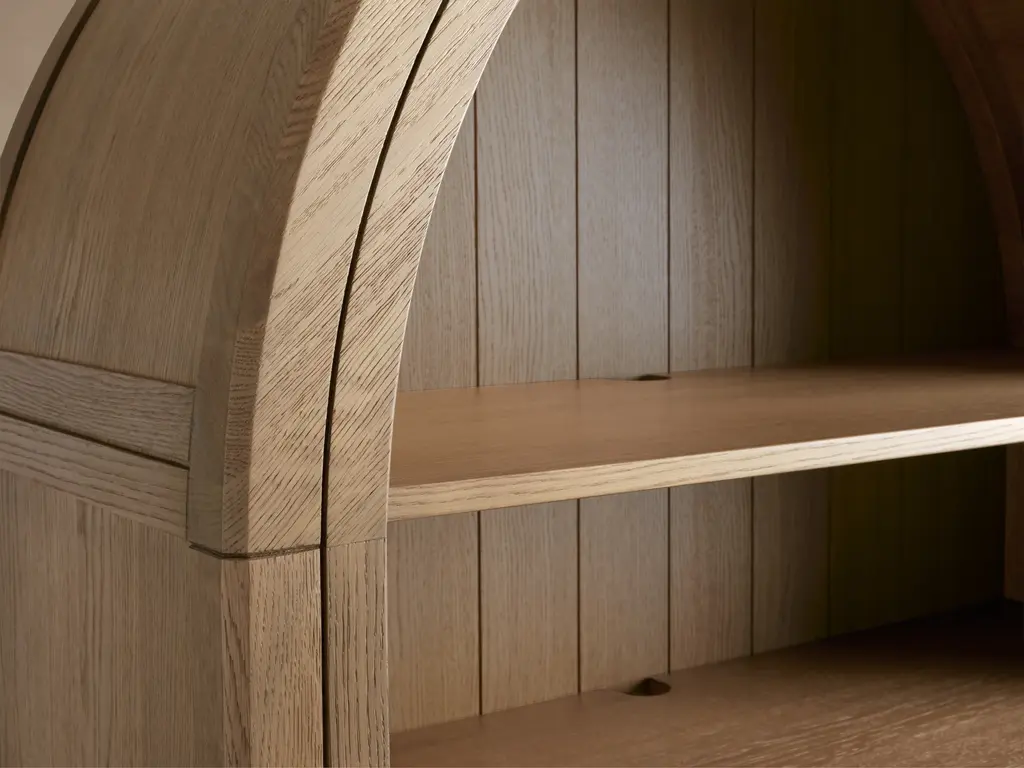 Where gentle curves meet the natural graining of oak, our artisan-crafted Hattie Collection awaits. Hattie’s generous shelves mean there’s always room to display favorite curiosities and everyday essentials.