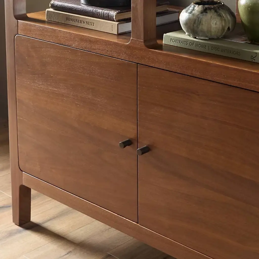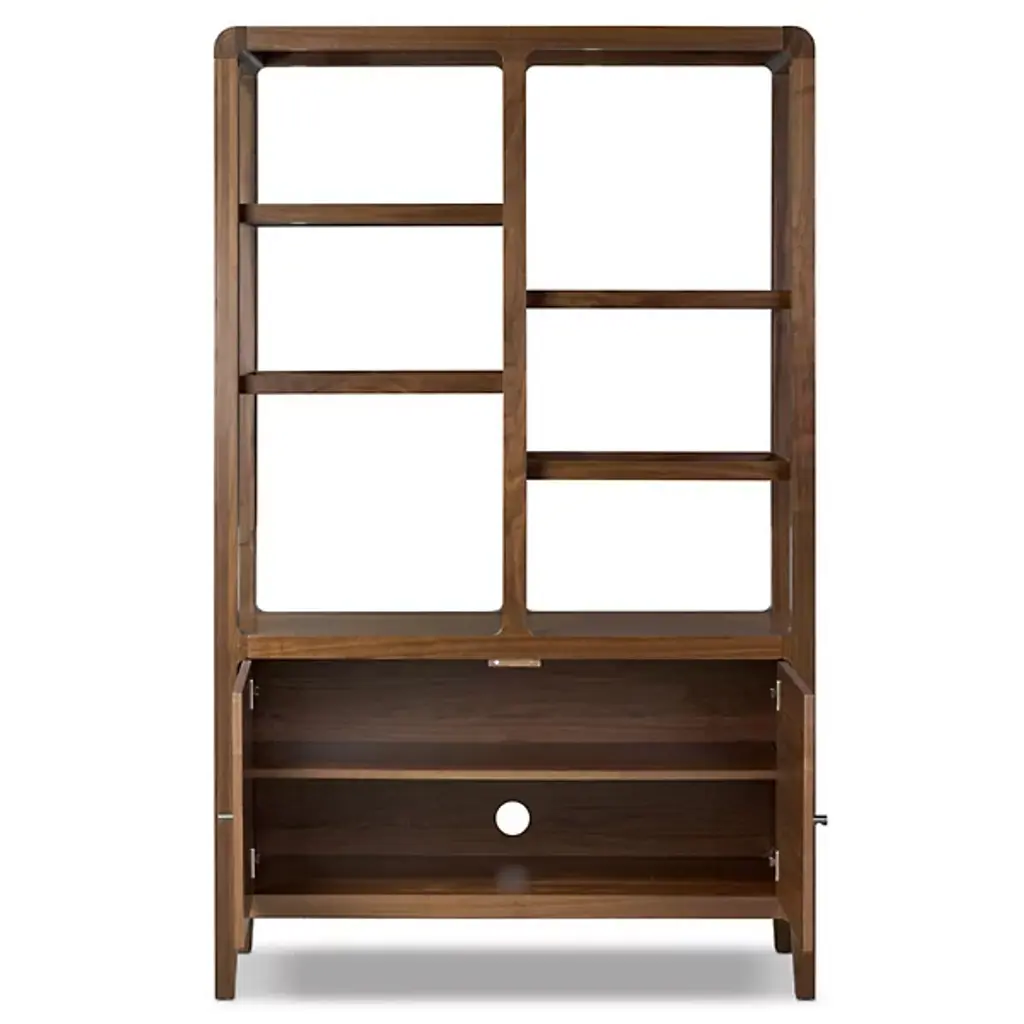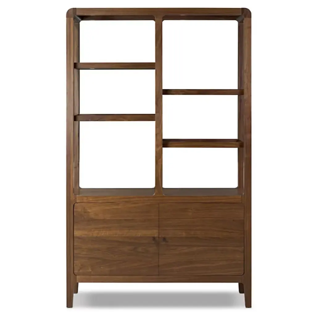 The Hawkes Bookcase from Four Hands rethinks storage with playfully offset shelves that create dynamic spaces for display. Crafted from solid walnut, the design balances open and closed storage compartments for versatile organization. Rounded corners and gently curved legs soften the overall appearance while maintaining the piece's strong presence. Each compartment becomes its own stage for books, photographs, or collected treasures. The thoughtful combination of concealed storage below and open shelving above offers practical solutions for organizing and showcasing personal items.