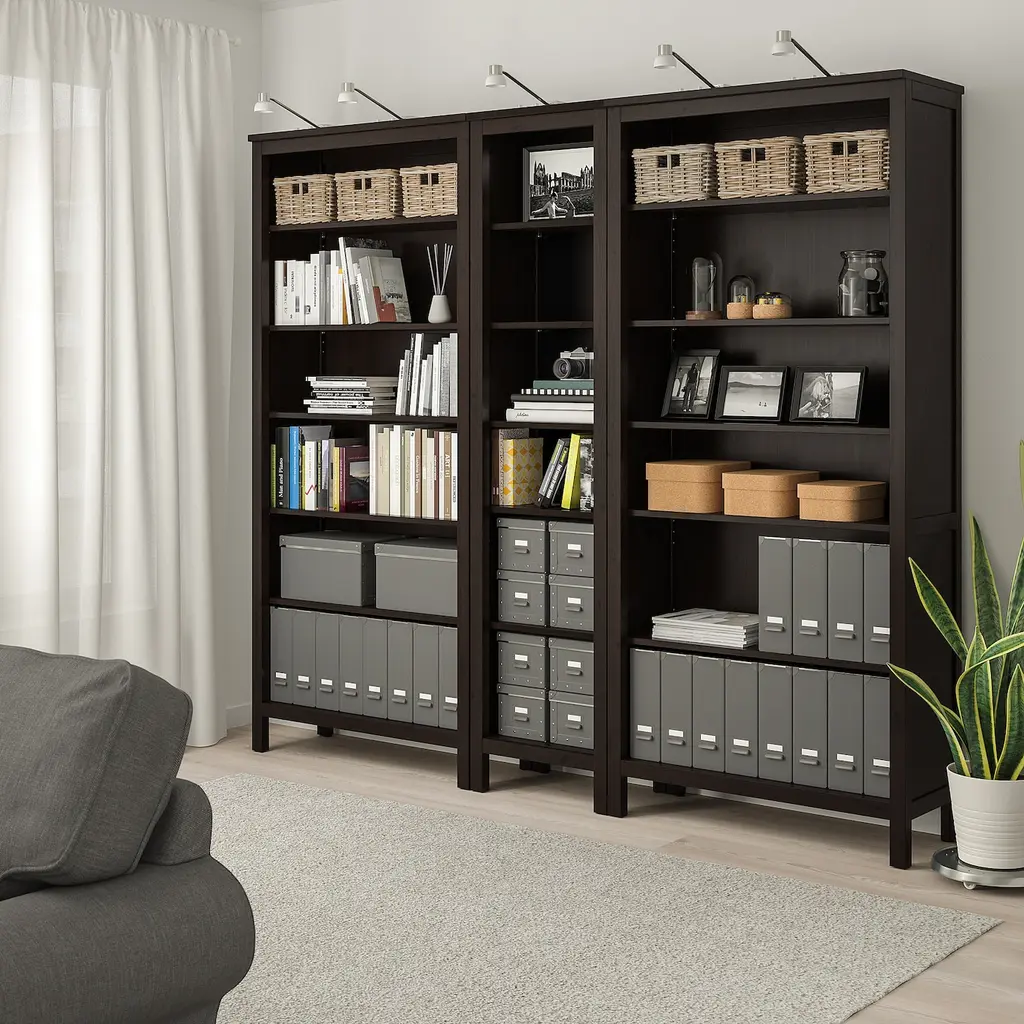 HEMNES Bookcase - black-brown 90 1/8x77 1/2 ". Solid wood has a natural feel. The shelves are adjustable so you can customize your storage as needed. Three fixed shelves provide increased stability. Adjustable feet for stability on uneven floors.