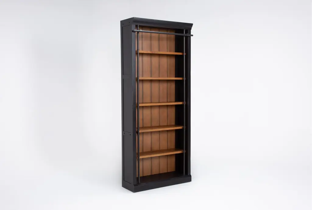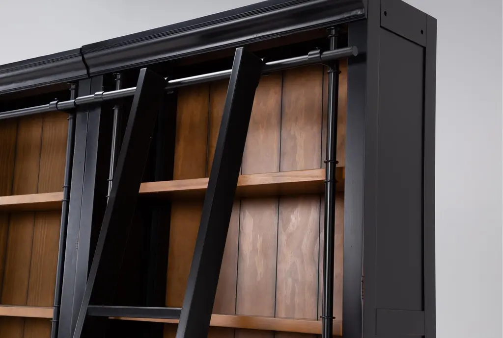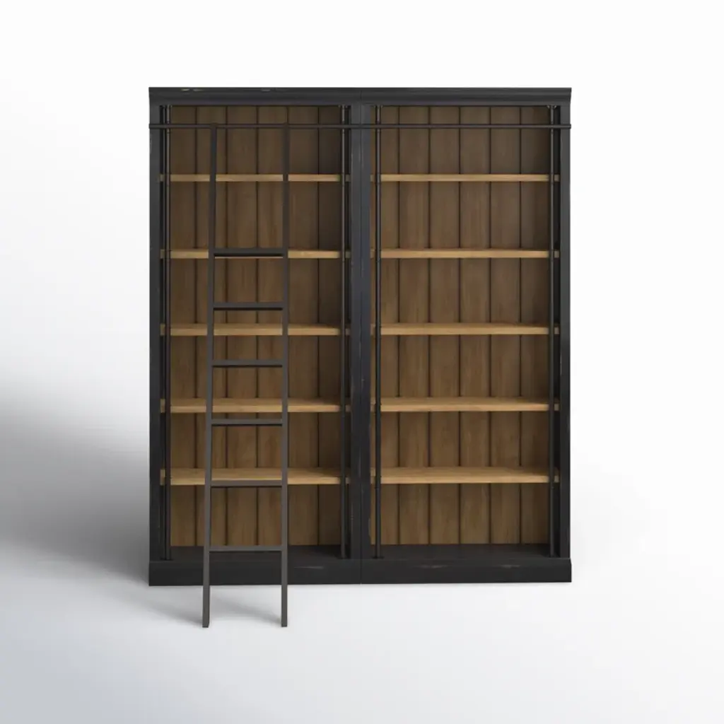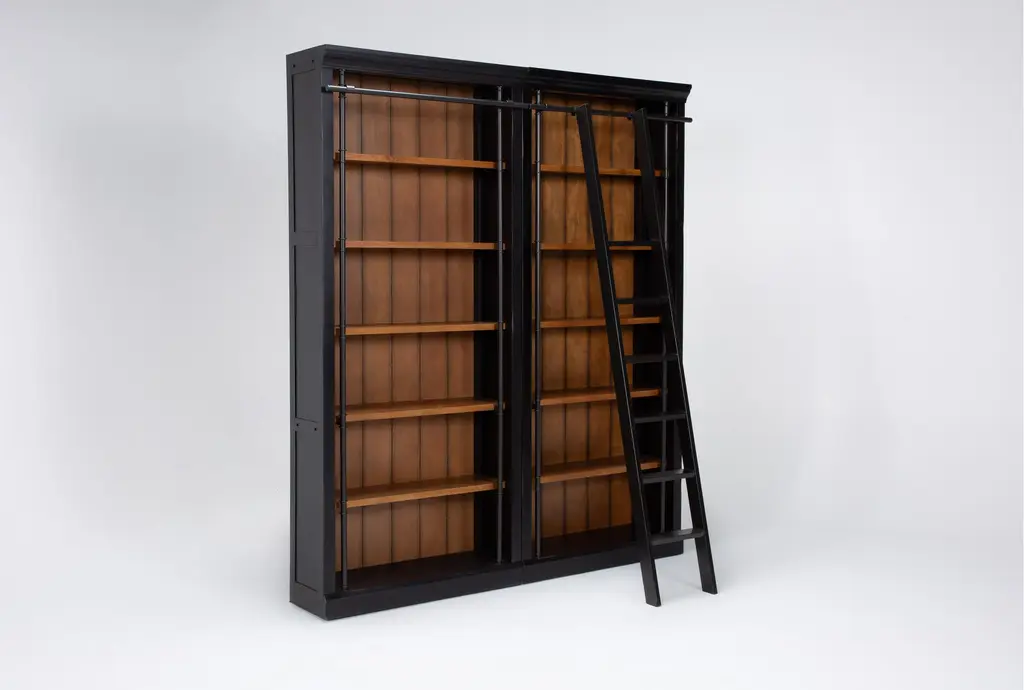 The Henri 94" Black + Natural Bunching Bookcase 3 Piece Library Wall & Ladder is a stunning addition to any office or study. Its rustic style and aged ebony color create a timeless and classic look. This tall, freestanding bookcase offers ample storage space with its six shelves.