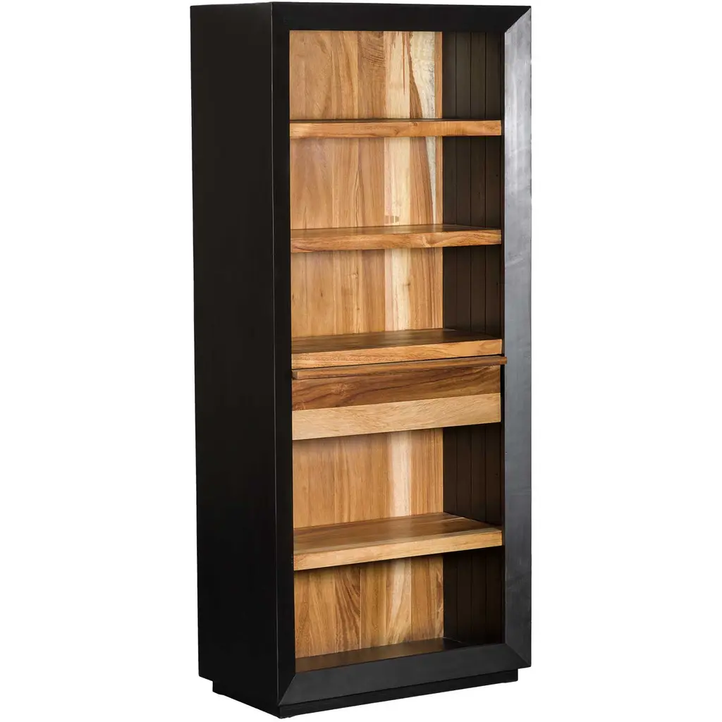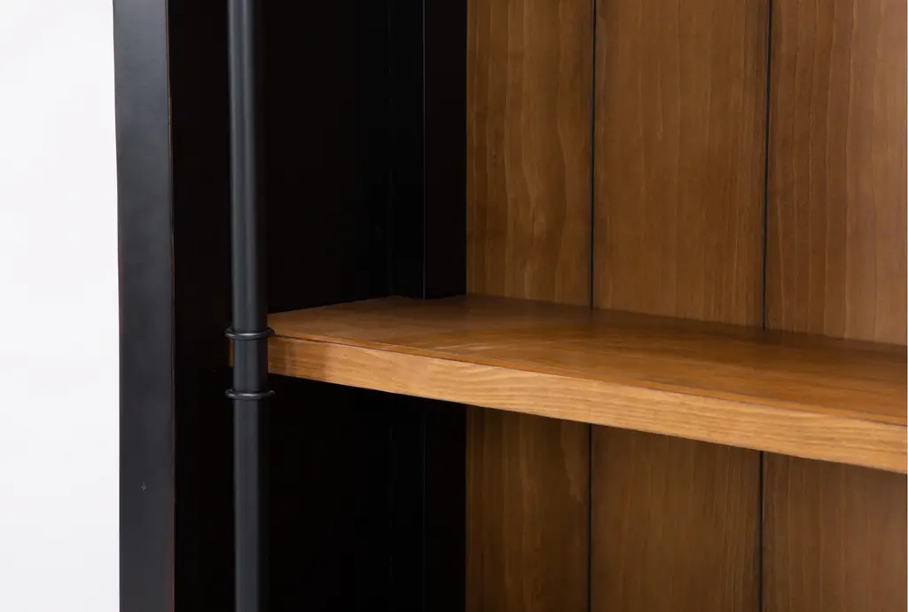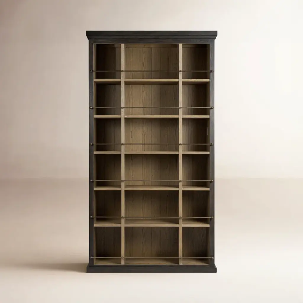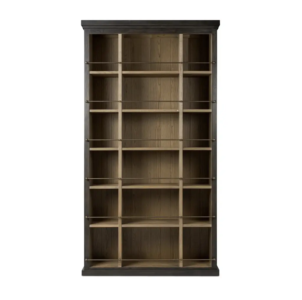 The Henri 94" Black + Natural Bunching Bookcase 3 Piece Library Wall & Ladder is a stunning addition to any office or study. Its rustic style and aged ebony color create a timeless and classic look. This tall, freestanding bookcase offers ample storage space with its six shelves.