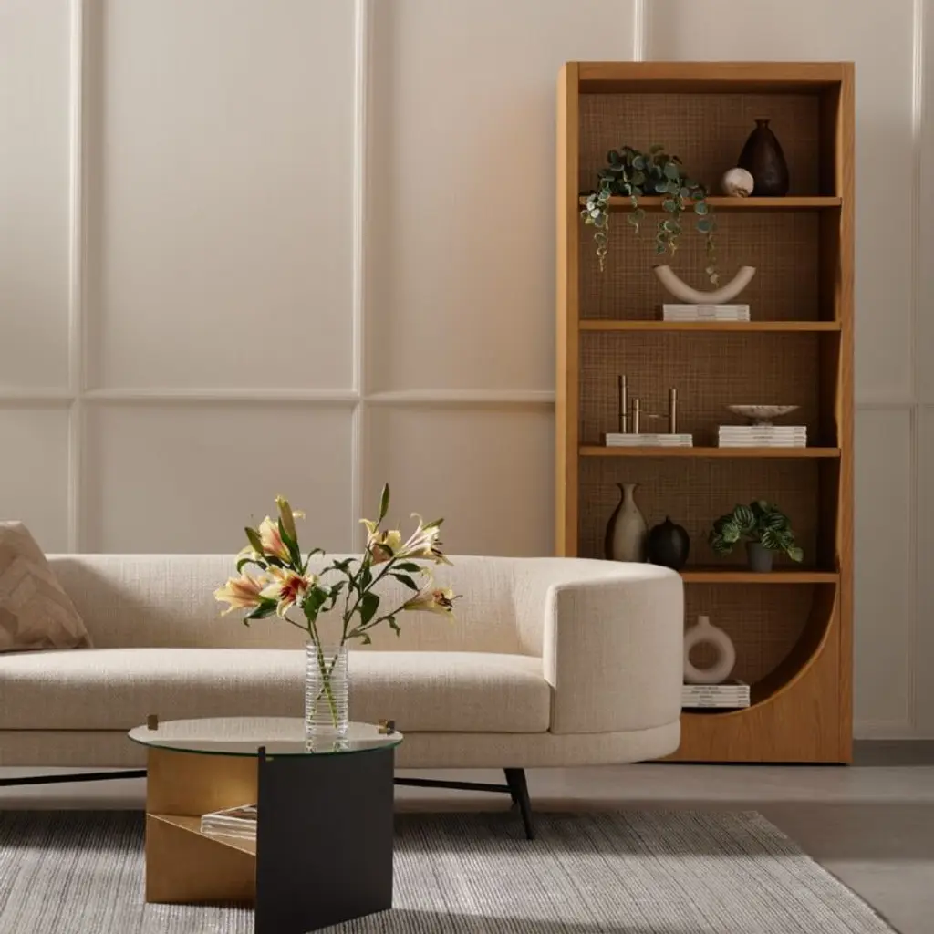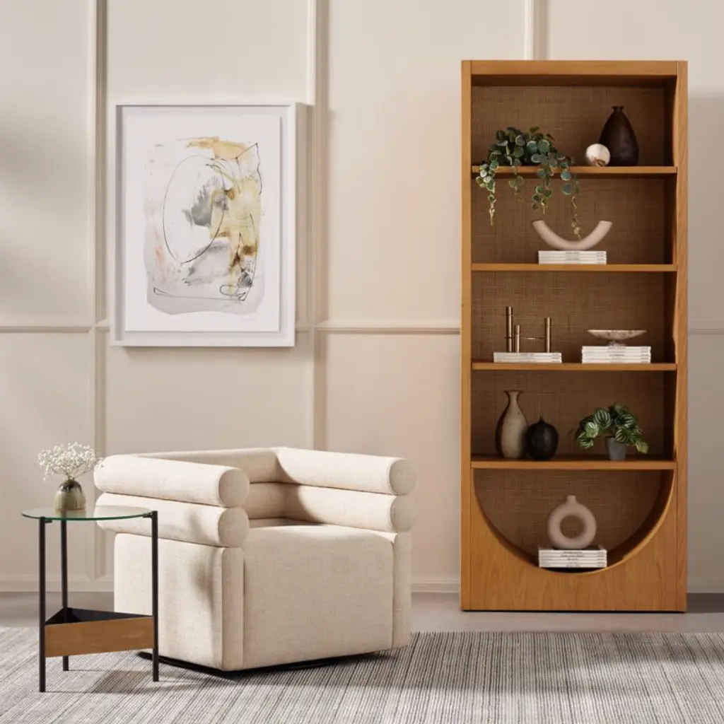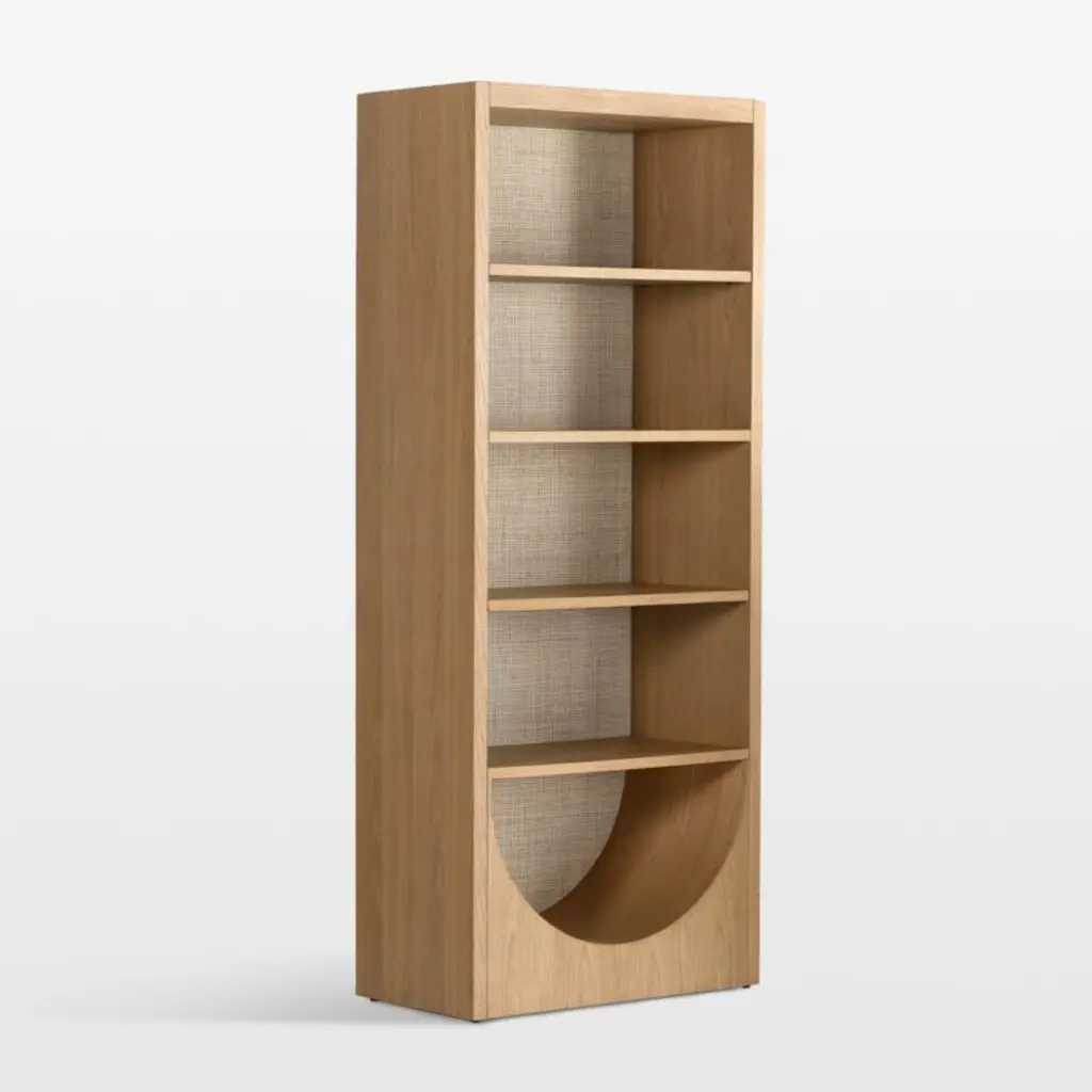 Our Higgins bookcase upends tradition, playing topsy turvy with its decorative arch in a 1970s-inspired design. Featuring two fixed and two adjustable shelves, the solid oak and oak veneer bookcase bottoms out with a rounded niche to leave empty for sculptural effect or fill with inspired displays. Handwoven cane paneling on the back complements the honey-finished wood with natural color and texture.