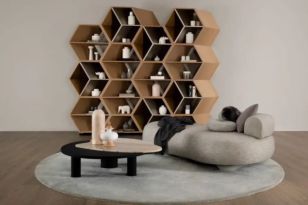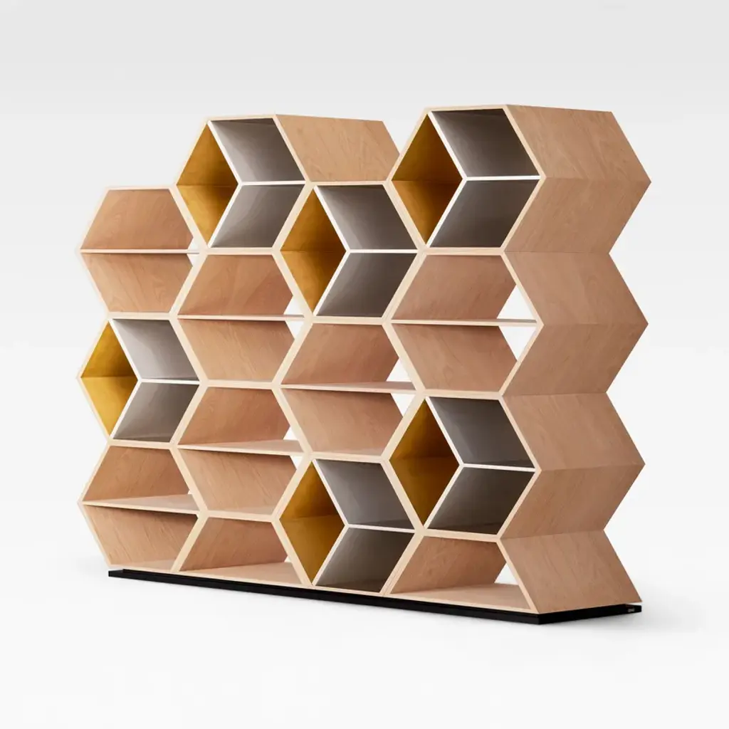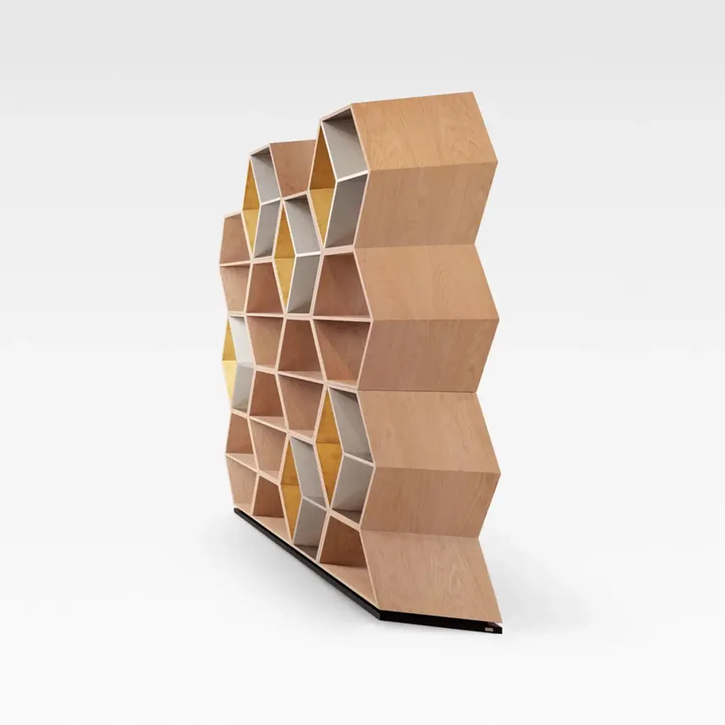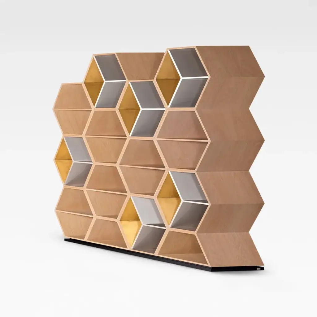 Hobart is a bookcase. The world changes when we change our perspective. In this sense, Hobart was born to mimic the natural, changing movement of any kind of life. Hobart is a bookcase in American oak veneer with gold-coloured champagne and gold bronze powder lacquered shelves. The straight lines that form a three-dimensional hexagonal pattern in a wooden beehive celebrate community and leadership.Materials & FinishesFI007 Black lacquer; satin finishFI073 Champagne bronze powder; high-gloss finishFI126 Gold bronze powder with a patina effect; satin finishWD027 American oak; open-pore natural colour; matt finish