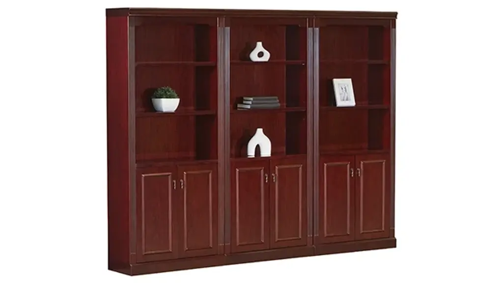Townhall collection is a wonderful mix of traditional look with modern amenities. Built with hardwoods and select walnut veneers the Townhall collection is stained to a beautiful Royal Cherry finish. 3 pc. bookcase wall unit has 3 door units. Ships ready for easy assembly.