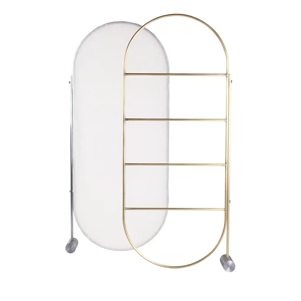 Minimalist style and refined elegance exquisitely blend in this gorgeous bookcase, comprised of two separate shelves arranged in a clean set. Handcrafted of metal, it is finished in a gold shade that completes the piece. Sizes refer to a single shelf, please inquire with the Concierge for further information and customization options.