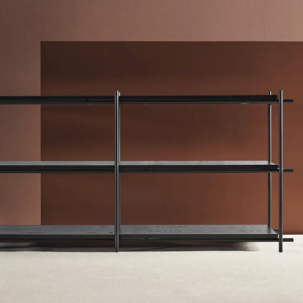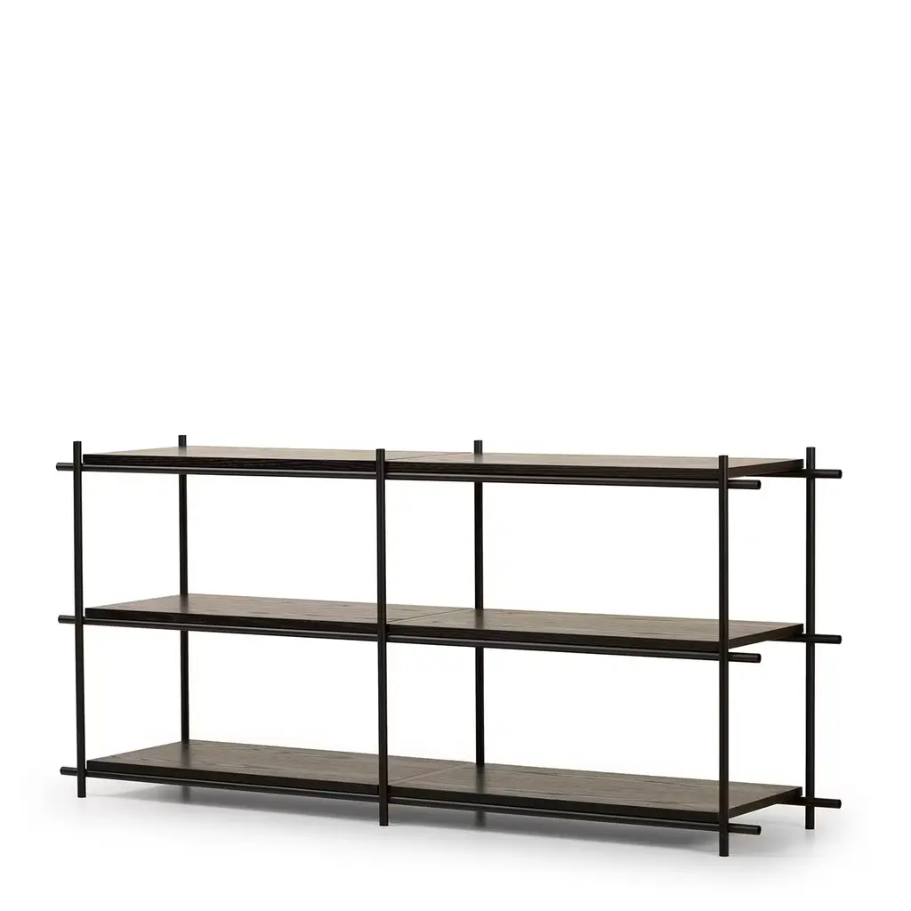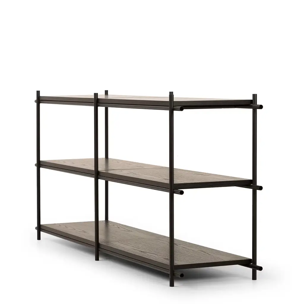Inspired by industrial shelving, this bookcase is part of the Innocent modular system whose single rectangular unit is composed of two black-painted oak wood shelves joined by black iron pipes. The modules can be stacked in customizable shapes to create small tables, bookshelves with different heights, and consoles. In this version, the four units are arranged on two, and the junctions fulfill a structural and decorative function.