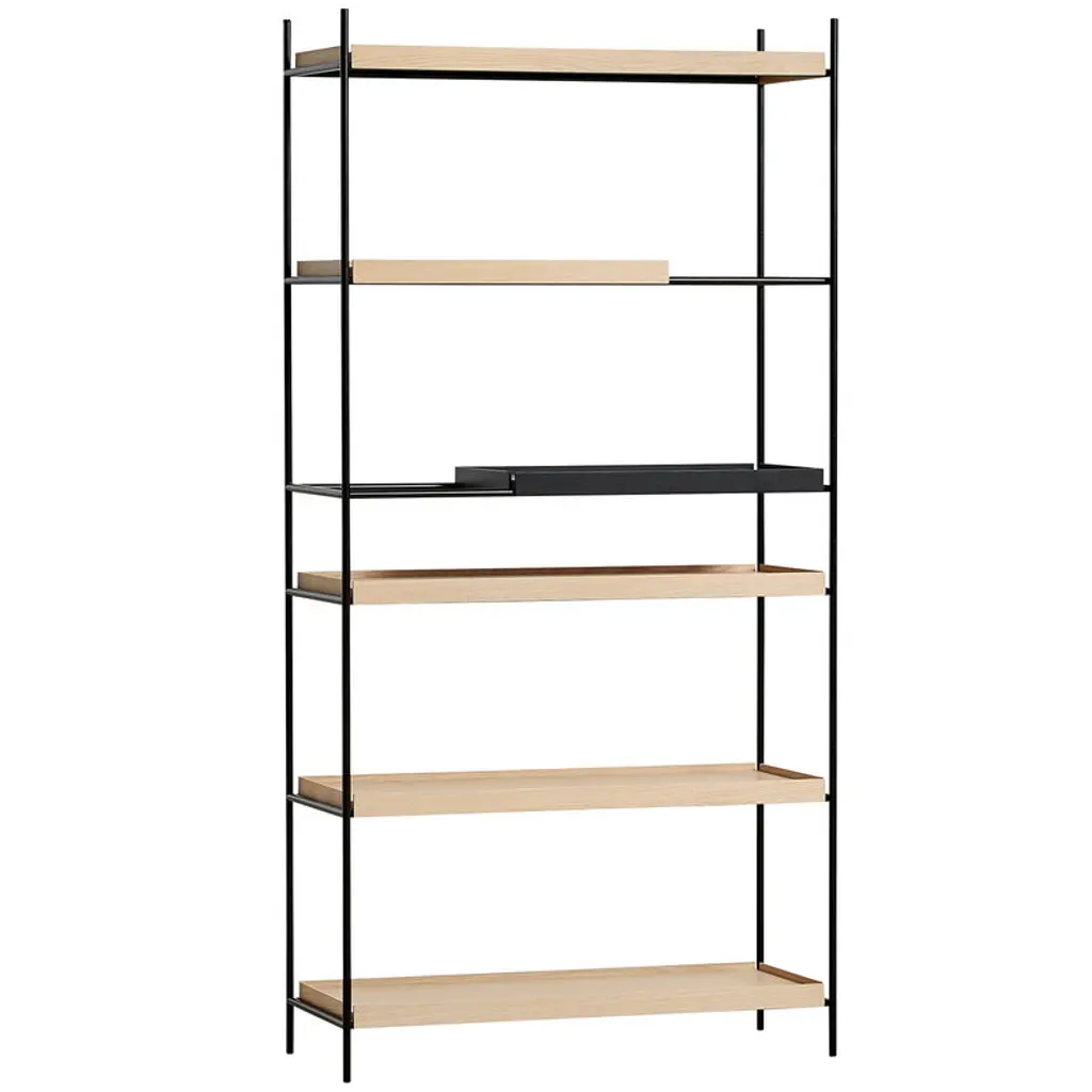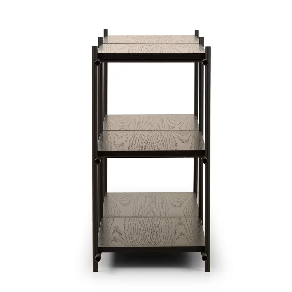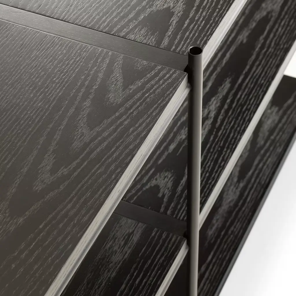 Inspired by industrial shelving, this bookcase is part of the Innocent modular system whose single rectangular unit is composed of two black-painted oak wood shelves joined by black iron pipes. The modules can be stacked in customizable shapes to create small tables, bookshelves with different heights, and consoles. In this version, the four units are arranged on two, and the junctions fulfill a structural and decorative function.
