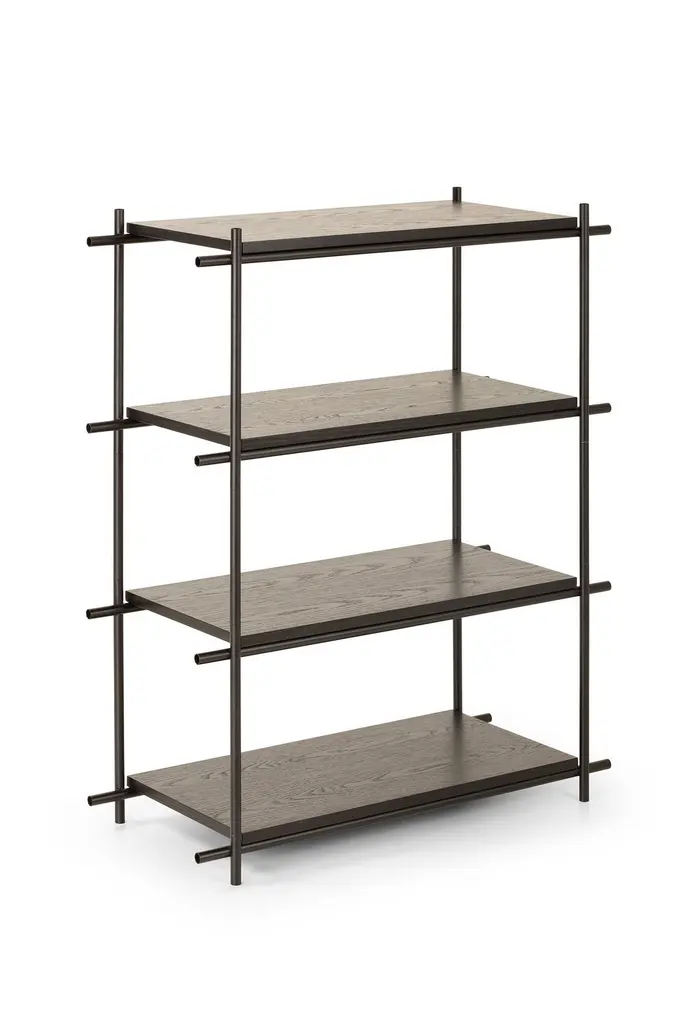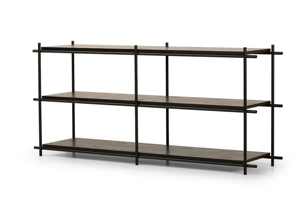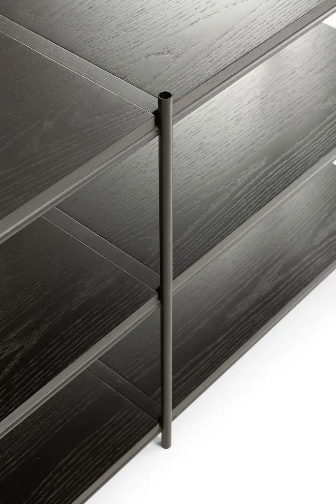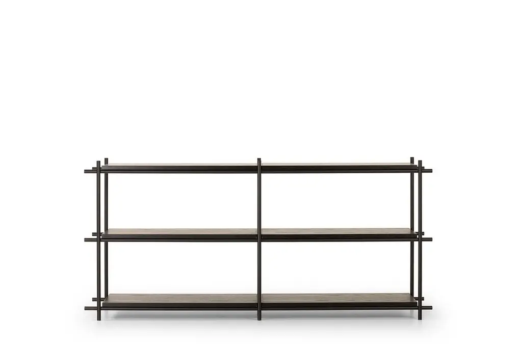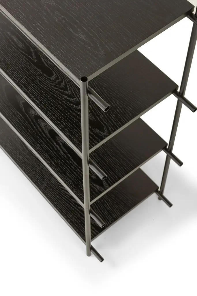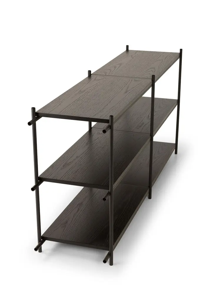 Innocent bookcase designed by Gio Tirotto for Mingardo. The Innocent project is motivated by the Industrial methods of metal joints and pipes and highlights the relationship between the purity of shapes and Mingardo’s craftsmanship perfection. The Innocent modular system consists of shelving tops in black painted oak, attached by a tubular black-colored structure. The system permits you to create different furnishing elements, from low tables to consoles to bookcases of various heights. Available options:RAL 9005 black varnished iron structure with shelf in black stained oak-INN 001 - L90 W39 H43 - $660 (Single Module)-INN 002 - L90 W39 H110 - $1,320-INN 003 - L166 W39 H76 - $2,160.