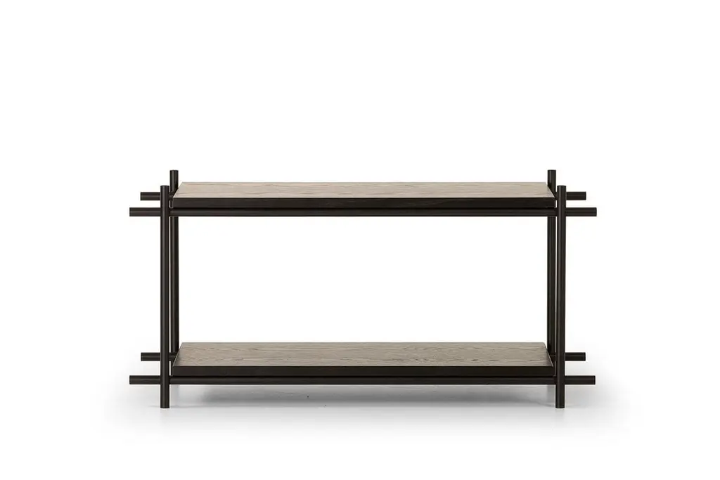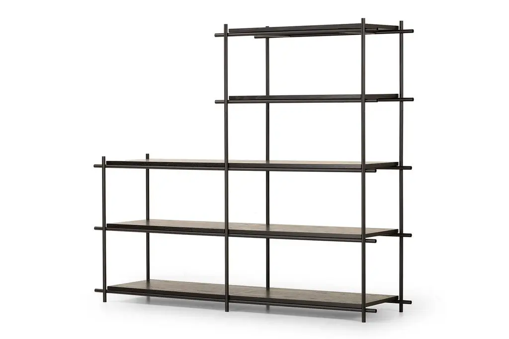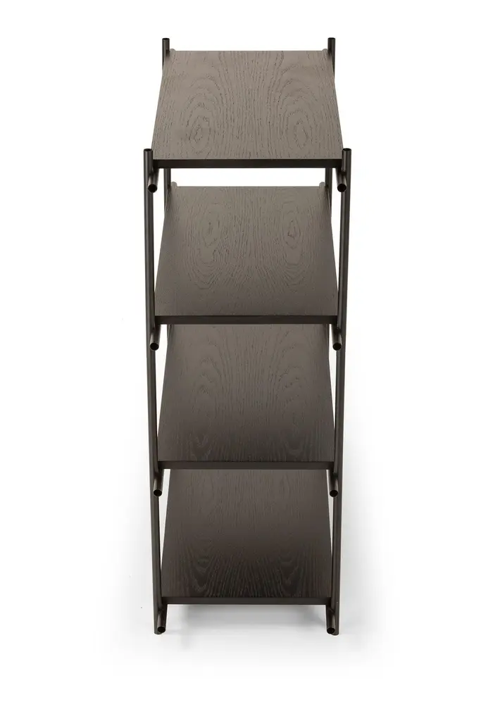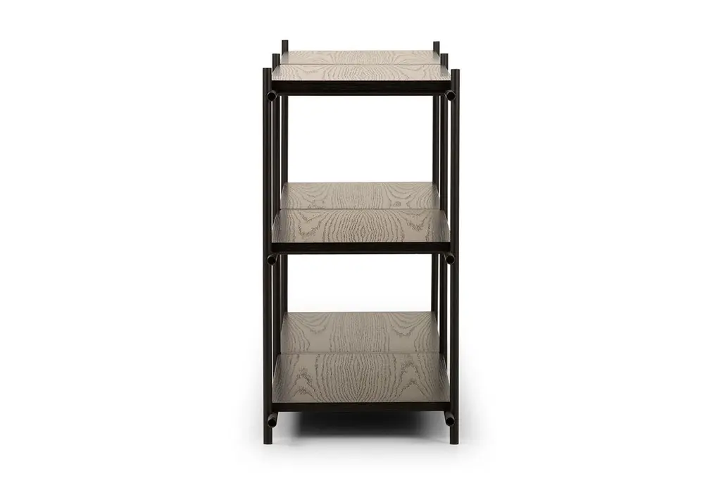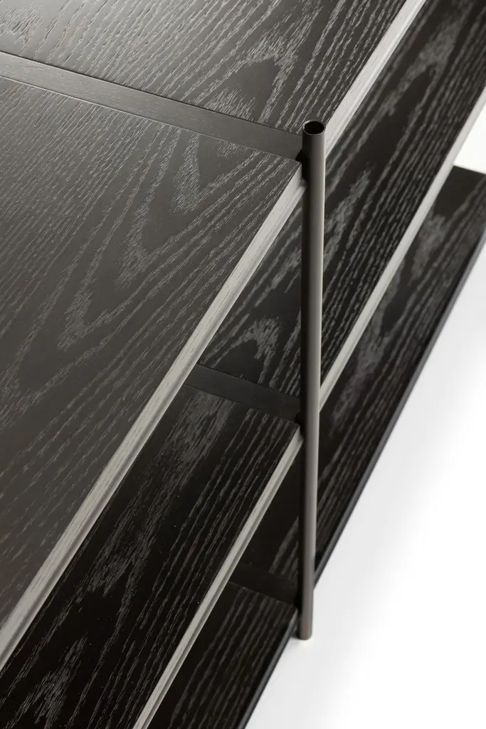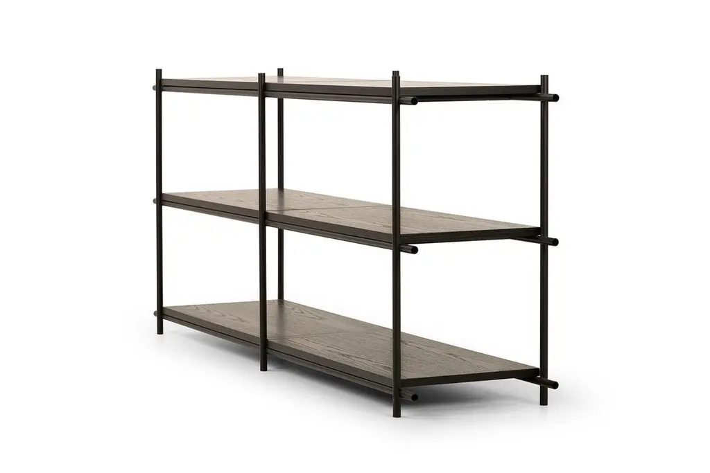 Innocent bookcase designed by Gio Tirotto for Mingardo. The Innocent project is motivated by the Industrial methods of metal joints and pipes and highlights the relationship between the purity of shapes and Mingardo’s craftsmanship perfection. The Innocent modular system consists of shelving tops in black painted oak, attached by a tubular black-colored structure. The system permits you to create different furnishing elements, from low tables to consoles to bookcases of various heights. Available options:RAL 9005 black varnished iron structure with shelf in black stained oak-INN 001 - L90 W39 H43 - $660 (Single Module)-INN 002 - L90 W39 H110 - $1,320-INN 003 - L166 W39 H76 - $2,160.