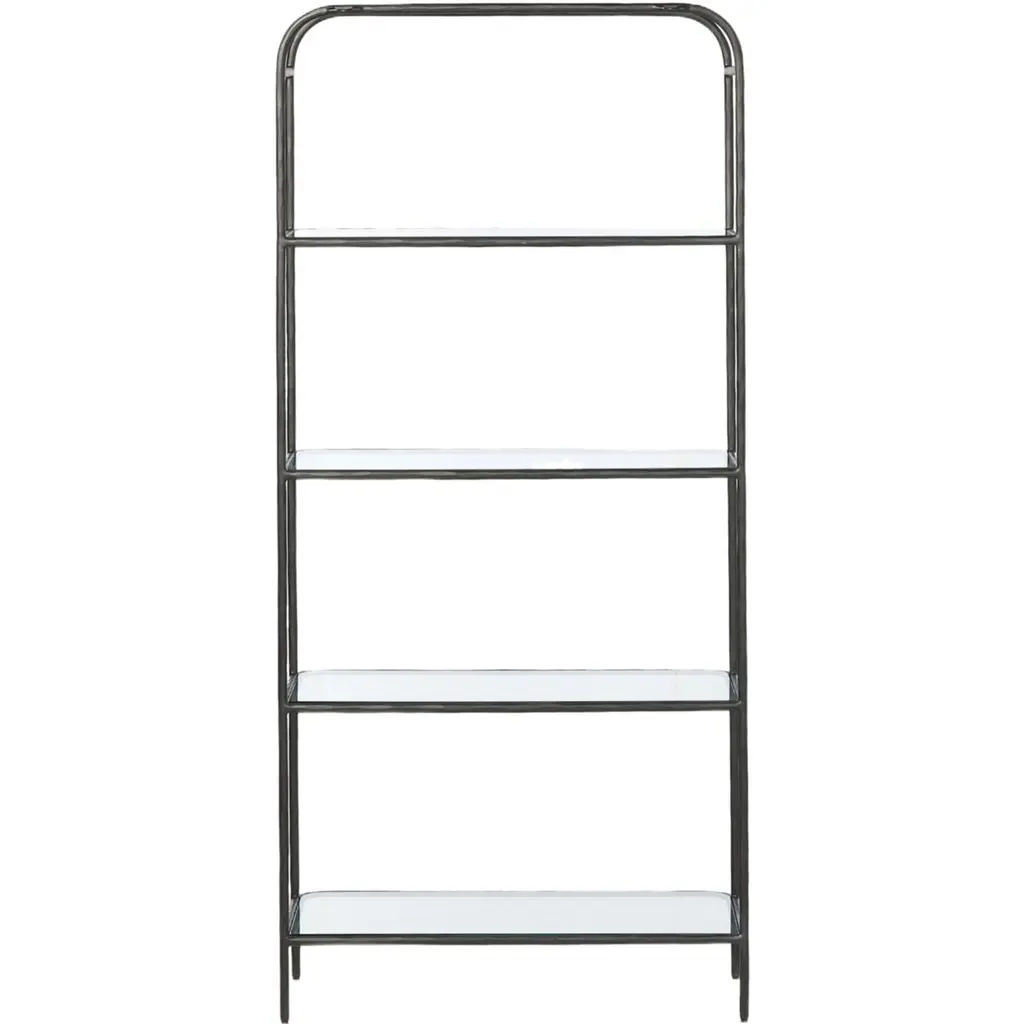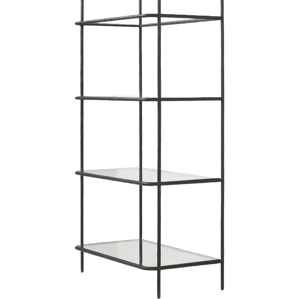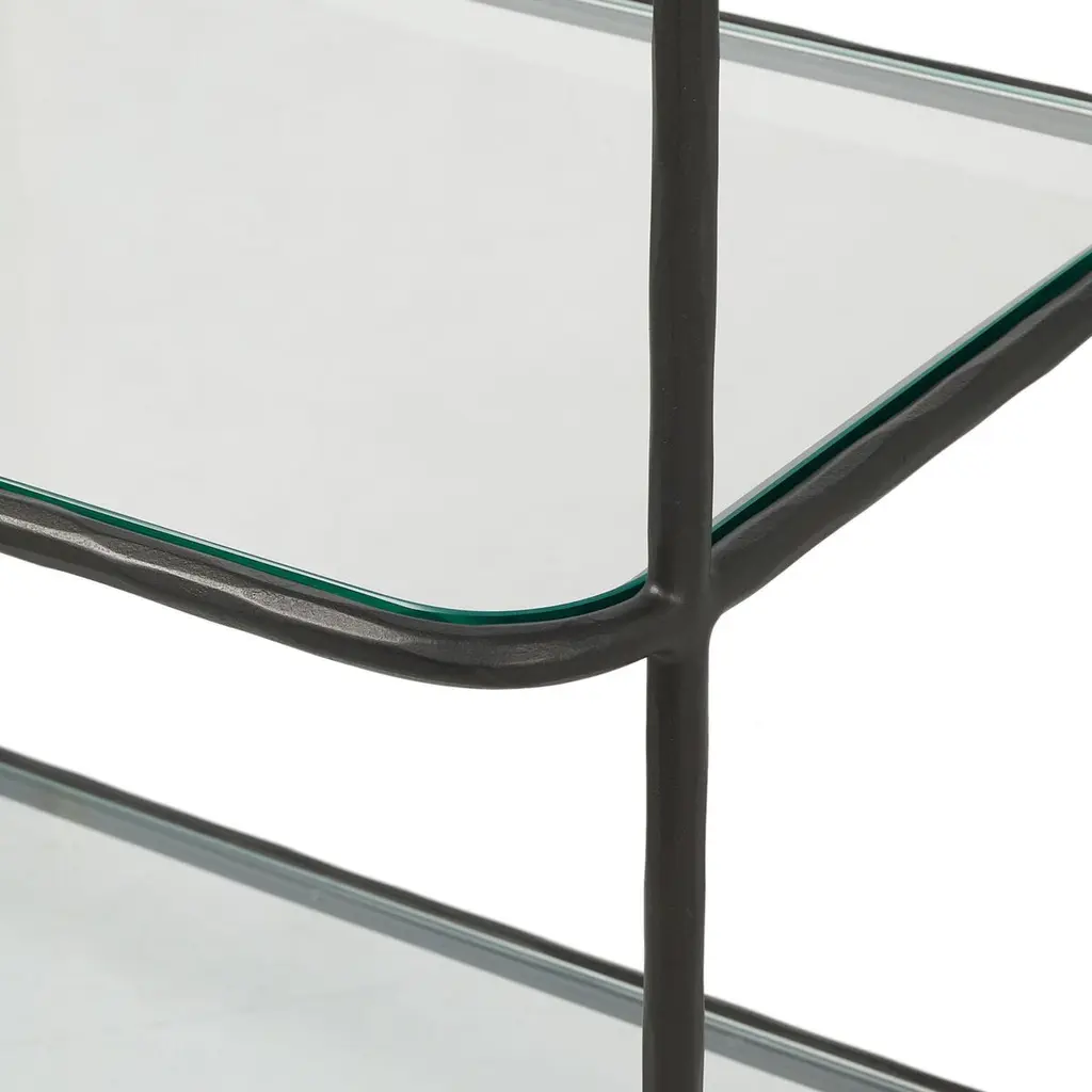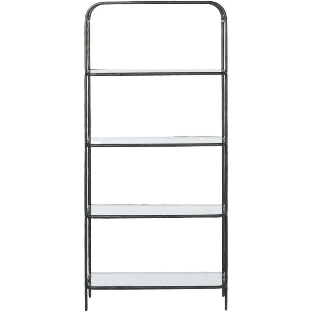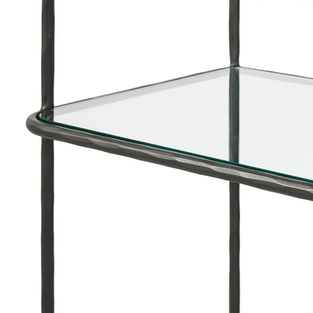 The Isaac Bookcase offers a transitional look with subtle vintage vibes, featuring iron frames with a hammered finish and tempered glass shelving. Its design includes elegantly curved corners, making it a sophisticated addition to any space.