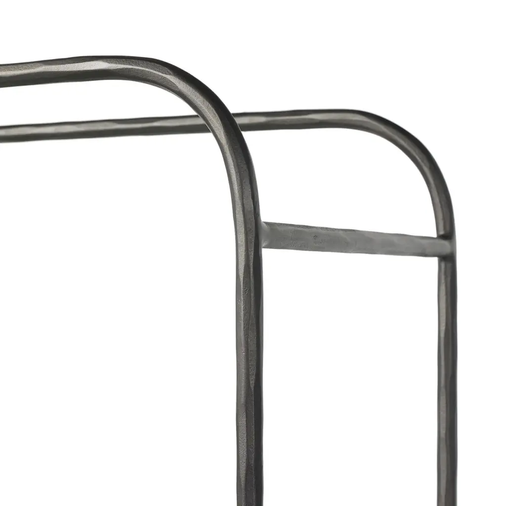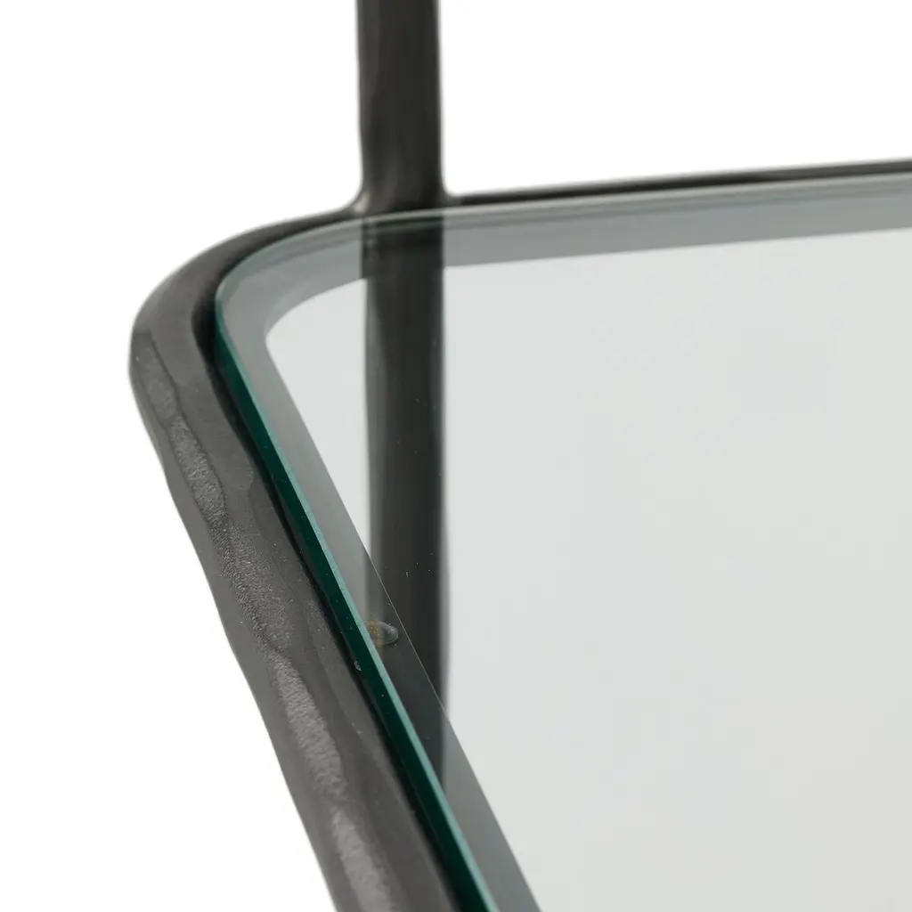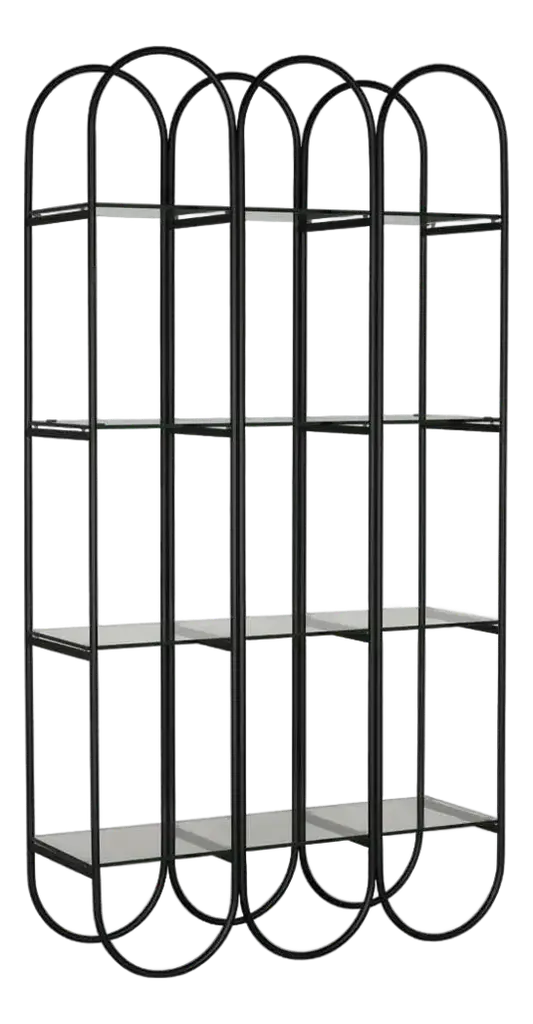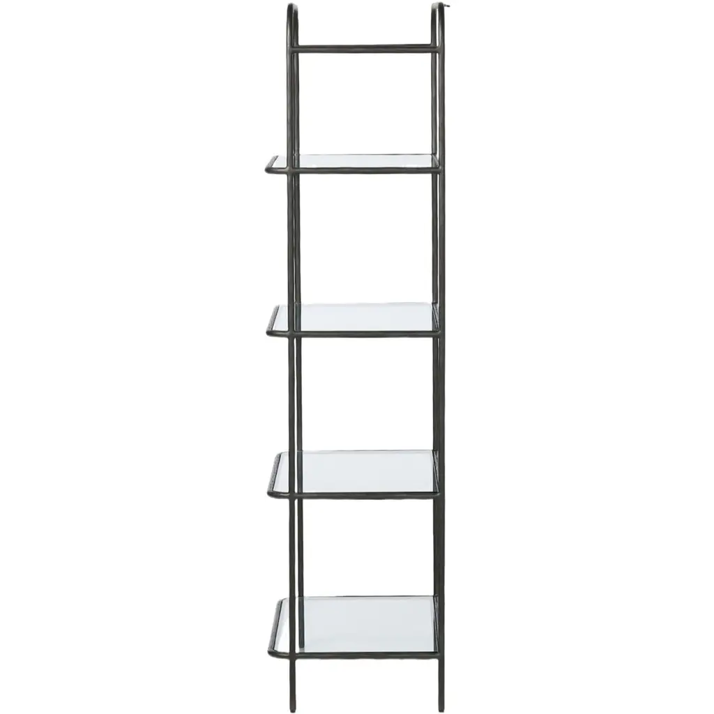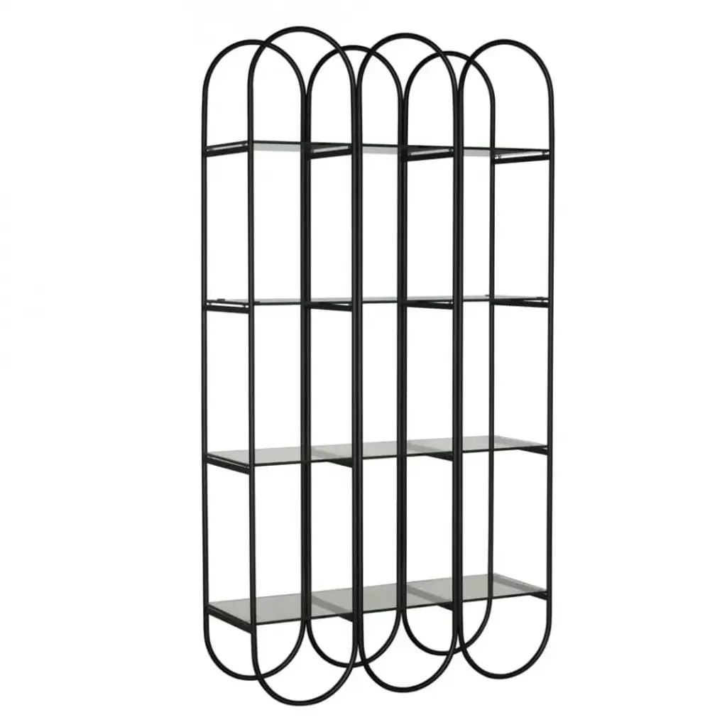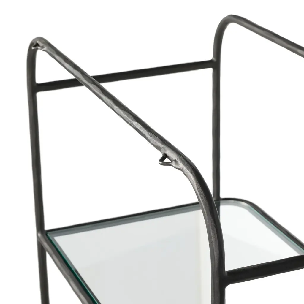 The Isaac Bookcase offers a transitional look with subtle vintage vibes, featuring iron frames with a hammered finish and tempered glass shelving. Its design includes elegantly curved corners, making it a sophisticated addition to any space.