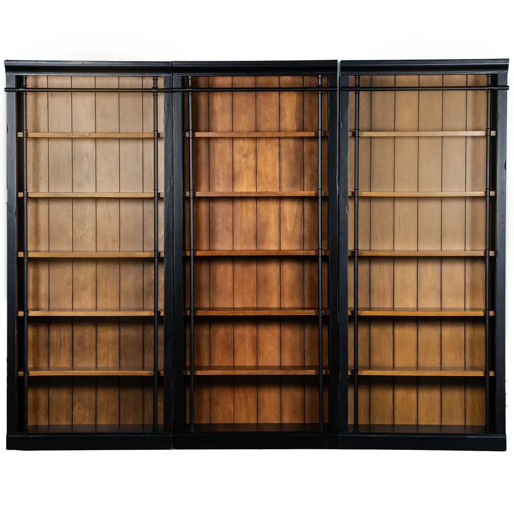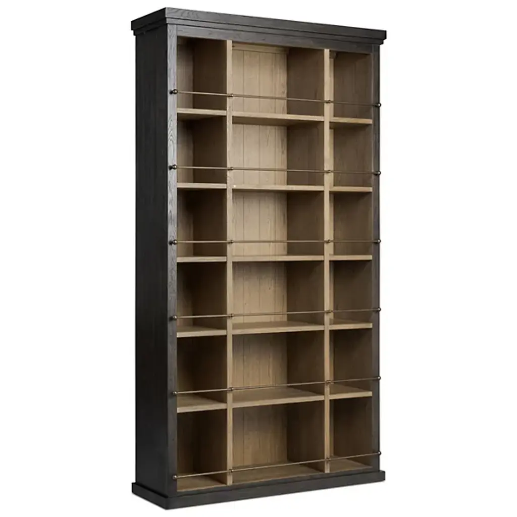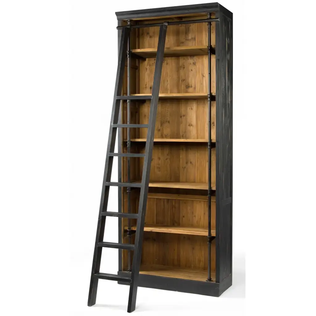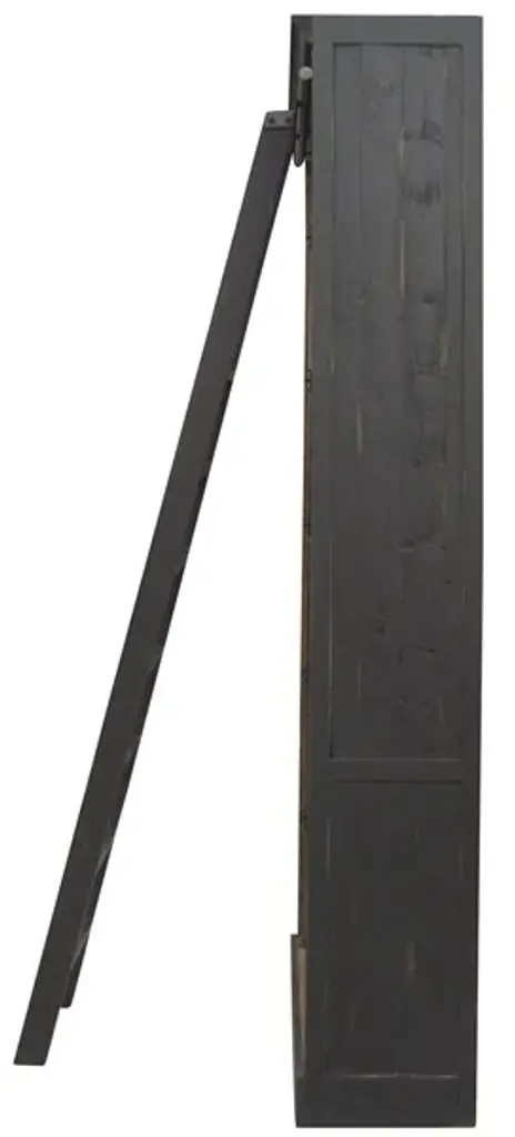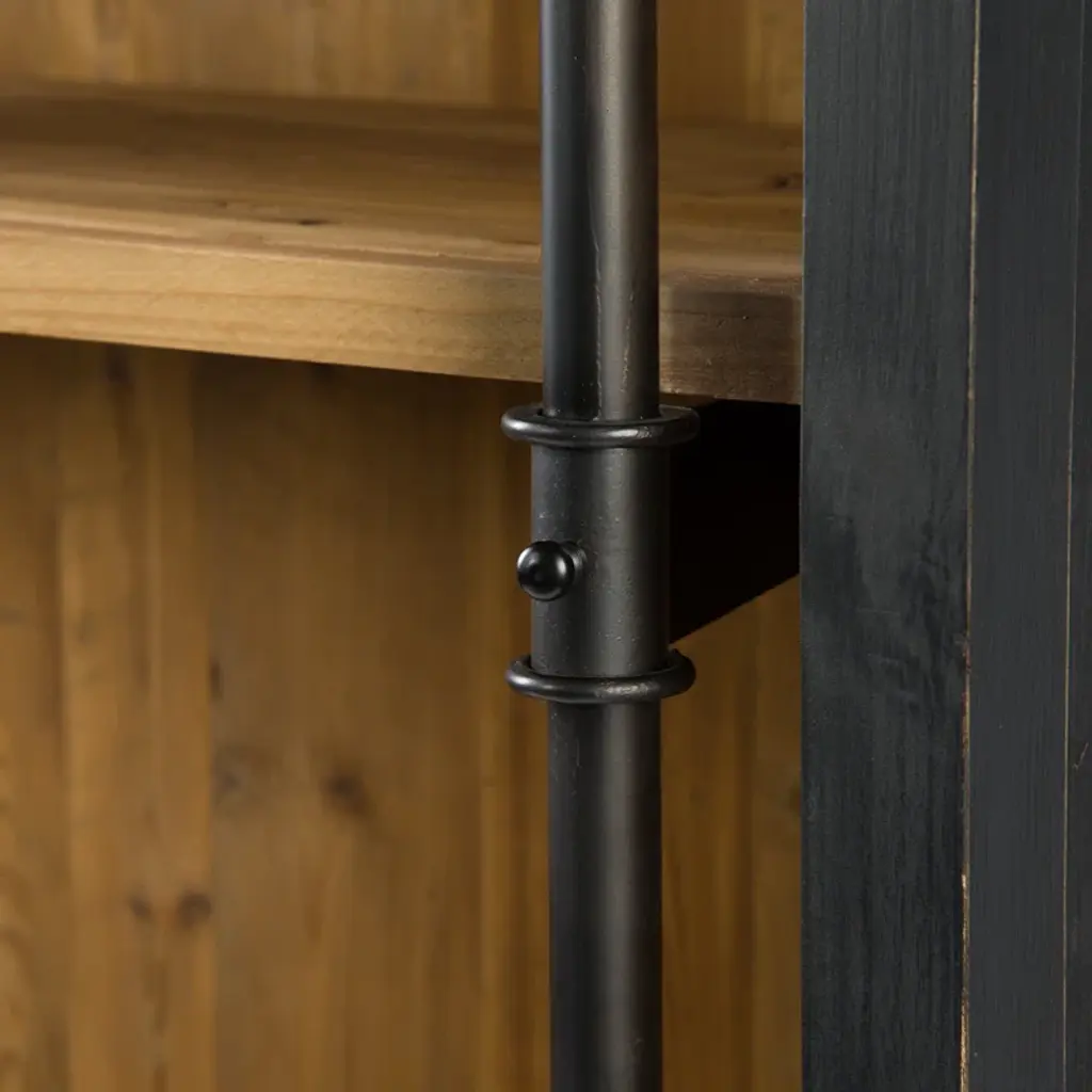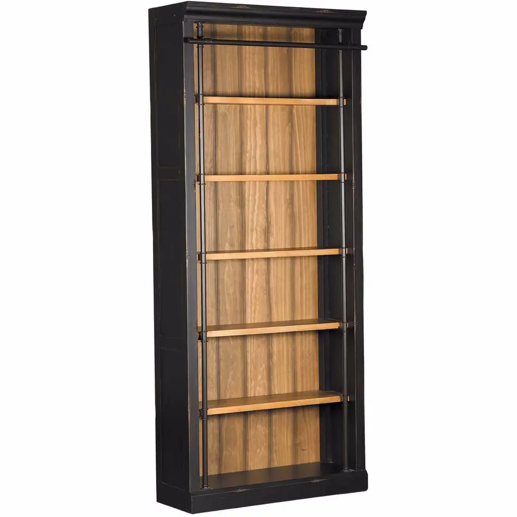 The exterior is finished in hand-rubbed black while interior shelves with unique iron supports reveal the natural beauty of reclaimed pine.