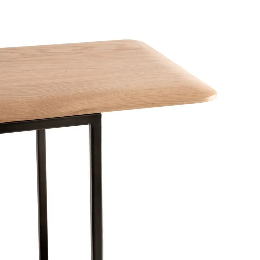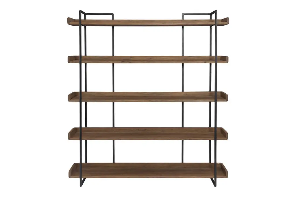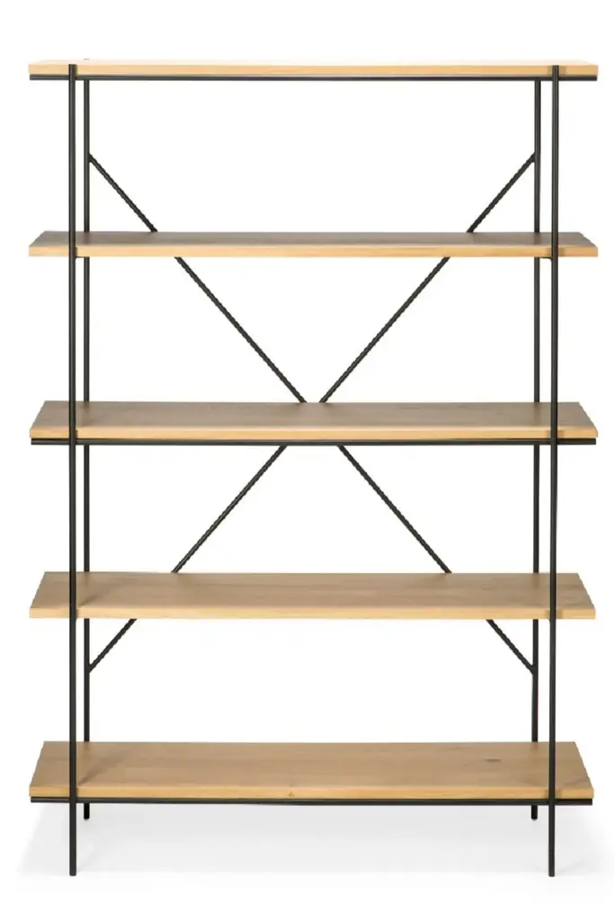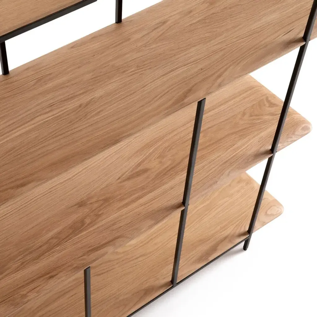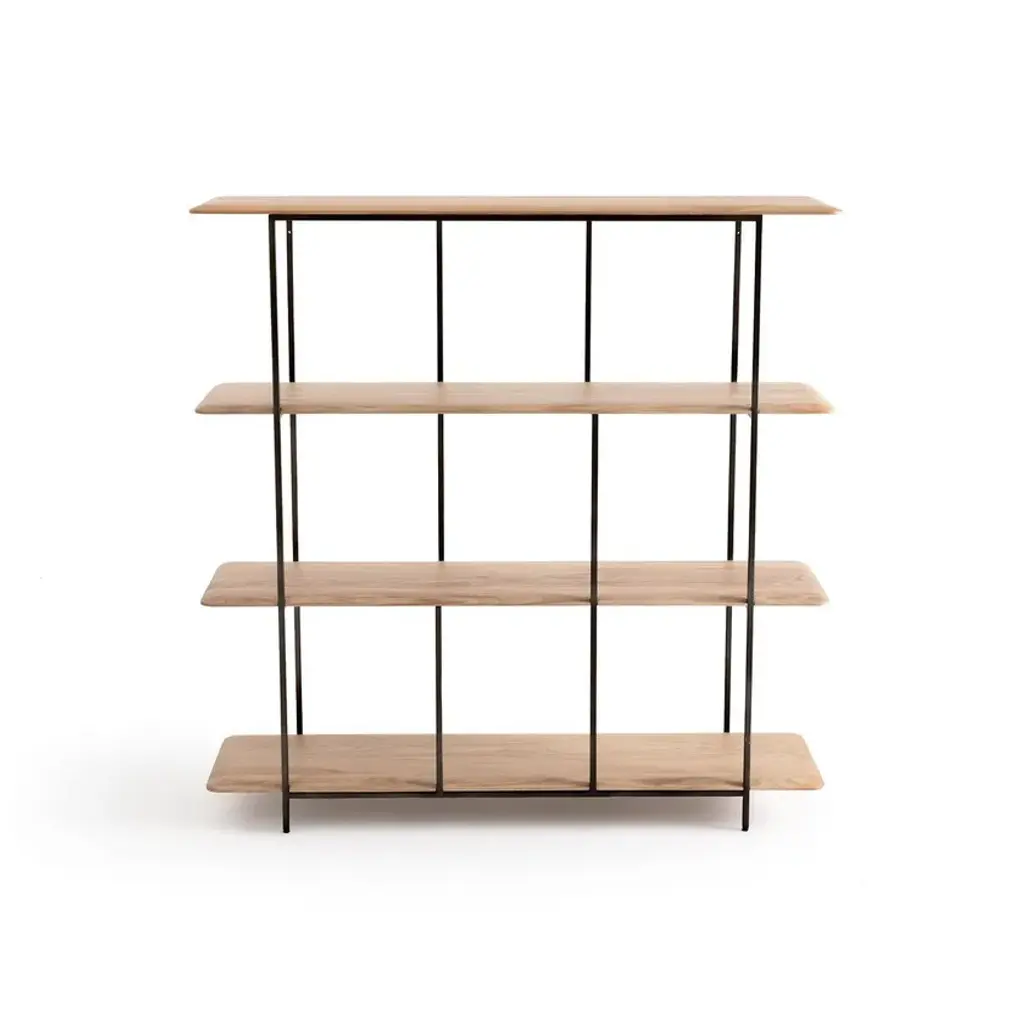 Light and graphic line for the Jacobson bookcase with slightly rounded shelves in the shape of an aeroplane wing.Used-effect epoxy-coated metal frame4 shelves in solid FSC* oak with polyurethane finishAeroplane wing-shaped shelvesMust be fixed to the wallAdjustable legs