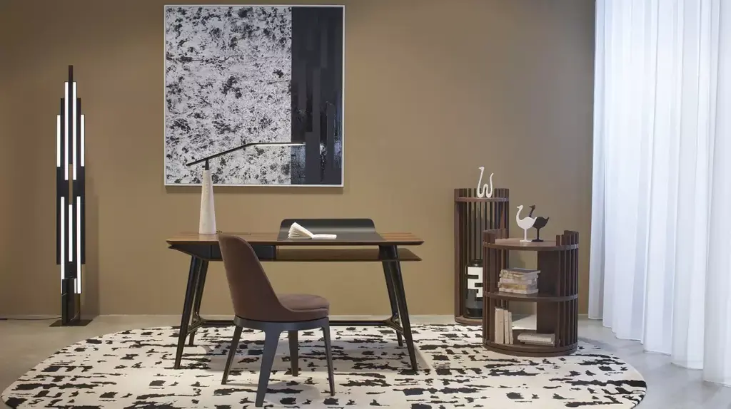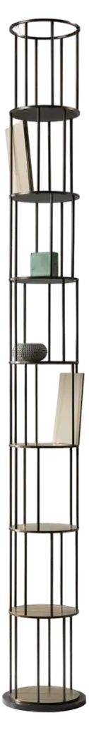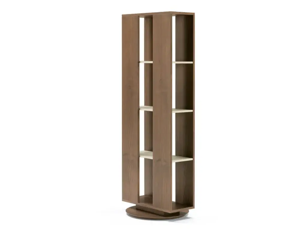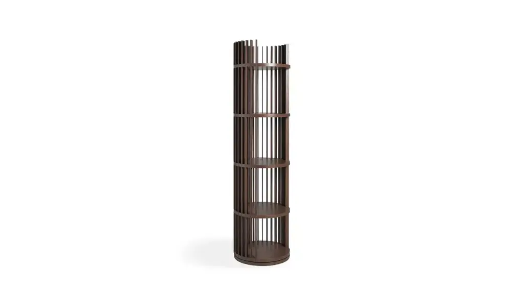 The Jalousie collection plays on the repetition of wood slats that develop in a rounded shape to create dynamic graphics and visual effects of light and gradients. Here, the rotating bookcase-column is edged on two thirds of its length, leaving the third open.