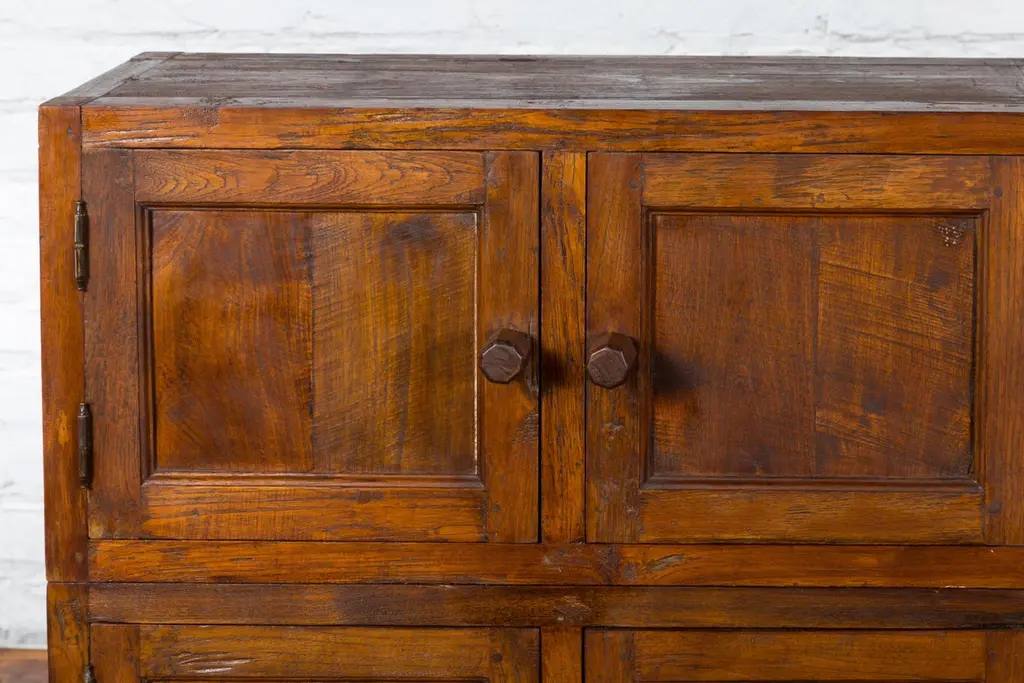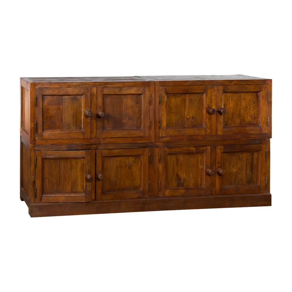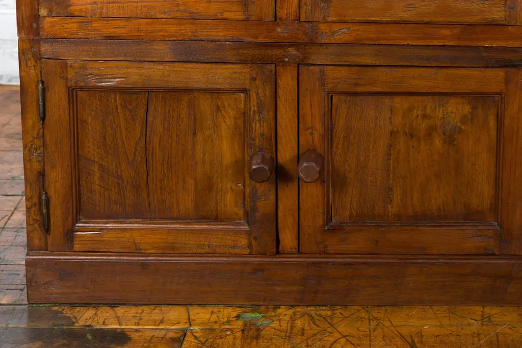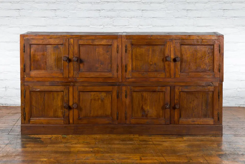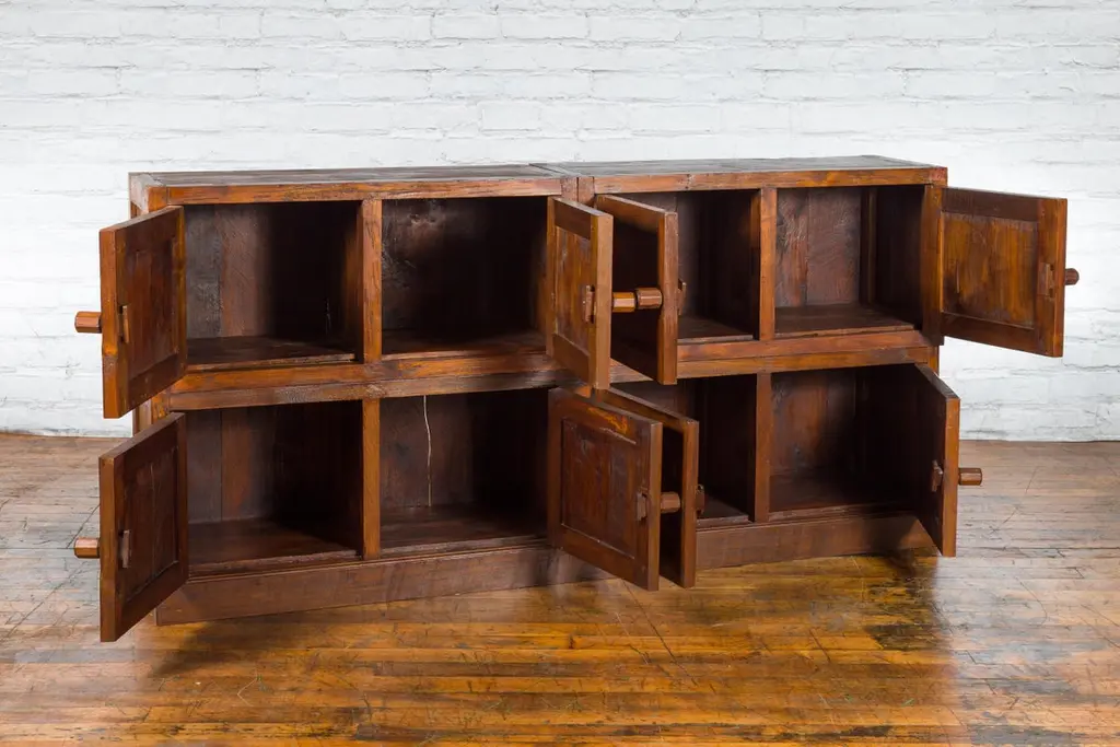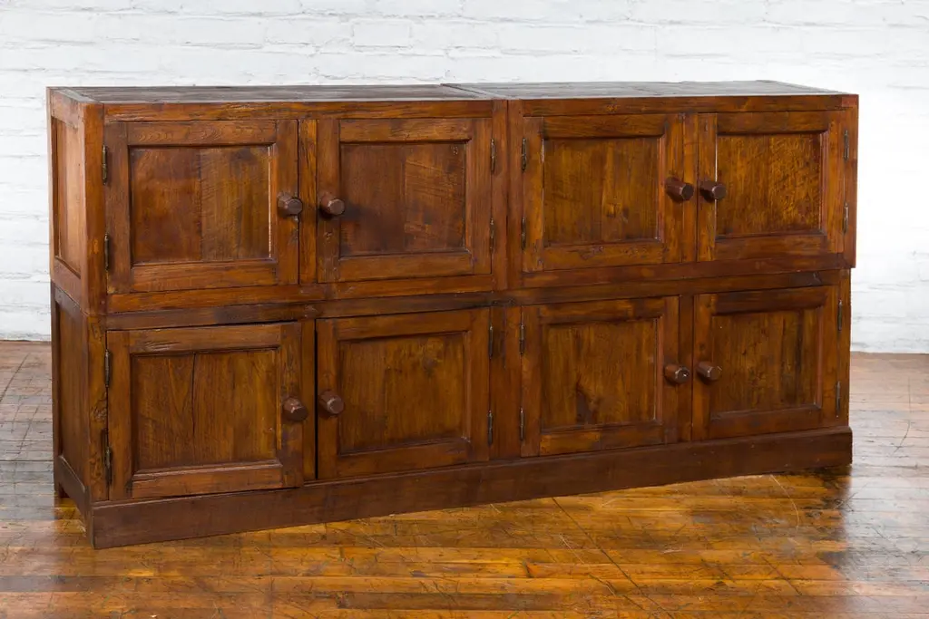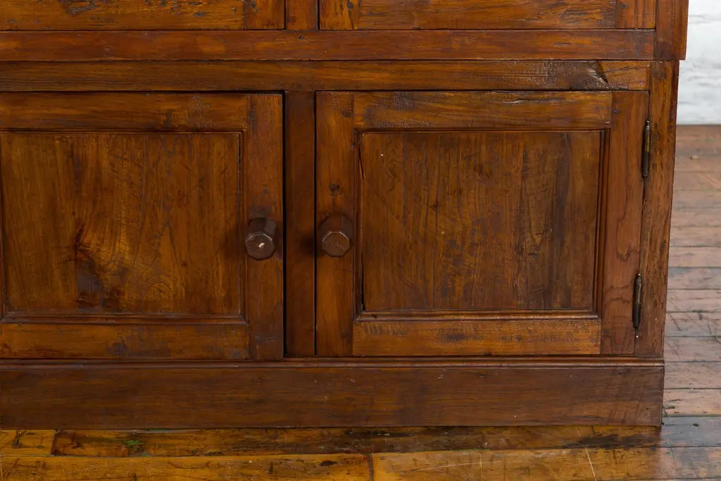 A Javanese vintage brown lacquer bookcase from the late 20th century, with eight doors. Made of three different compartments (two small ones over a larger one), this Javanese bookcase features eight wooden doors adorned with recessed panels and wooden pulls, opening to reveal a convenient storage space. Boasting a brown lacquer, this vintage Javanese bookcase will make for a great addition to any living room or study!