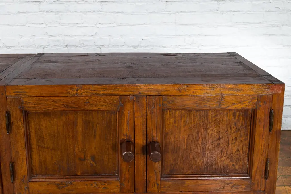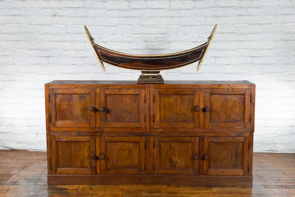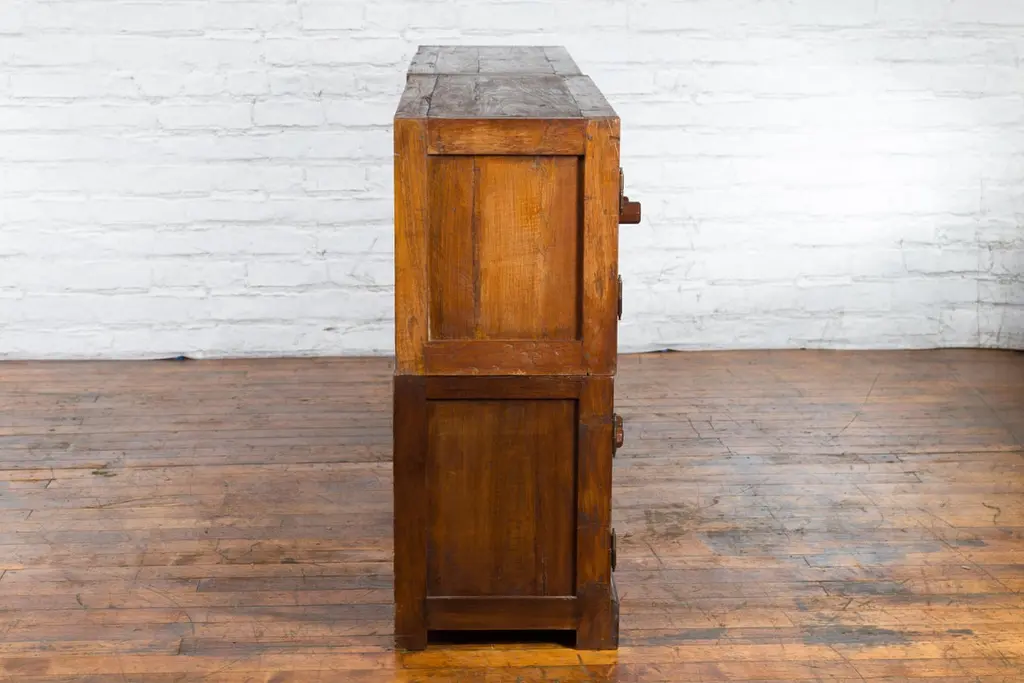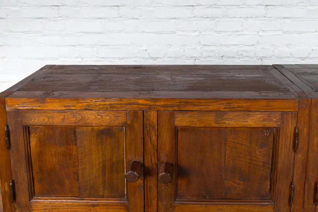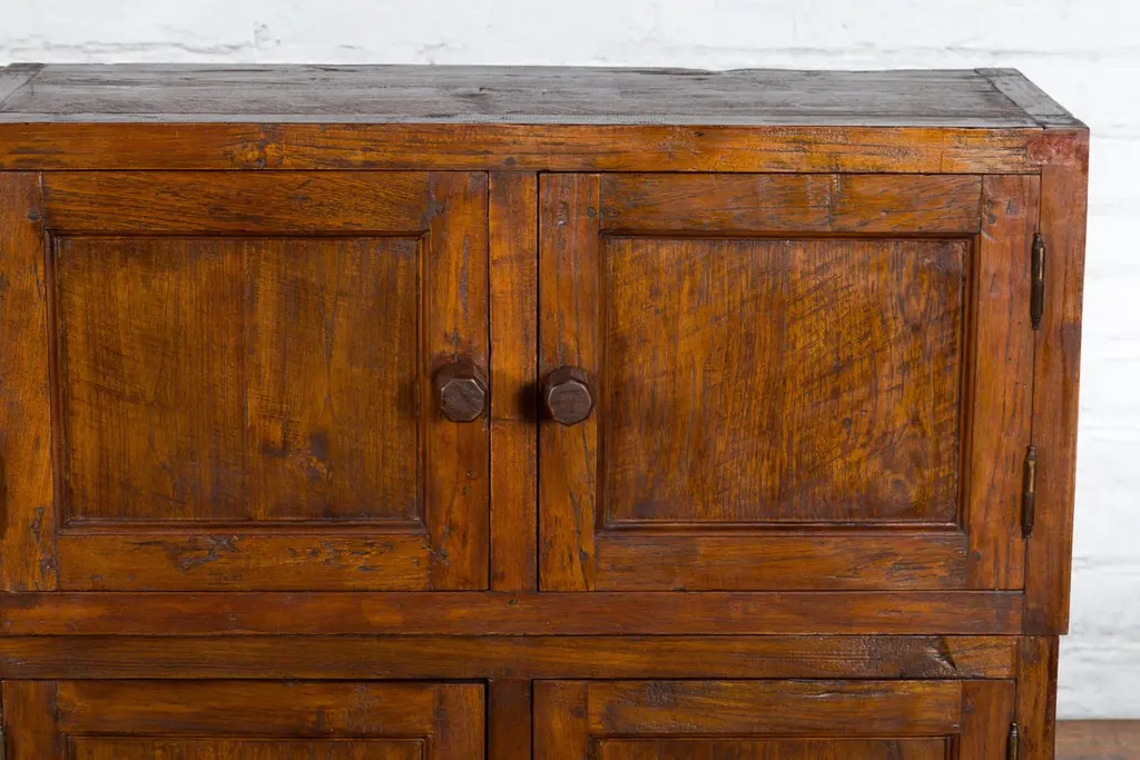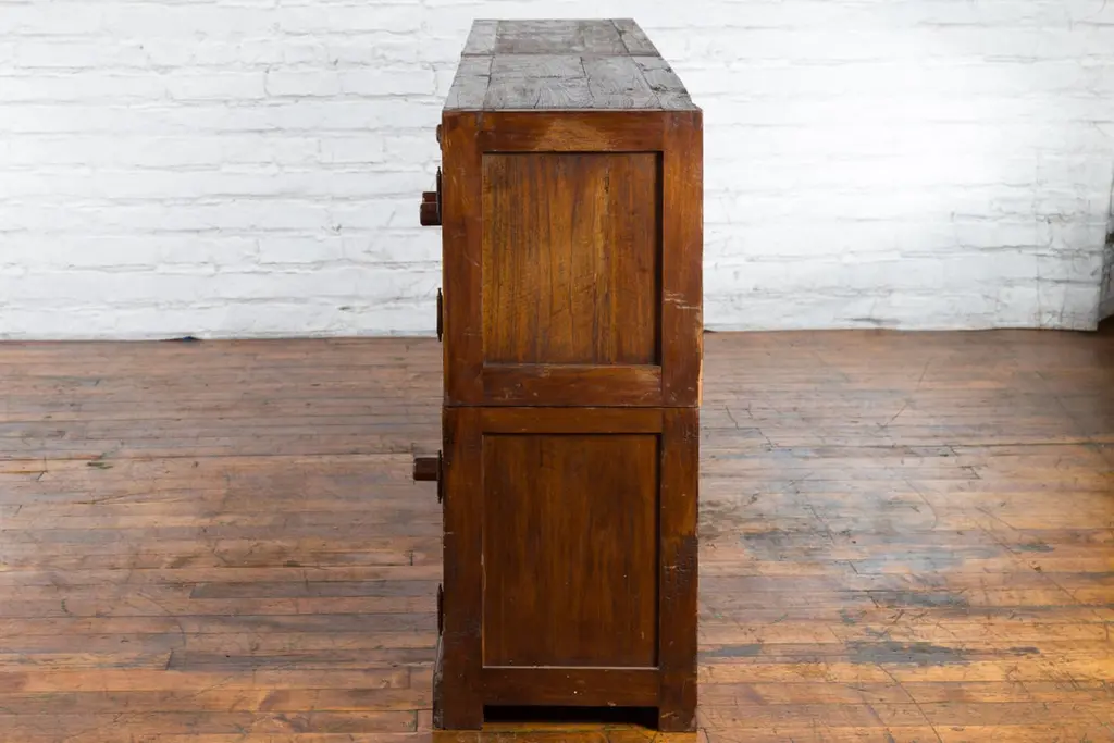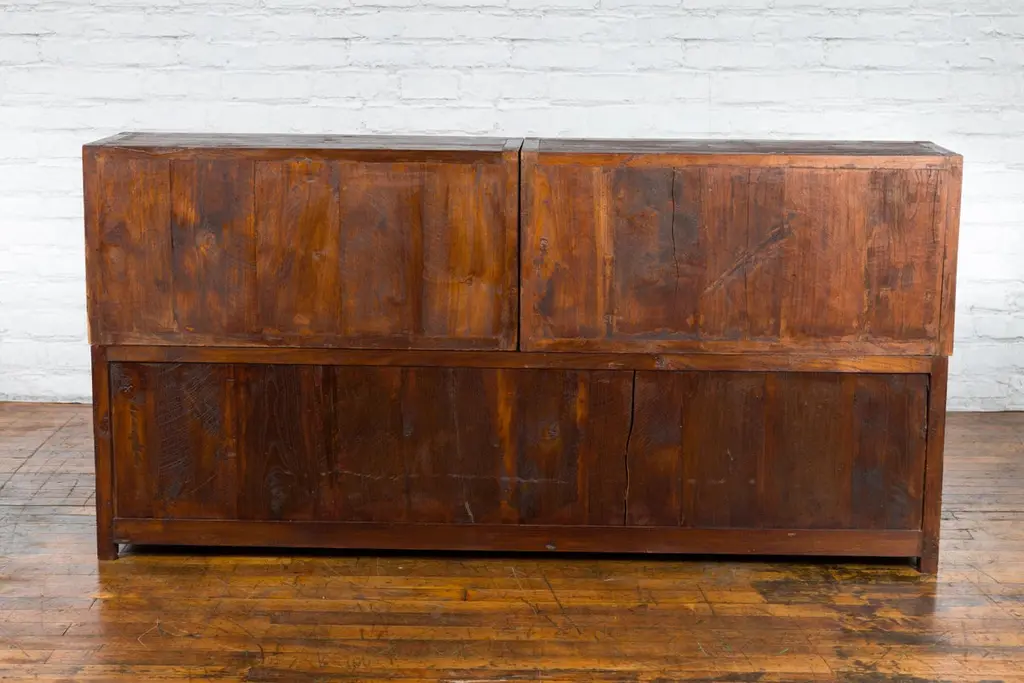 A Javanese vintage brown lacquer bookcase from the late 20th century, with eight doors. Made of three different compartments (two small ones over a larger one), this Javanese bookcase features eight wooden doors adorned with recessed panels and wooden pulls, opening to reveal a convenient storage space. Boasting a brown lacquer, this vintage Javanese bookcase will make for a great addition to any living room or study!