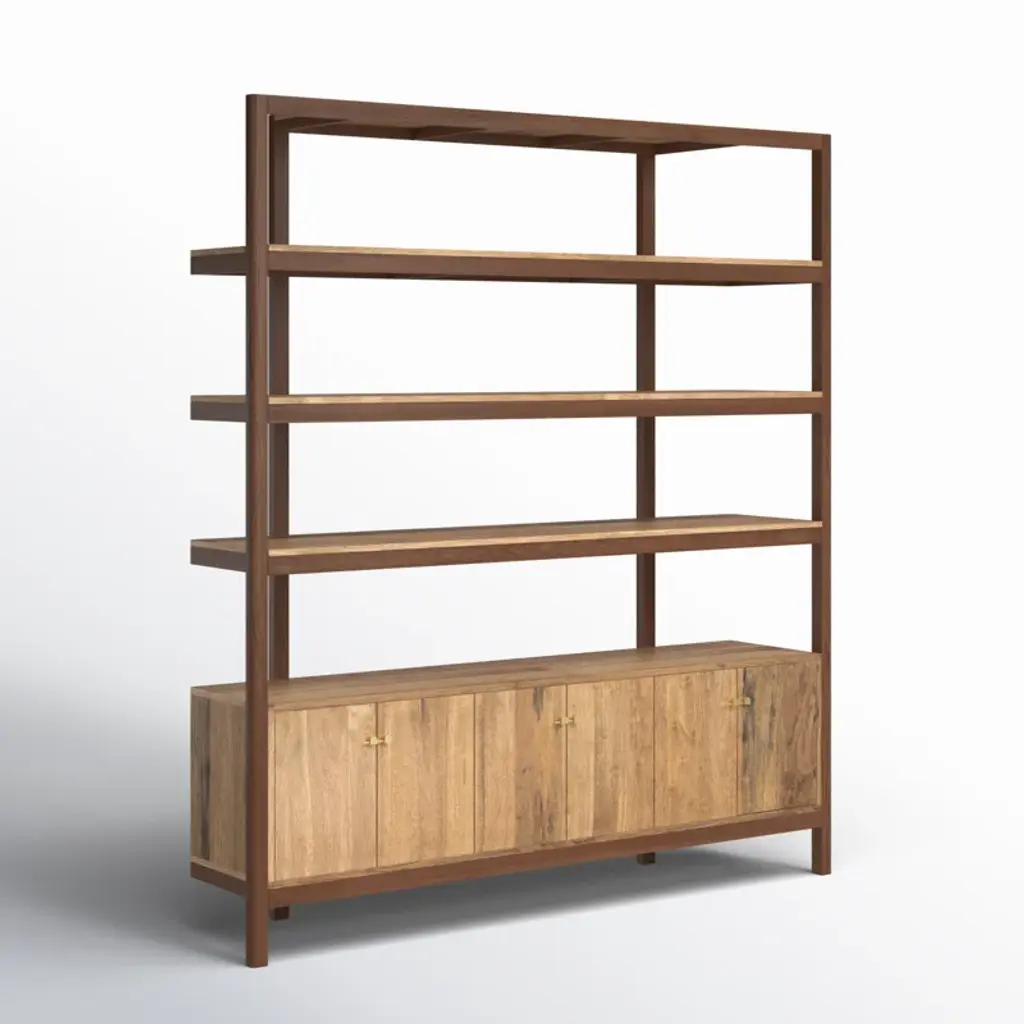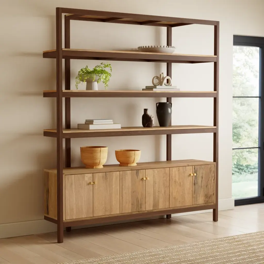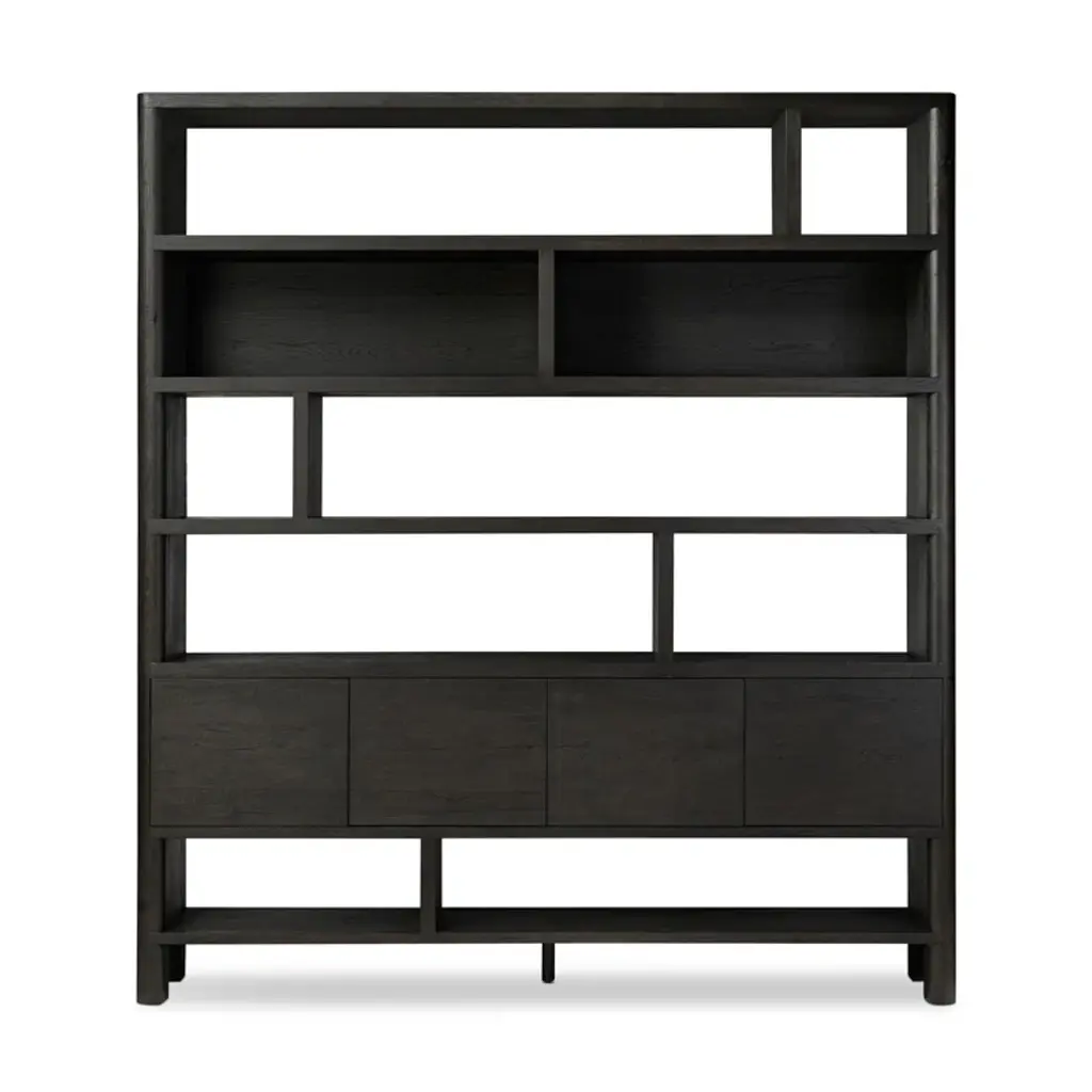 Midcentury styling with a Shaker spirit. Finished in a worn black, solid parawood forms a storage-driven bookcase, framed out by solid acacia. Ample open shelving plus lower interior storage provides a place for just about everything.