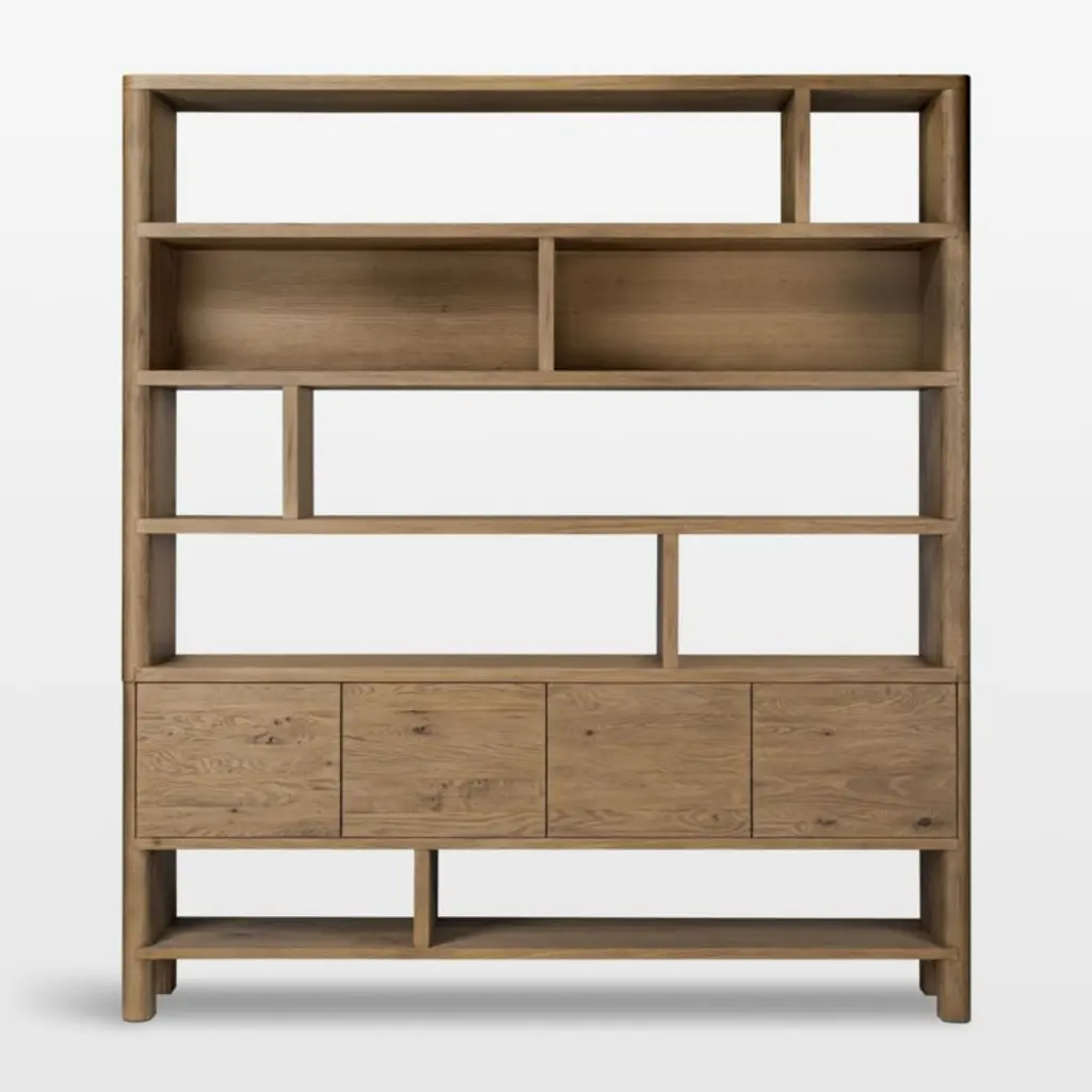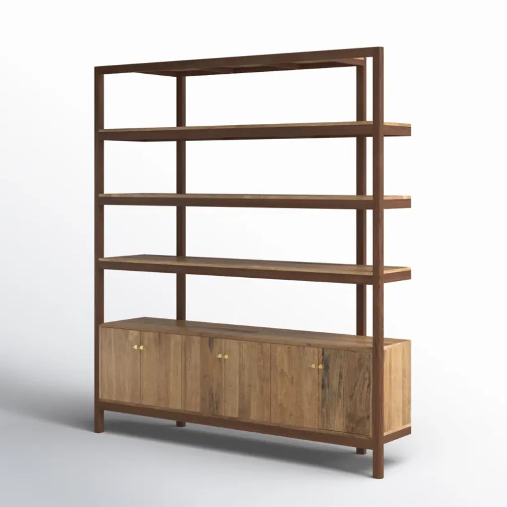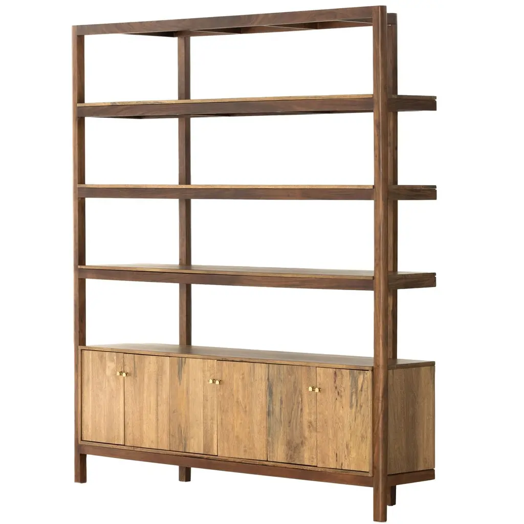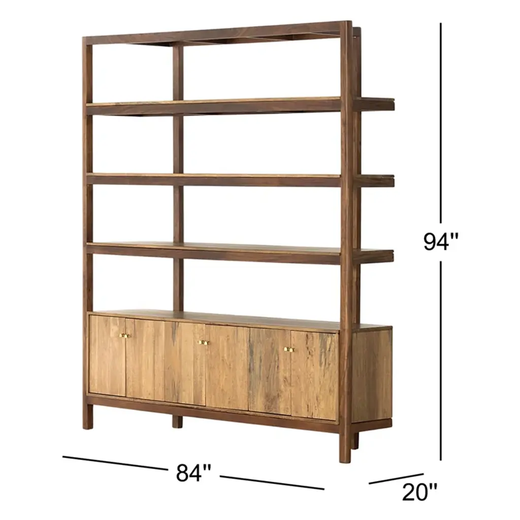 Midcentury styling with a Shaker spirit. Finished in a worn black, solid parawood forms a storage-driven bookcase, framed out by solid acacia. Ample open shelving plus lower interior storage provides a place for just about everything.