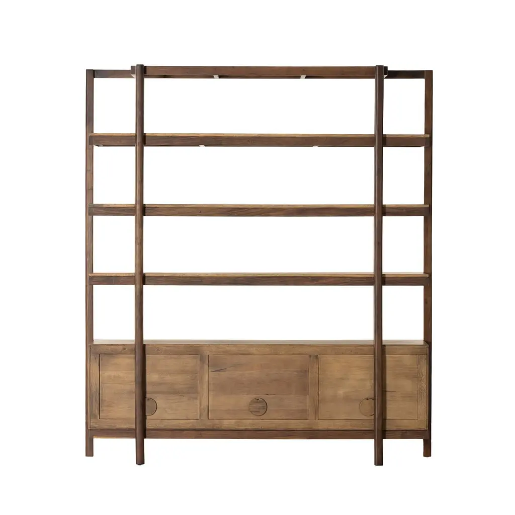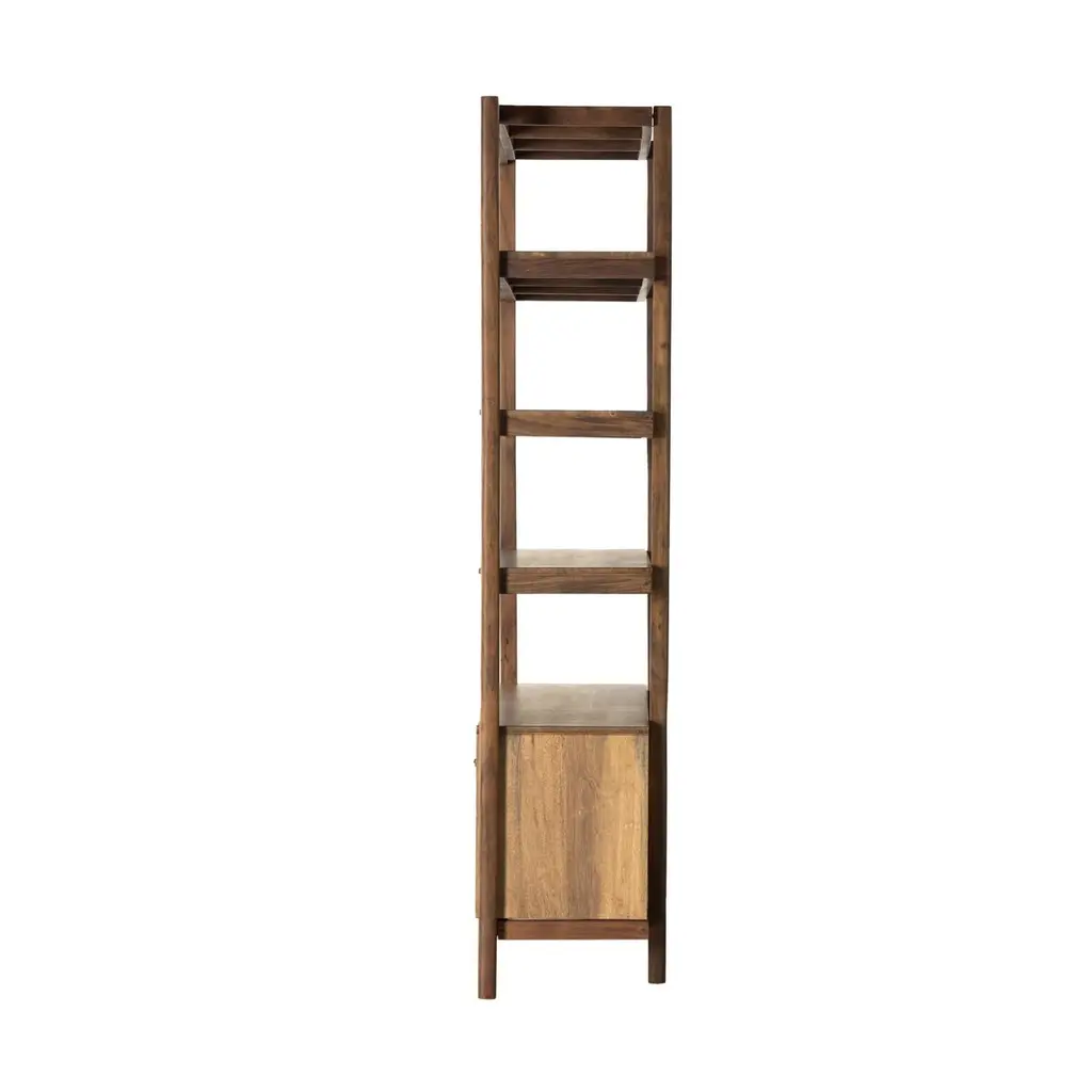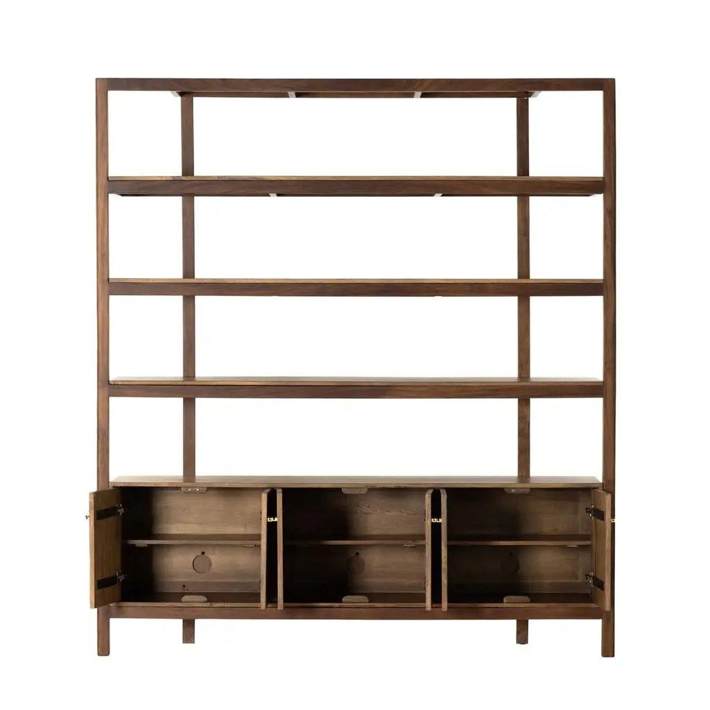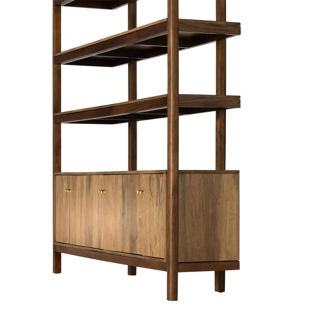 Midcentury styling with a Shaker spirit. Solid parawood forms a storage-driven bookcase, framed out by solid acacia. Ample open shelving plus lower interior storage provides a place for just about everything.