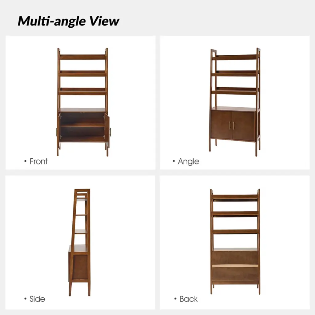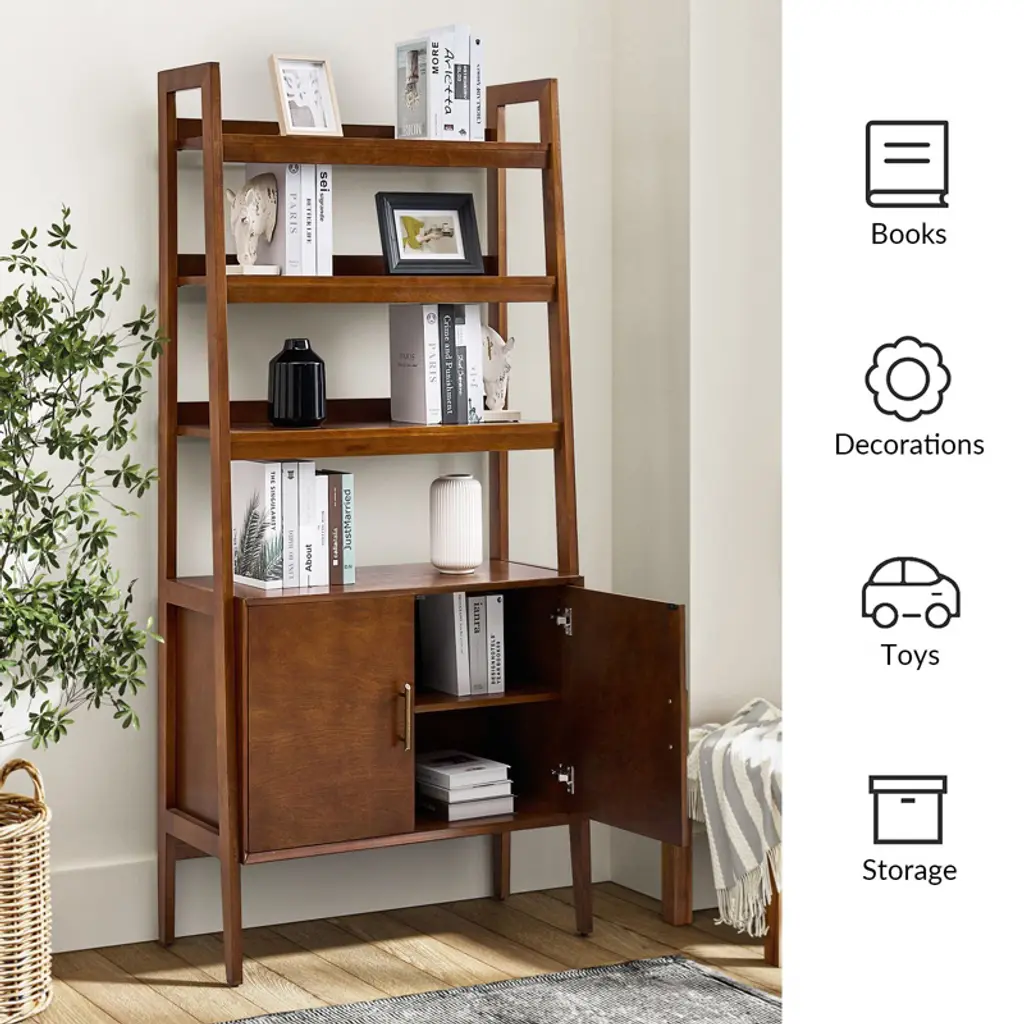 This clean-lined ladder bookcase adds plenty of function and mid-century modern style to your living room, bedroom or study. The frame of this bookcase is made of high-quality wood and supported by solid wood legs, which could last for years of use. This bookcase is a mix of open and closed storage. Three open shelves organize books, photos or decorative items, while a spacious shelf cabinet keeps clutter out of sight and gives your bookshelf a clean and tidy look. This bookcase allows multiple units to combine for expanded storage. Fill this creative bookcase with your favorites! Choose the best bookcase for your books, CDs, magazines and collectibles!