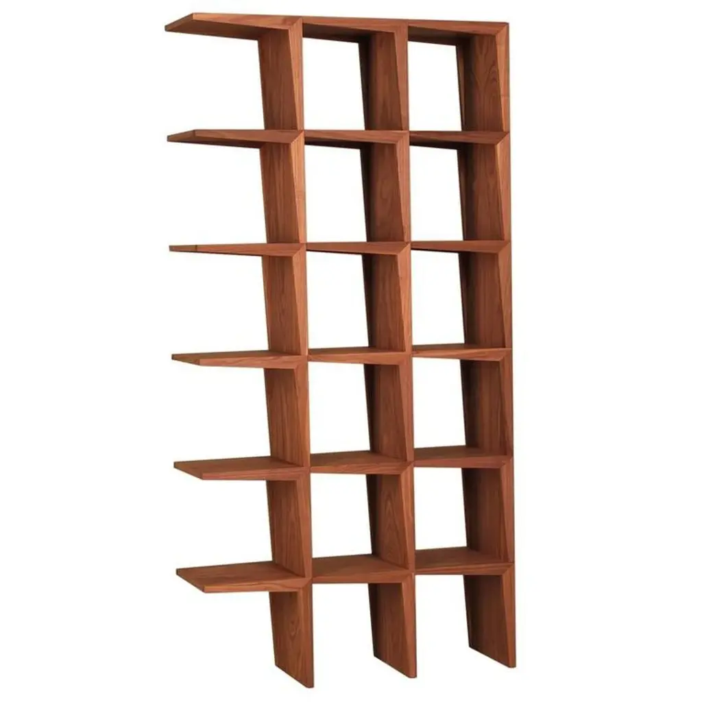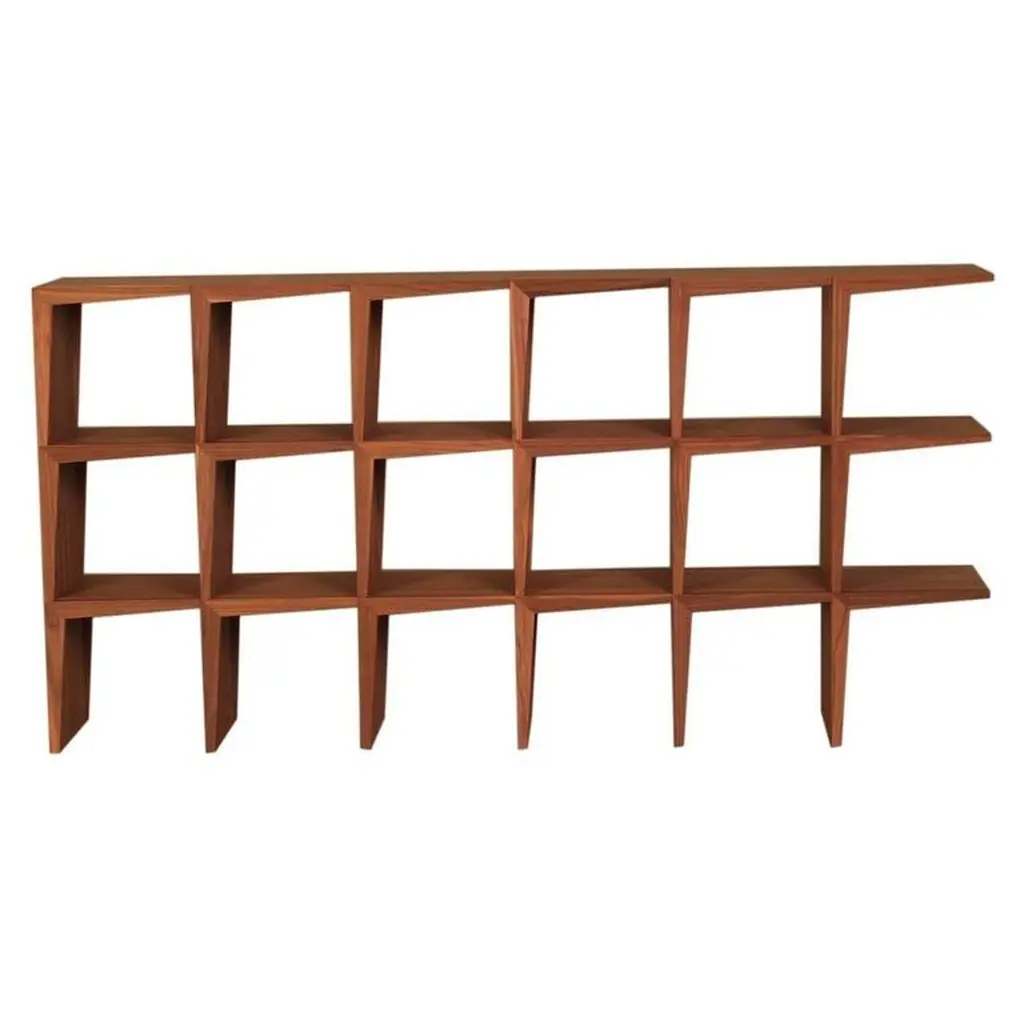 Designed by celebrated Israeli architect Itamar Harari, this walnut bookcase can be used on both sides, making this a sophisticated and modern room divider as well. The unique Silhouette that leaves one side opened, allows for the combination of several pieces together for a completely customized experience. This network of geometric lines will add a touch of minimalism and elegance to any room.
