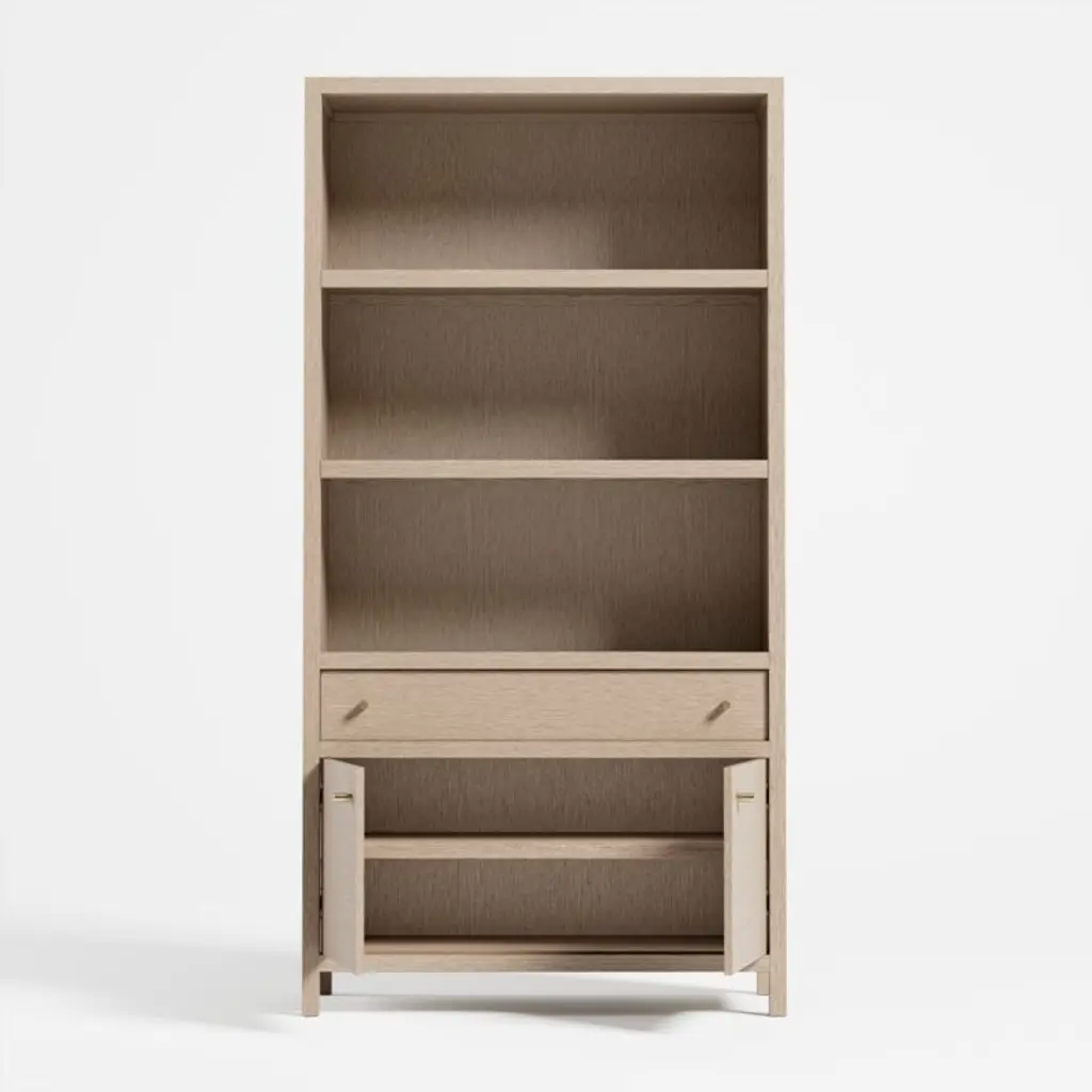 Refined and bold, Keane takes household storage to the next level. Scaled to create a stately presence in the office, living room or den, each piece is crafted of beautiful meranti wood with a natural rustic finish that puts the focus on the wood. Three open shelves display books and collectibles, while a drawer and double-doored cabinet provides closed storage. Dotted with small brass pulls, the bookshelf's flat fronts and channel detailing on the sides enhance the clean, architectural design. Our best-selling Keane collection is a Crate & Barrel exclusive.By choosing FSC ®-certified furniture, you are supporting responsible management of the world's forests.