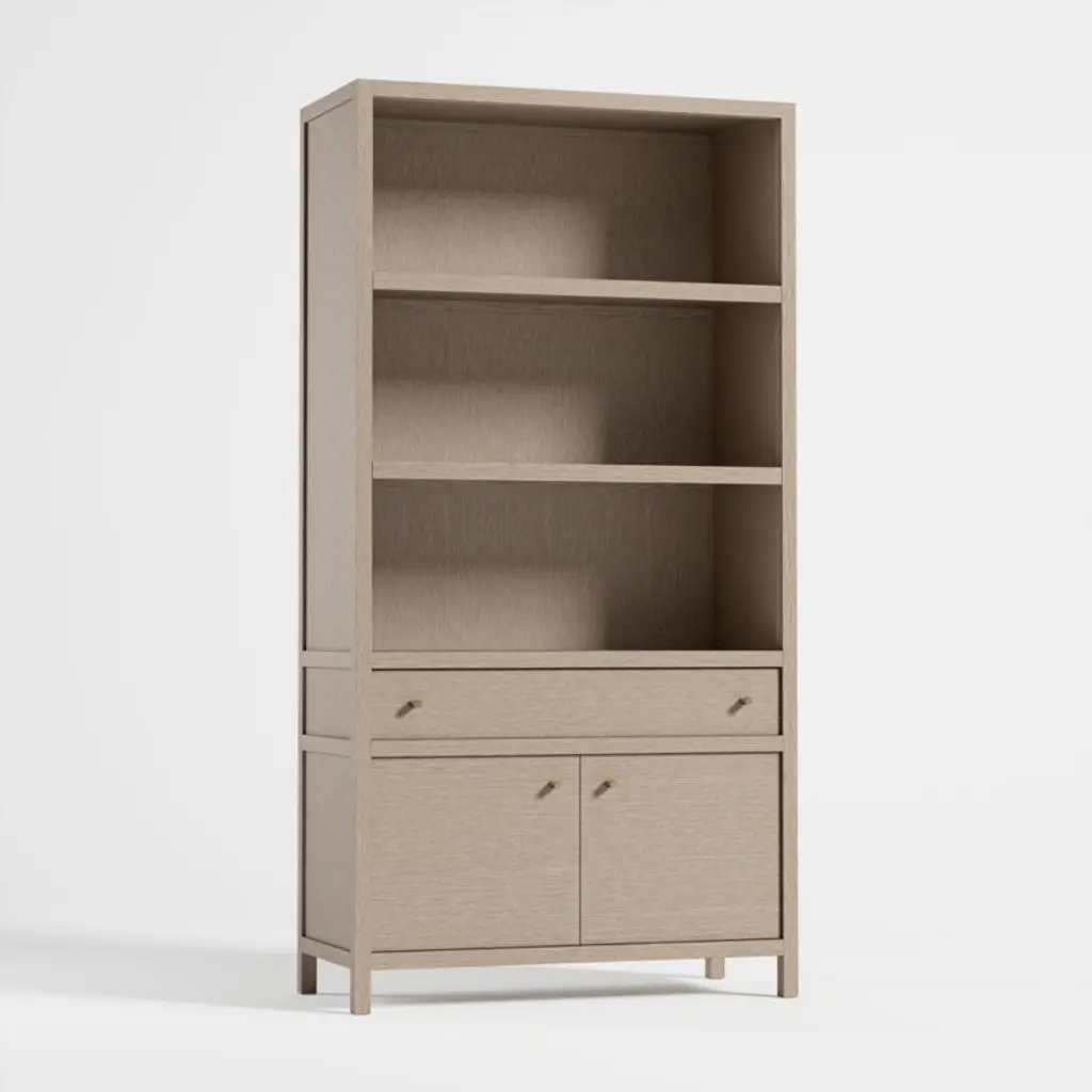 Refined and bold, Keane takes household storage to the next level. Scaled to create a stately presence in the office, living room or den, each piece is crafted of beautiful meranti wood with a natural rustic finish that puts the focus on the wood. Three open shelves display books and collectibles, while a drawer and double-doored cabinet provides closed storage. Dotted with small brass pulls, the bookshelf's flat fronts and channel detailing on the sides enhance the clean, architectural design. Our best-selling Keane collection is a Crate & Barrel exclusive.By choosing FSC ®-certified furniture, you are supporting responsible management of the world's forests.