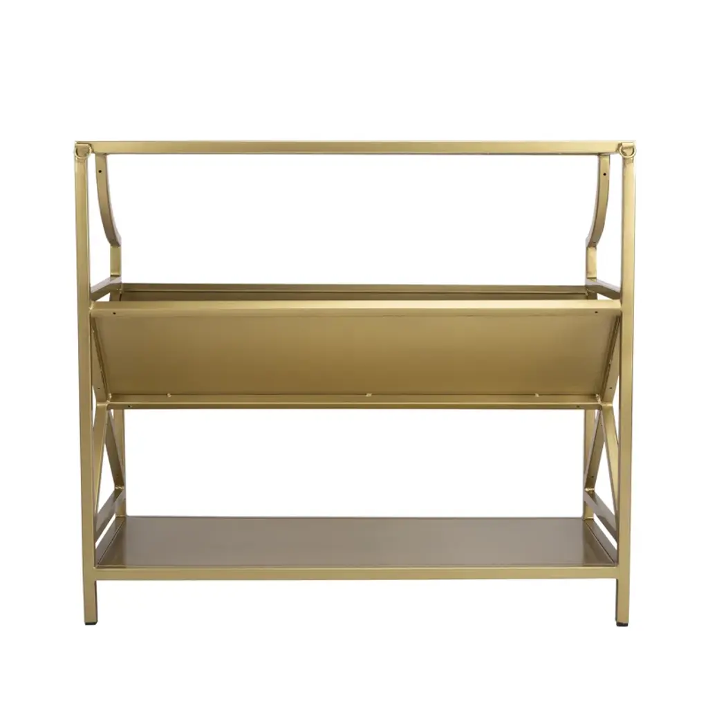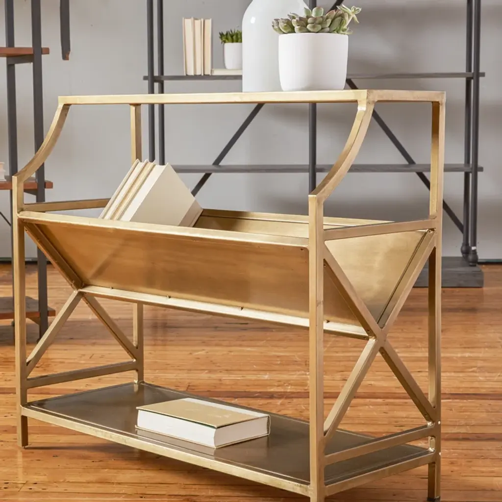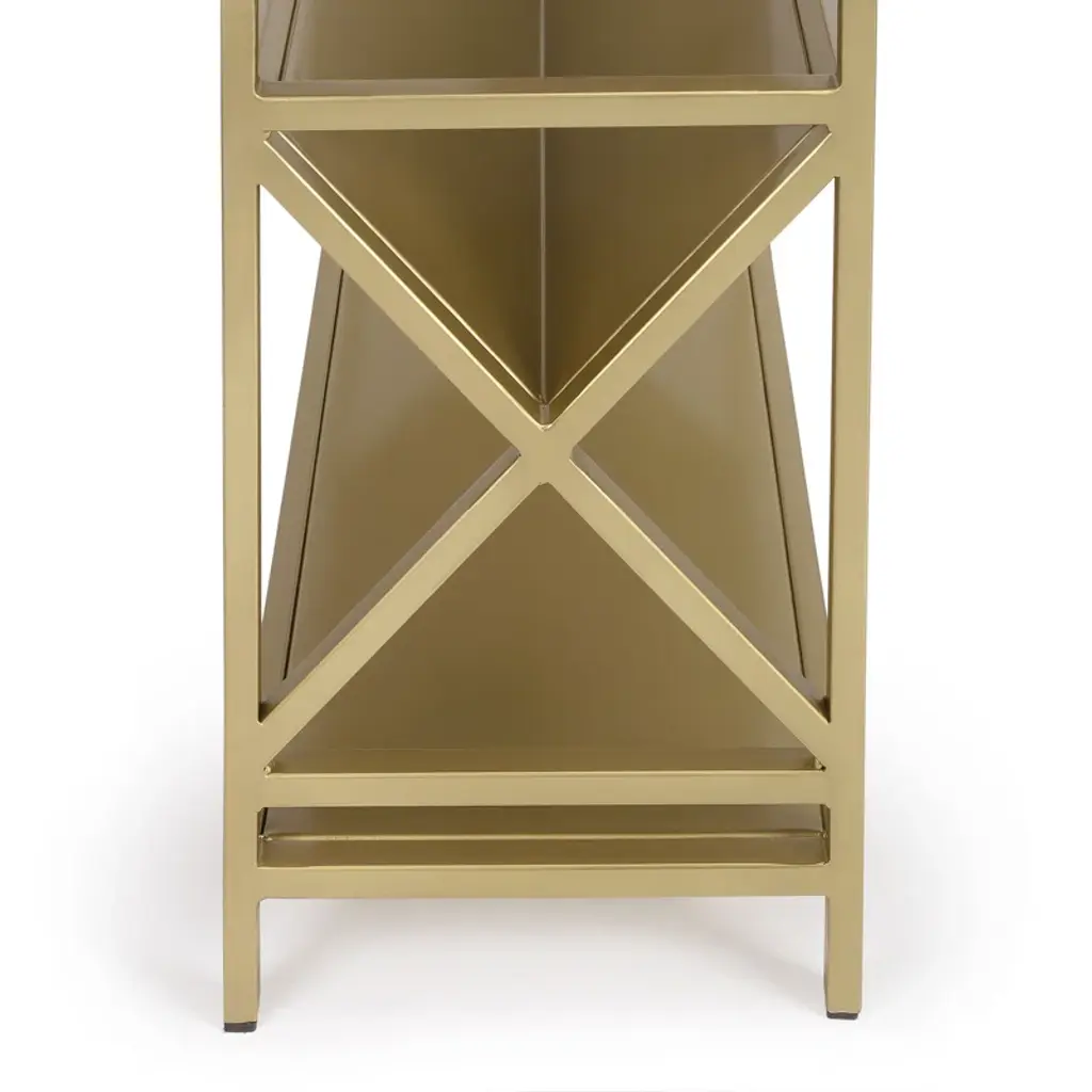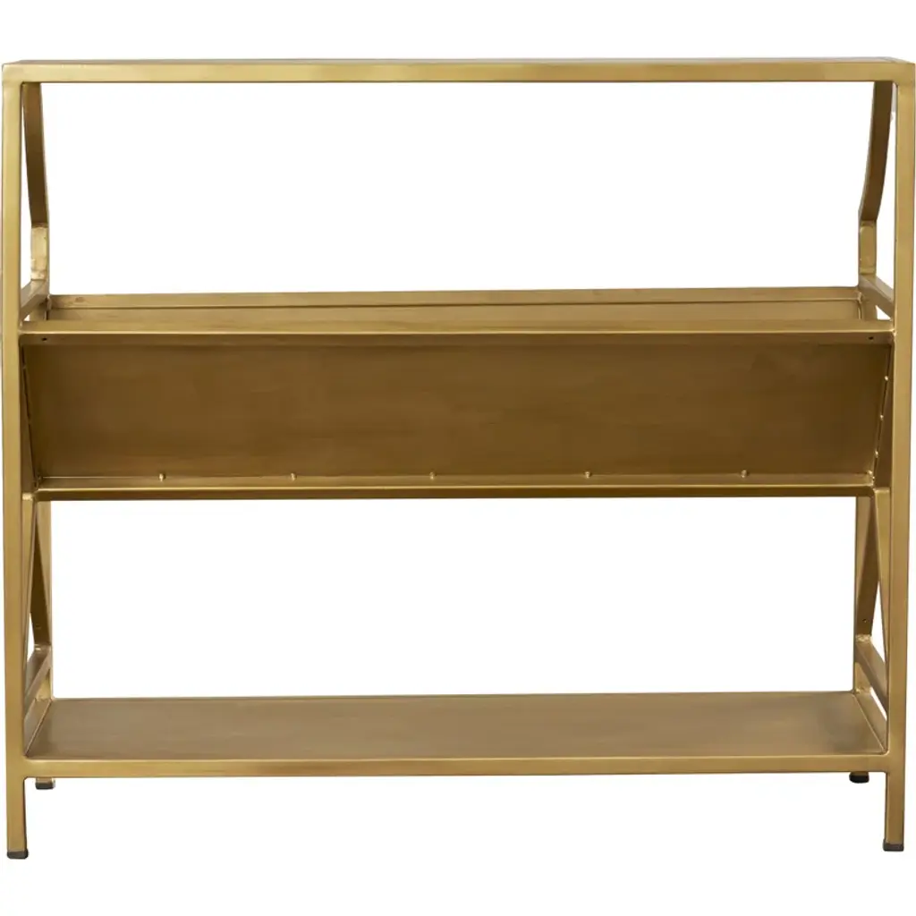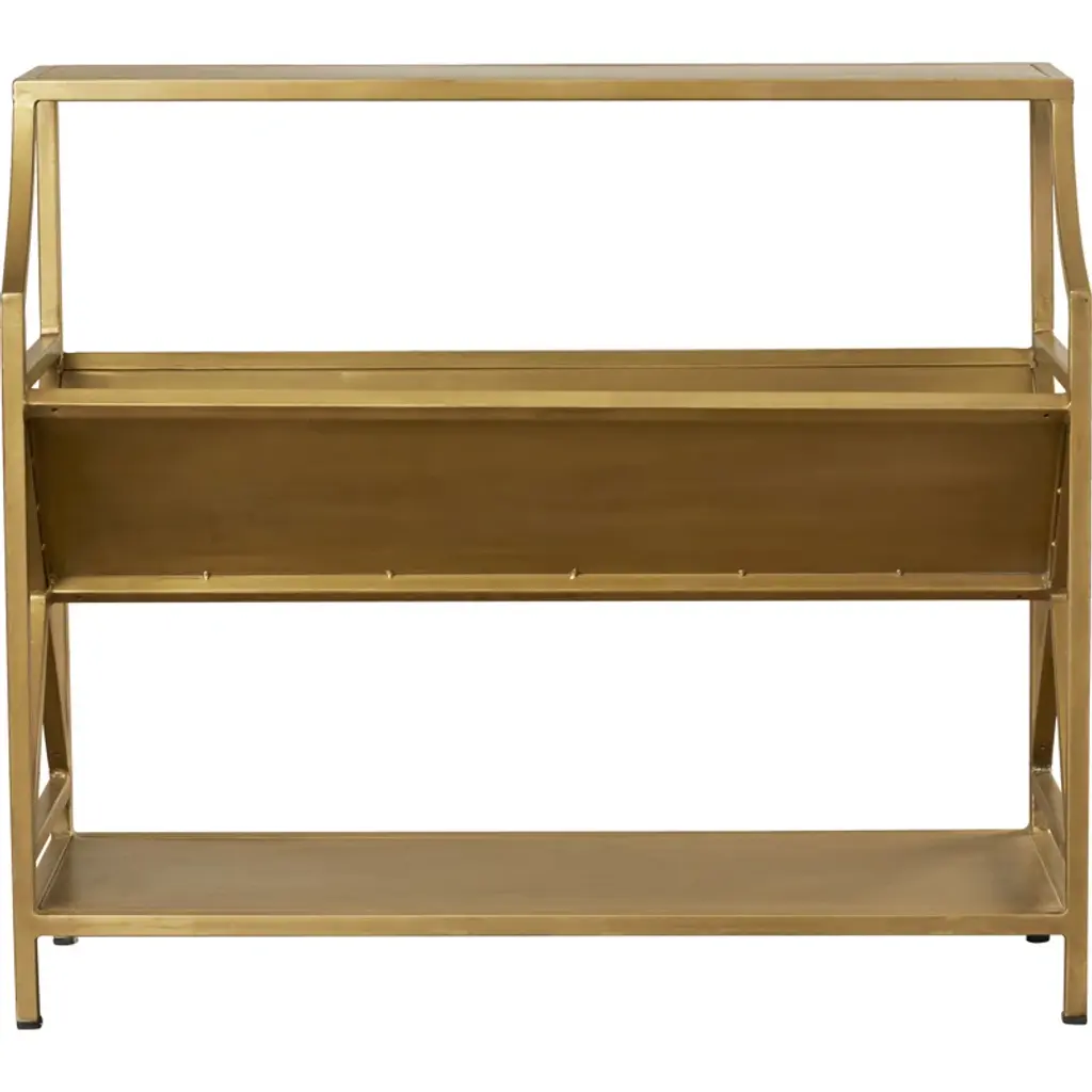 Keep your space stylish and your favorite titles organized with this eye-catching bookcase! Crafted from metal with antique gold, silver, or black finish, this piece features three shelves – two standard shelves and one triangular one – that allow you to show off decorative objects and keep books stacked and sorted. Plus, with its open design and X-shaped side panels, it's perfect for an airy look that's easily mixed into styles from glam to French country to farmhouse. Hand-curated by Kelly Clarkson.