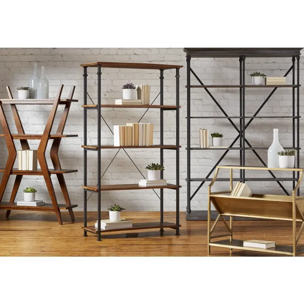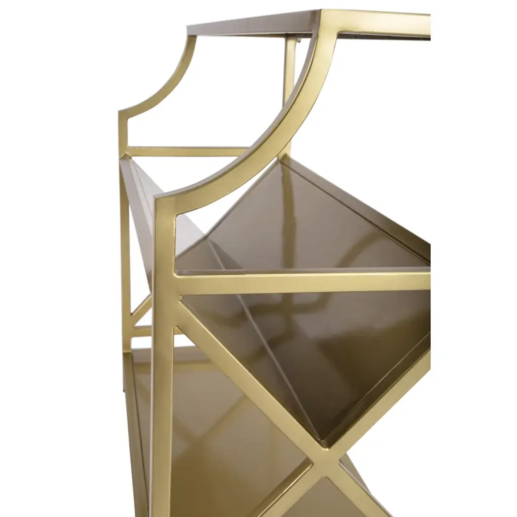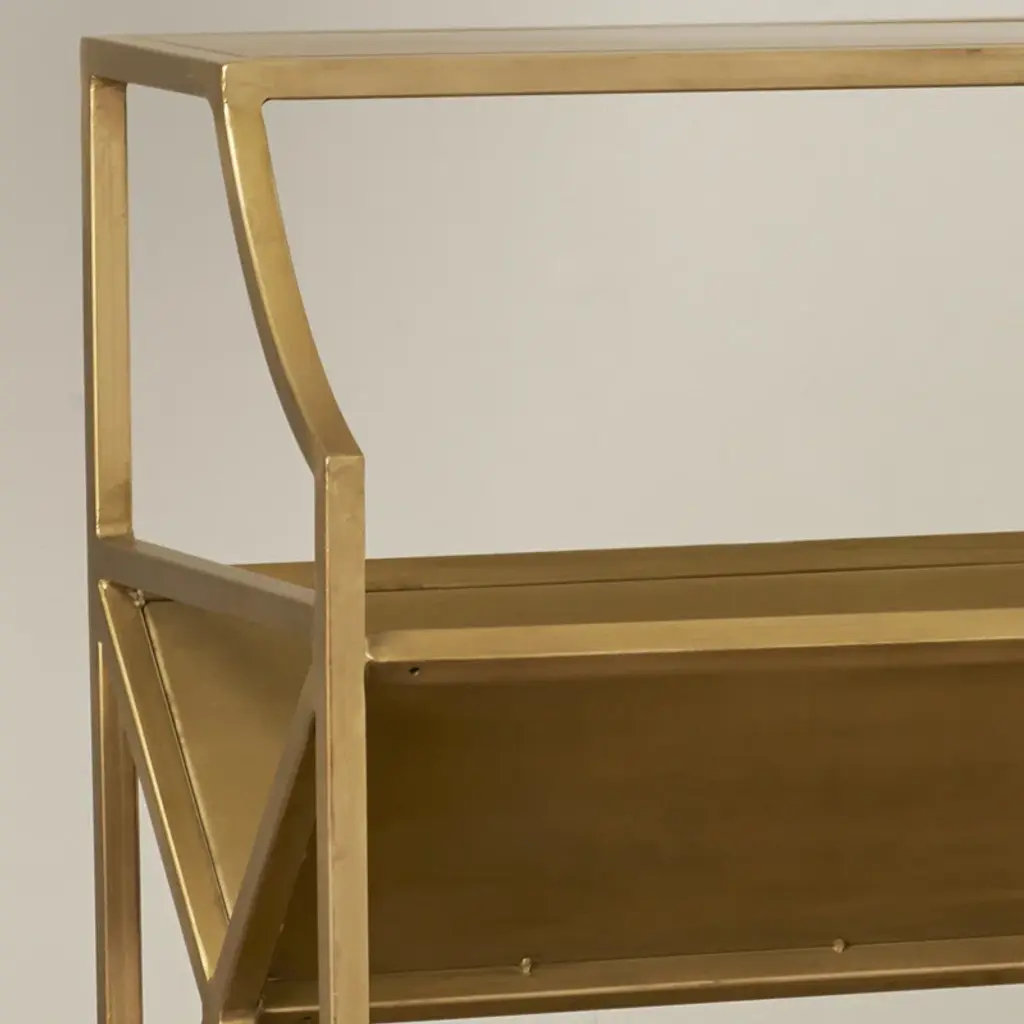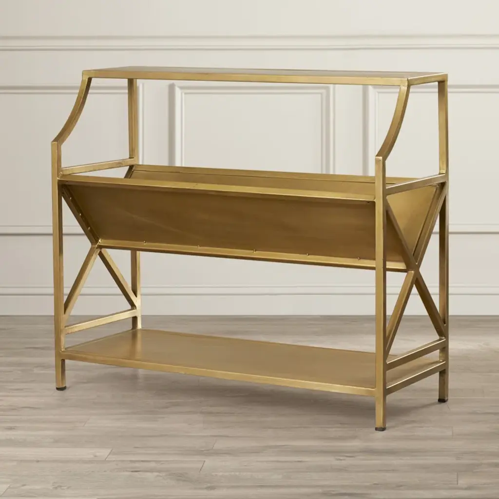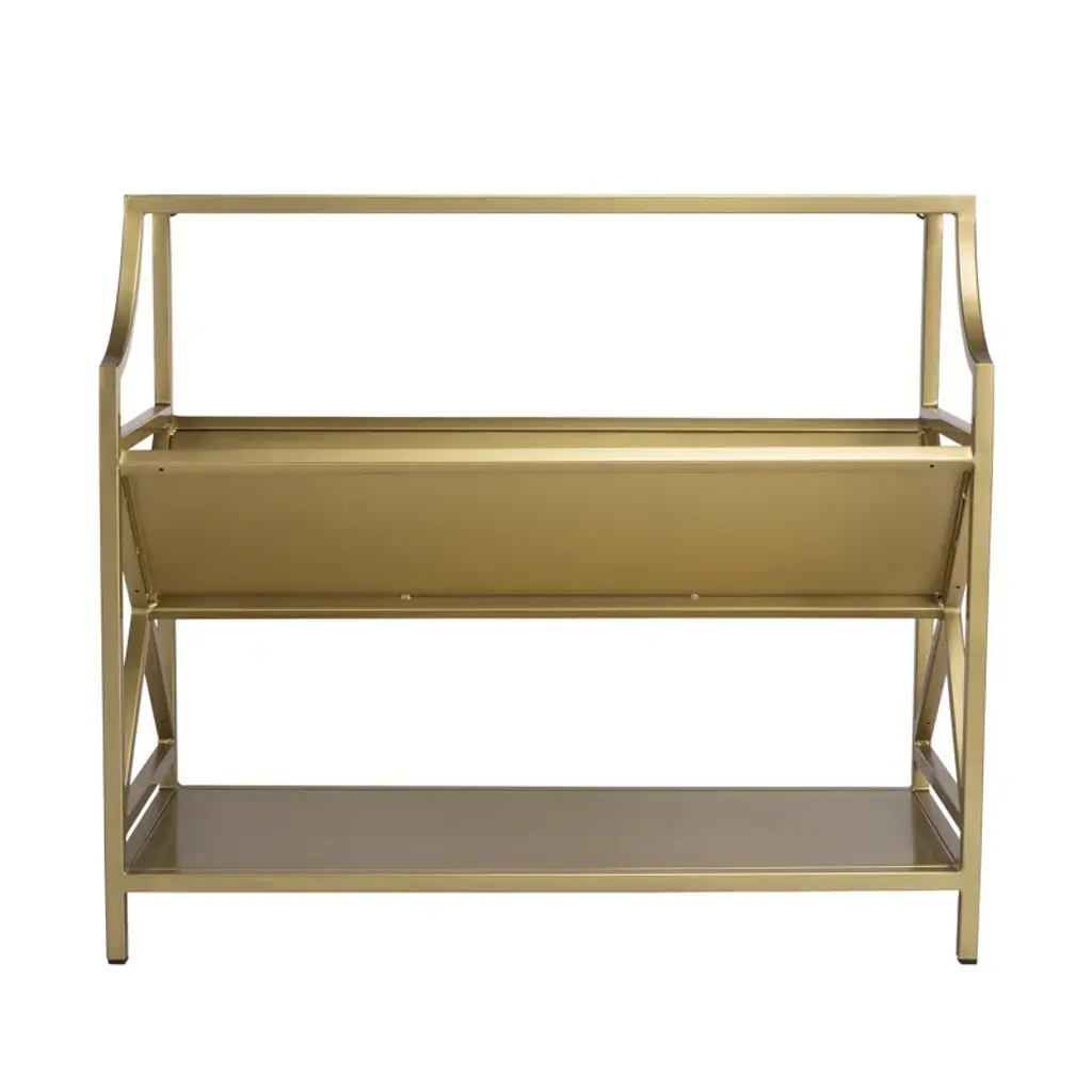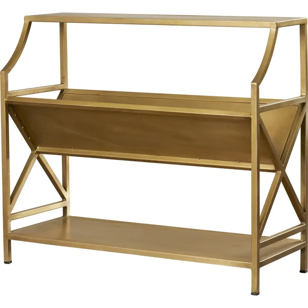 Keep your space stylish and your favorite titles organized with this eye-catching bookcase! Crafted from metal with antique gold, silver, or black finish, this piece features three shelves – two standard shelves and one triangular one – that allow you to show off decorative objects and keep books stacked and sorted. Plus, with its open design and X-shaped side panels, it's perfect for an airy look that's easily mixed into styles from glam to French country to farmhouse. Hand-curated by Kelly Clarkson.