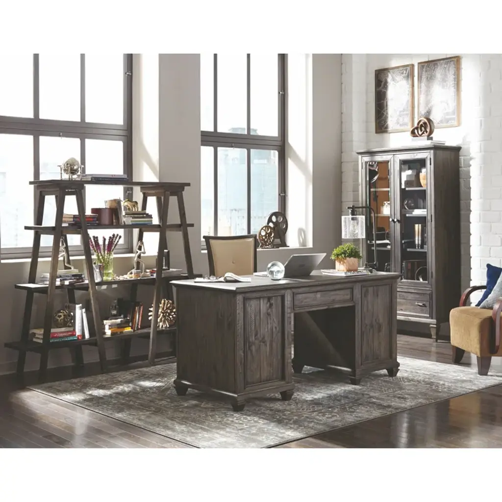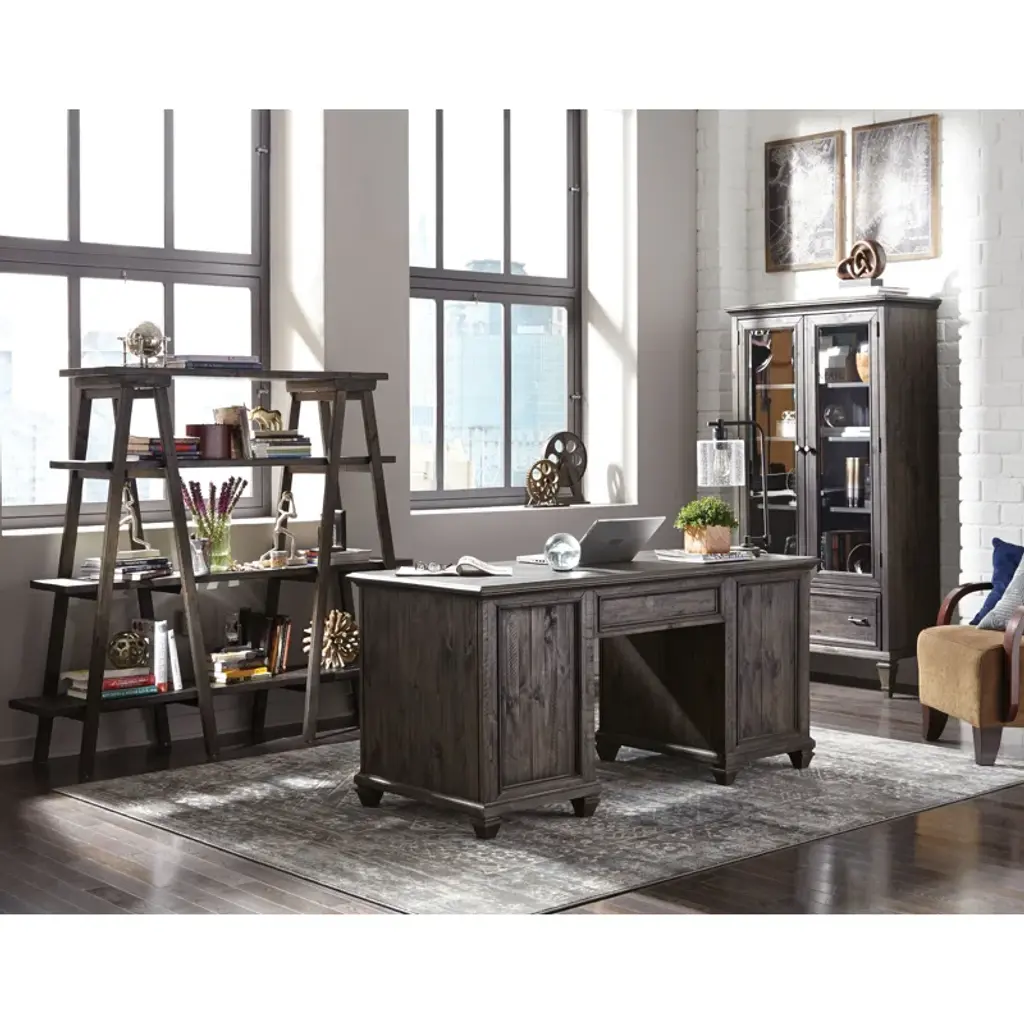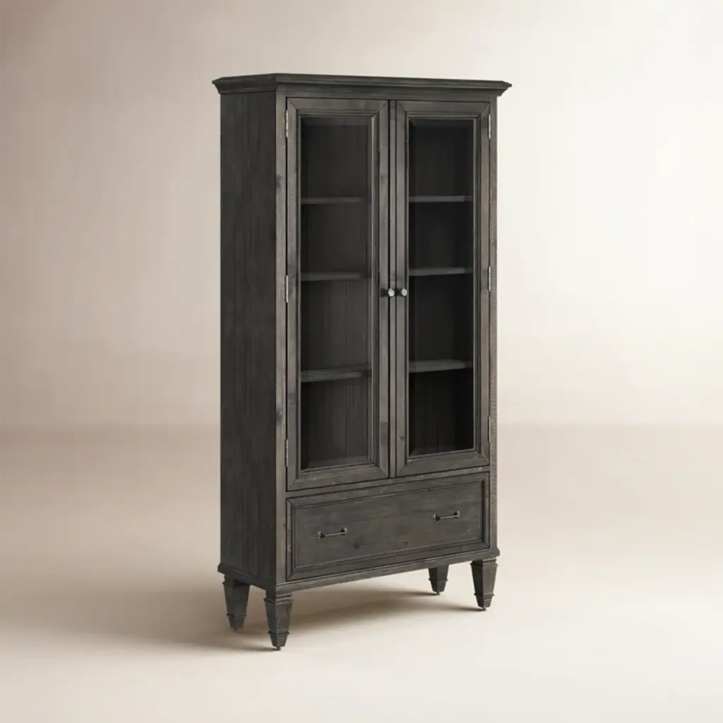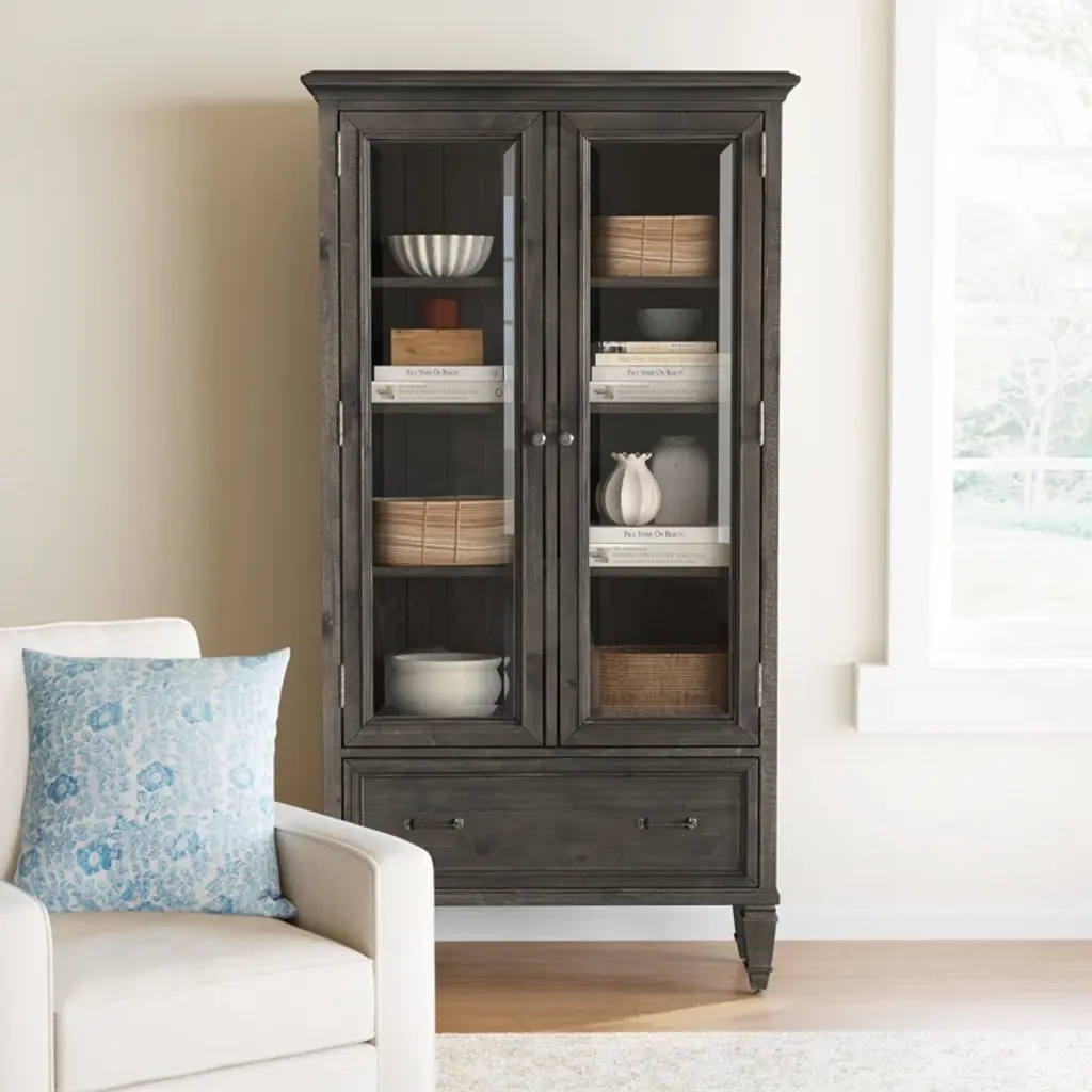 This wooden bookcase is a fresh take on a traditional farmhouse favorite with its tall glass doors and integrated LED lighting. It's thoughtfully crafted from pine hardwoods with a natural wood grain texture that comes in the finish of your choice. Its stately silhouette is accented by crown moldings, raised paneling, and four spade feet, while aged bronze hardware adds just the right amount of contrast. Looks aside, three shelves (with built-in lighting) let you display framed photos, prized knickknacks, and rows of your favorite antique books, making this furniture piece an excellent storage solution for an at-home office or den. And a wide lower drawer is great for tucking away any accessories you want out of sight. Best of all? This standard bookcase comes with a tipover restraint, which comes in handy if you have little ones running around.
