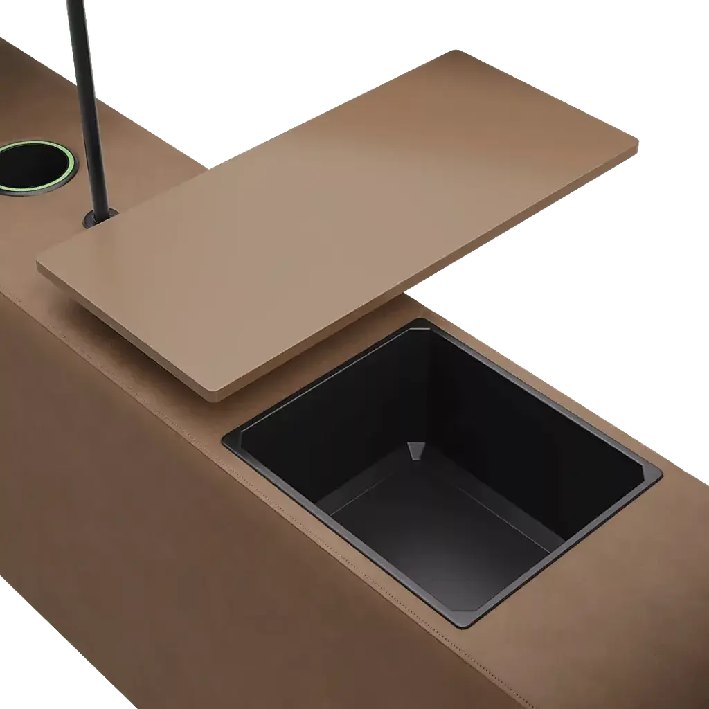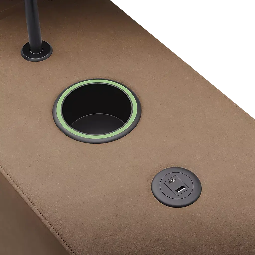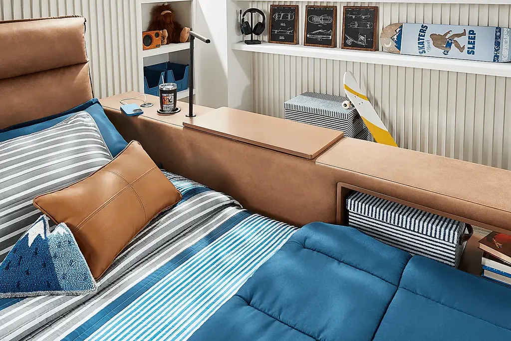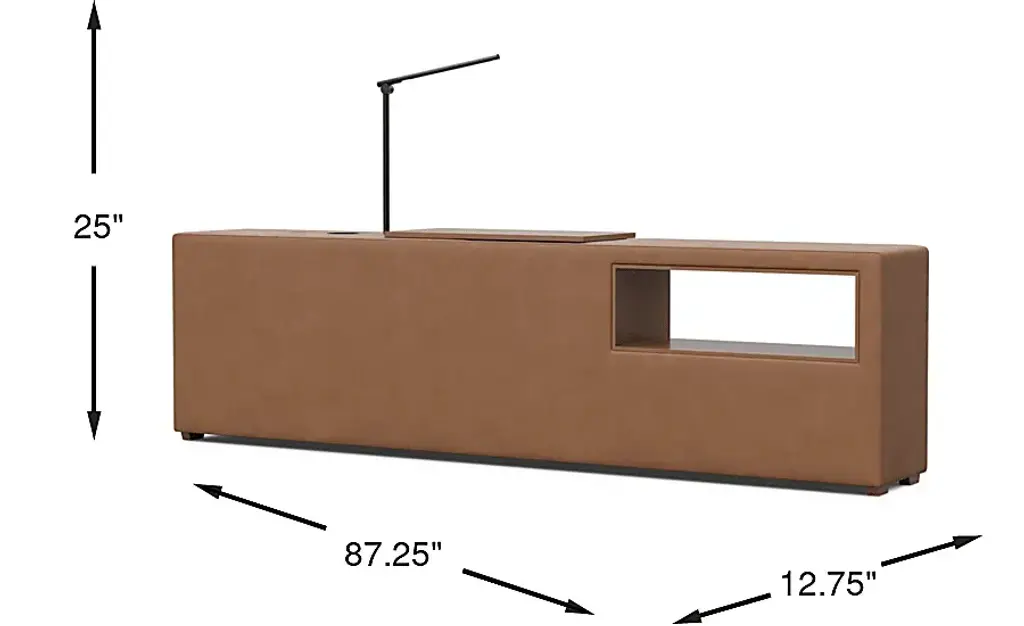 Your forecast calls for a 100% chance of style and super smart storage when you bring the Cloud9 collection home. Perfect for older kids, teens, and young adults, the bookcase features a sleek, low-profile silhouette enhanced by softly padded panels wrapped in plush suede-soft saddle colored microfiber upholstery for a warm, modern look. But don't let the name fool you, this piece isn't just for books. With a built-in swivel table, glow-in-the-dark cup holder, dual USB charging port and touch LED reading light, the bookcase turns into a full-featured command center for your kid. The open-storage compartments offer versatile space for books, decor and more everyday items. Upholstery: 100% Polyester