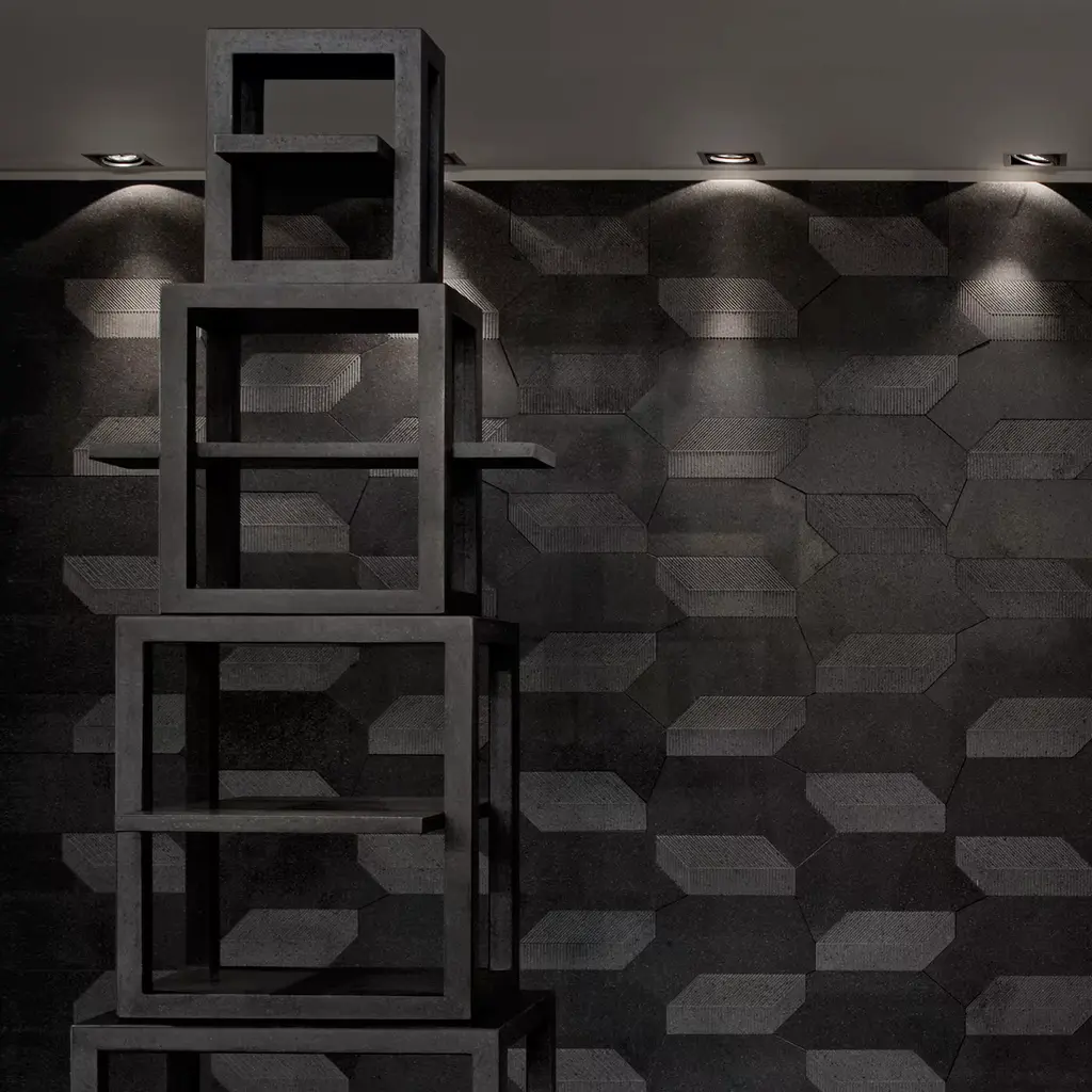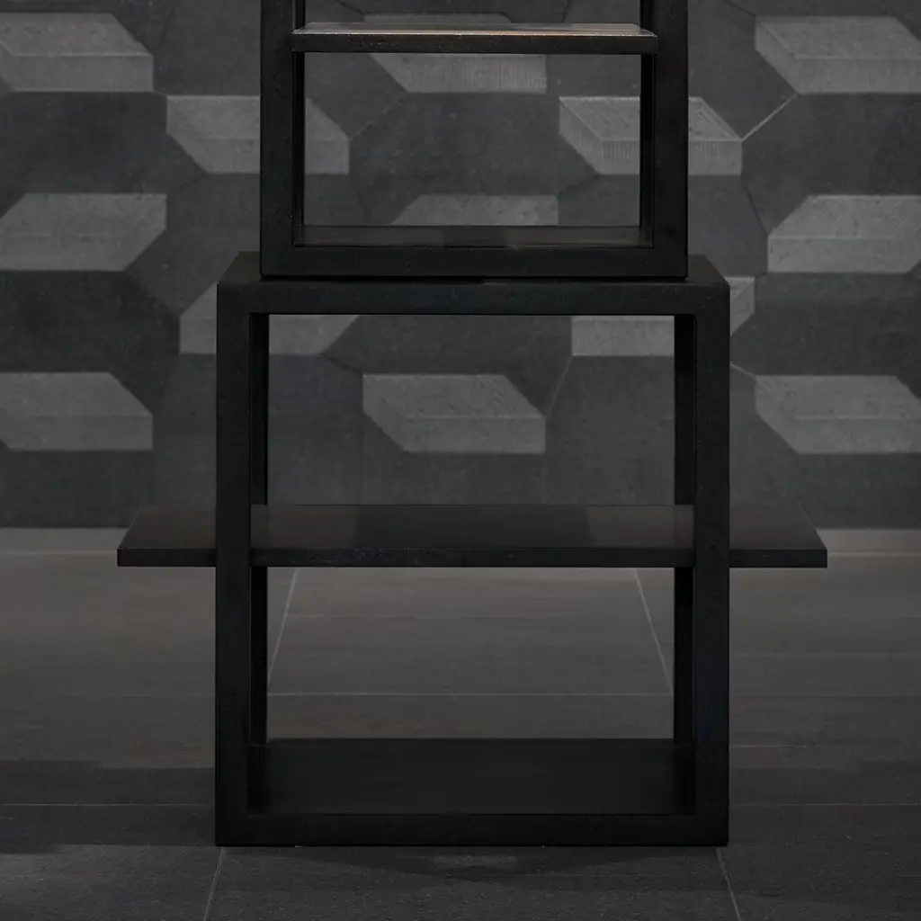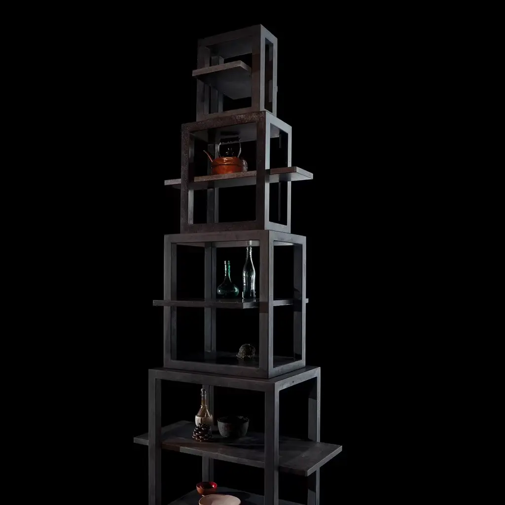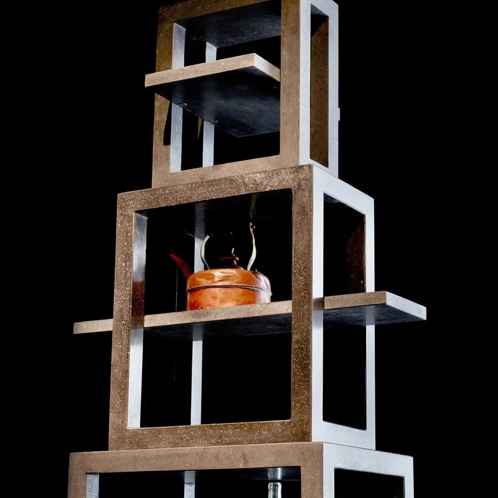 This contemporary bookcase is entirely made of lava stone, fashioned by stacking four increasingly small and concentric hollow cubic shelves one on top of another. The trampolines protrude on horizontal axes, providing precious display surface. The lava stone slabs are 5 and 3 cm thick with a honed finish. The total weight of this piece is 450 kg.