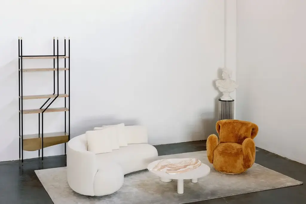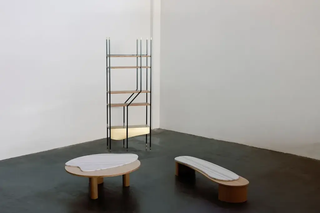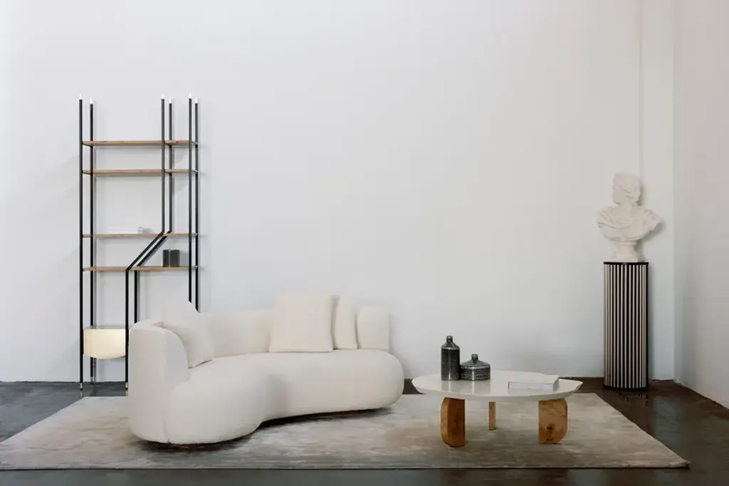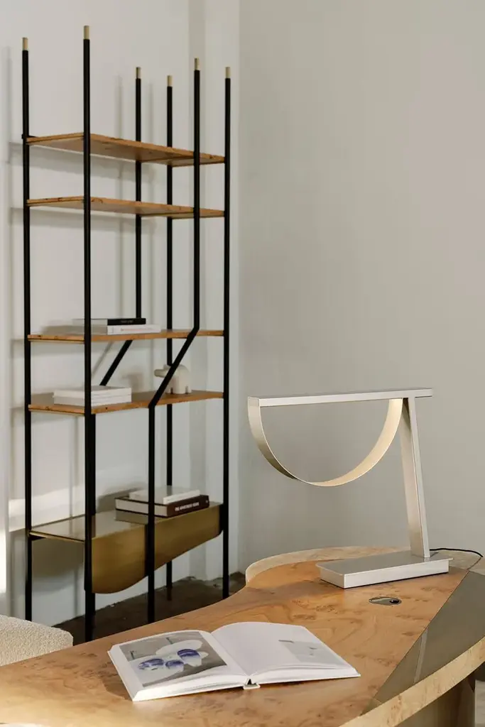 An asymmetrical design that will unsettle even the most obedient. The LAGE bookcase was created for those who are born to fall outside the norm. Shelves in American oak and a main shelf in oxidized brass complement the black metal structure. The combination of materials has been carefully chosen to match the bold design.Materials & FinishesFI007 Black lacquer, satin finishWD105 Oak root; natural color; matt finishME007 Oxidized brass; high-gloss finish