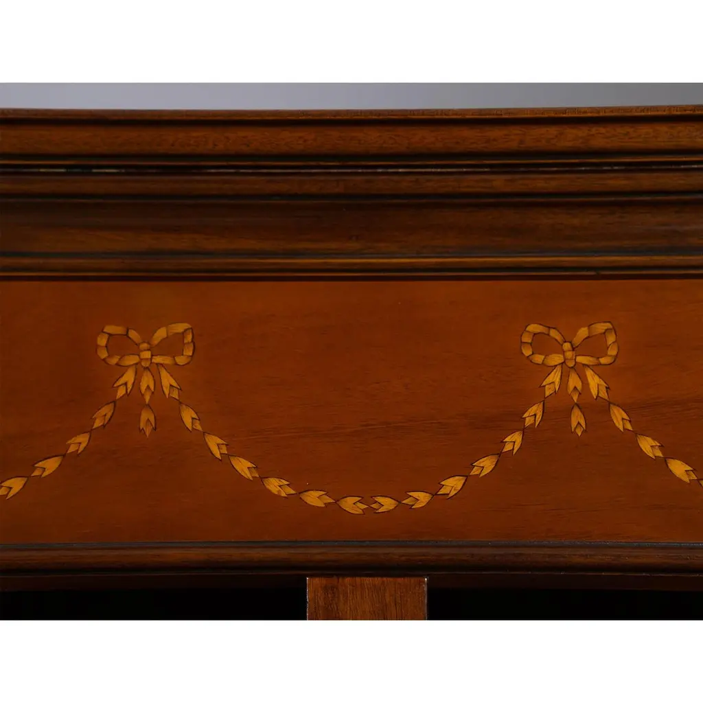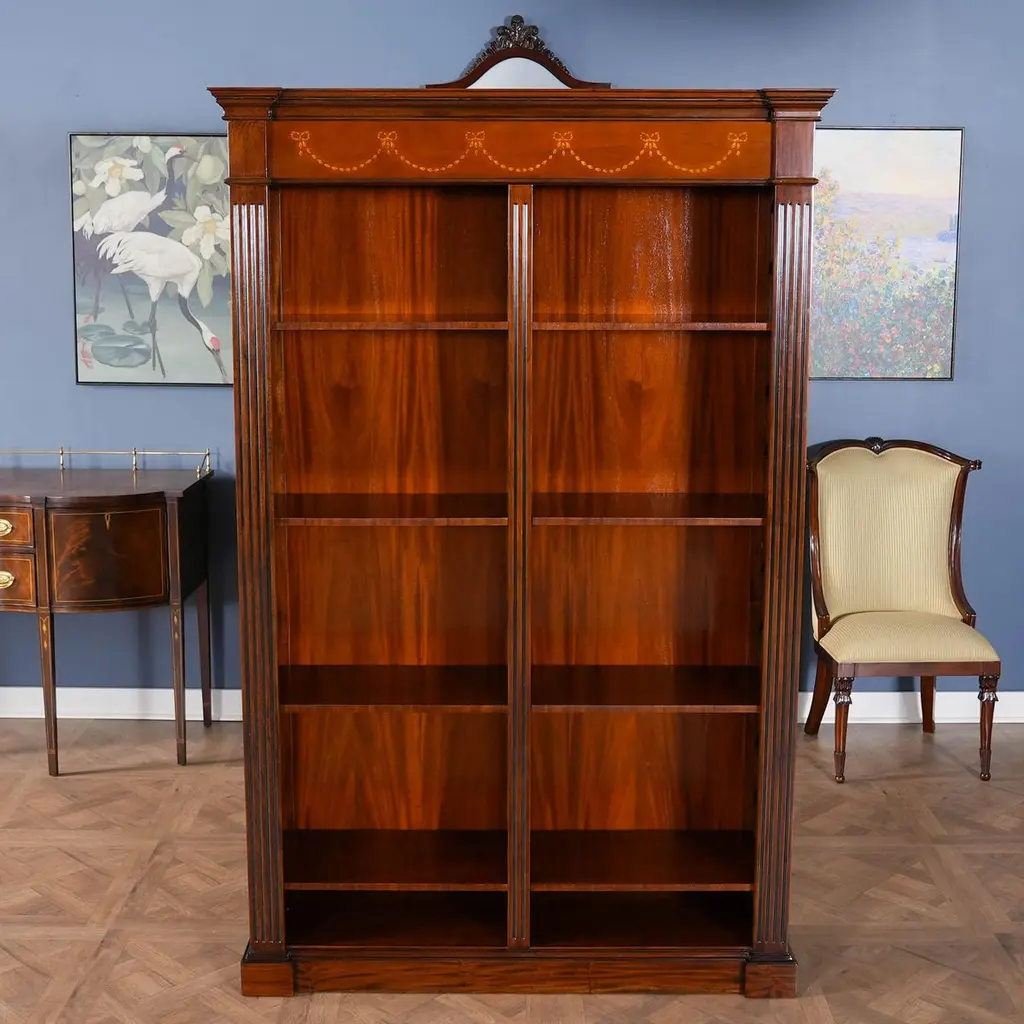 An excellent quality Large Mahogany Bookcase produced by Niagara Furniture. The top section features a moulded cornice with hand cut satinwood inlays arranged in a drape pattern. The open section being divided by a central reeded column for support and flanked by reeded pilasters on each side. Each compartment features four adjustable shelves on wooden supports. Supported by a shaped mahogany base. Dovetailed joinery and panel construction in the rear help keep the entire structure sturdy.Our Large Mahogany Bookcase ships fully assembled and ready to use.Measures 55″w x 17″d x 84″h metric 140 43 213