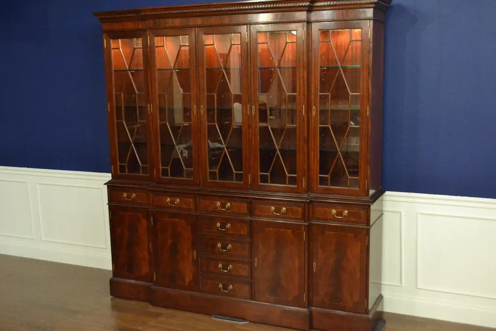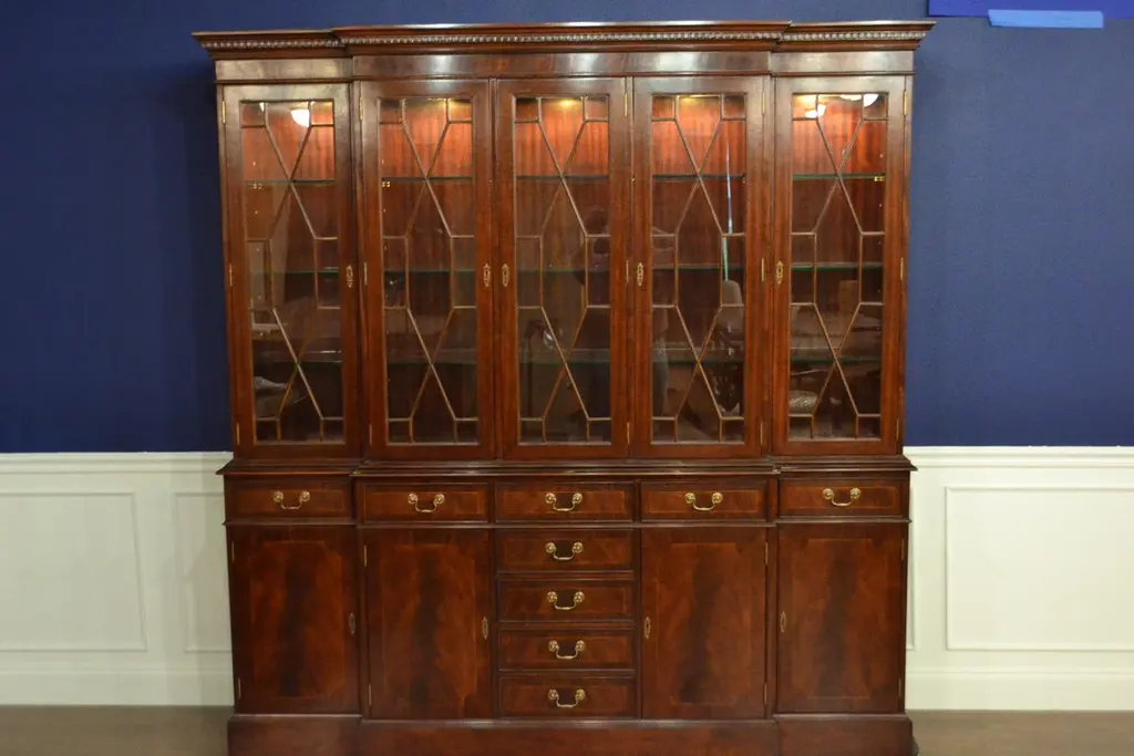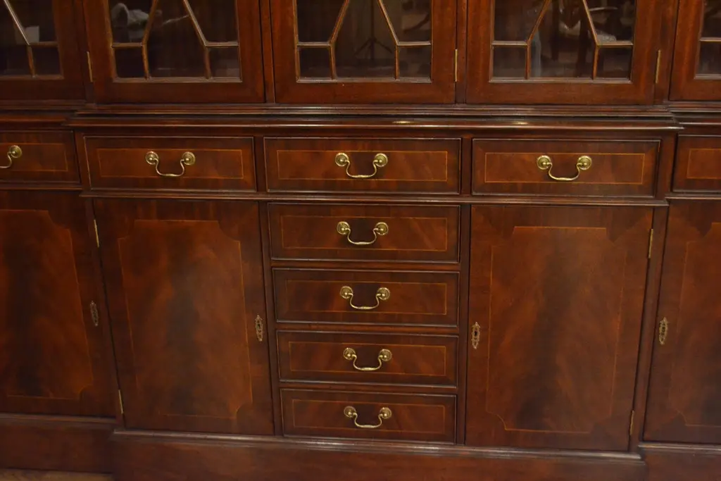 This is a large traditional mahogany breakfront bookcase or china cabinet with five doors by Leighton Hall. It features four bottom doors and nine drawers with swirly crotch mahogany fields and straight grain mahogany borders. The top doors feature grills with individually paned glass. The drawers are masterfully dovetailed and the drawer boxes are made of oak. The hardware is solid brass. The cabinet has dimmable lighting and mortised door locks. Each section has multiple adjustable 3/8 in. glass shelves. It has a hand rubbed satin finish. Dimensions: Width 83 in., depth 18 1/4 in., height 86 in.Optional features include: optional finishes and optional shelving (glass shelves, wood shelves, or wood framed shelves with glass inserts).