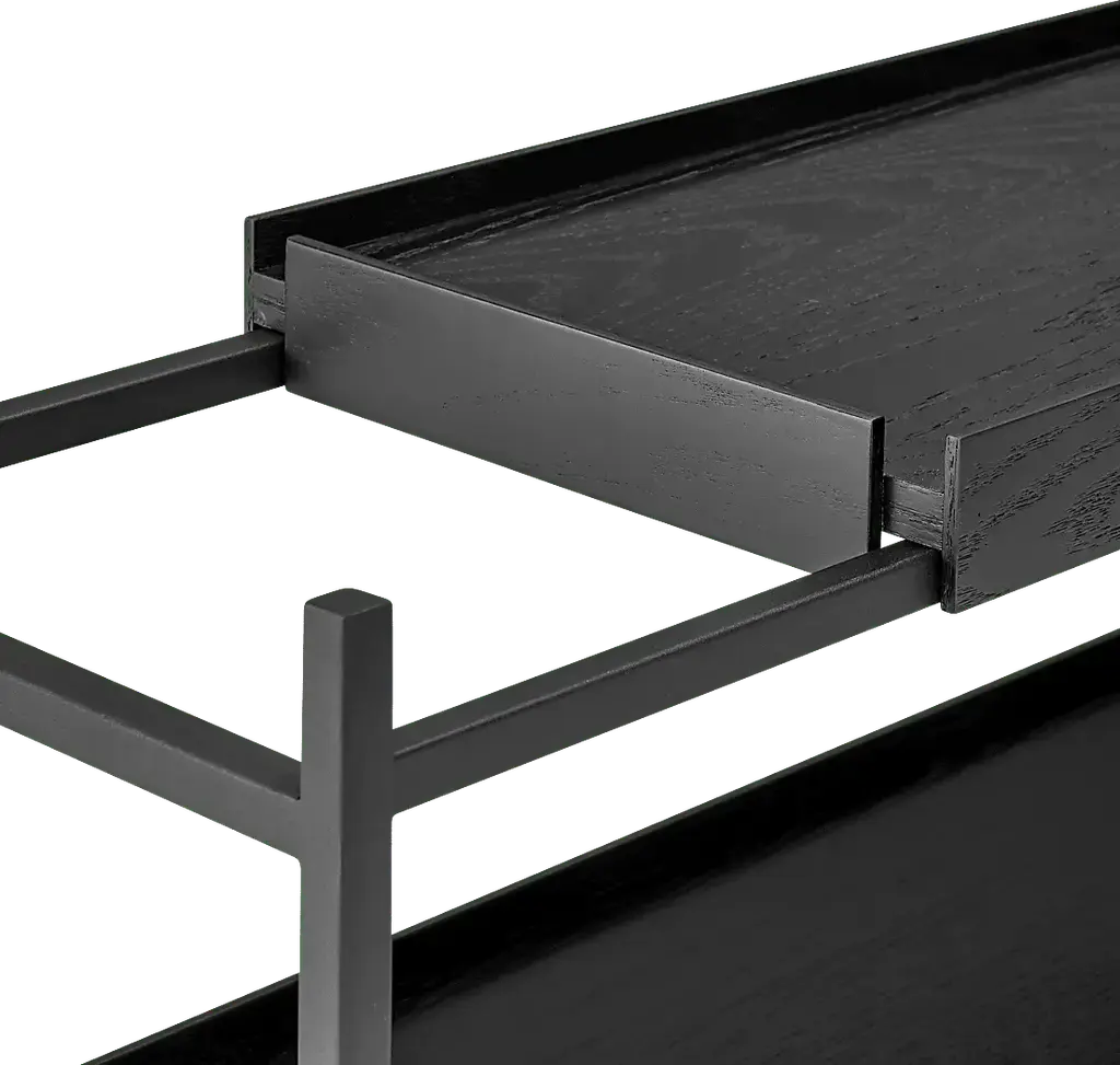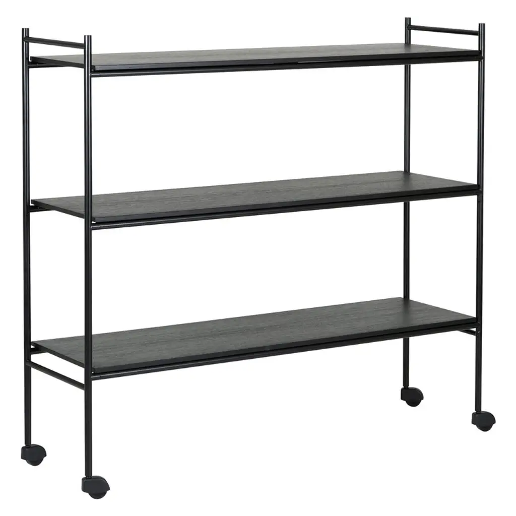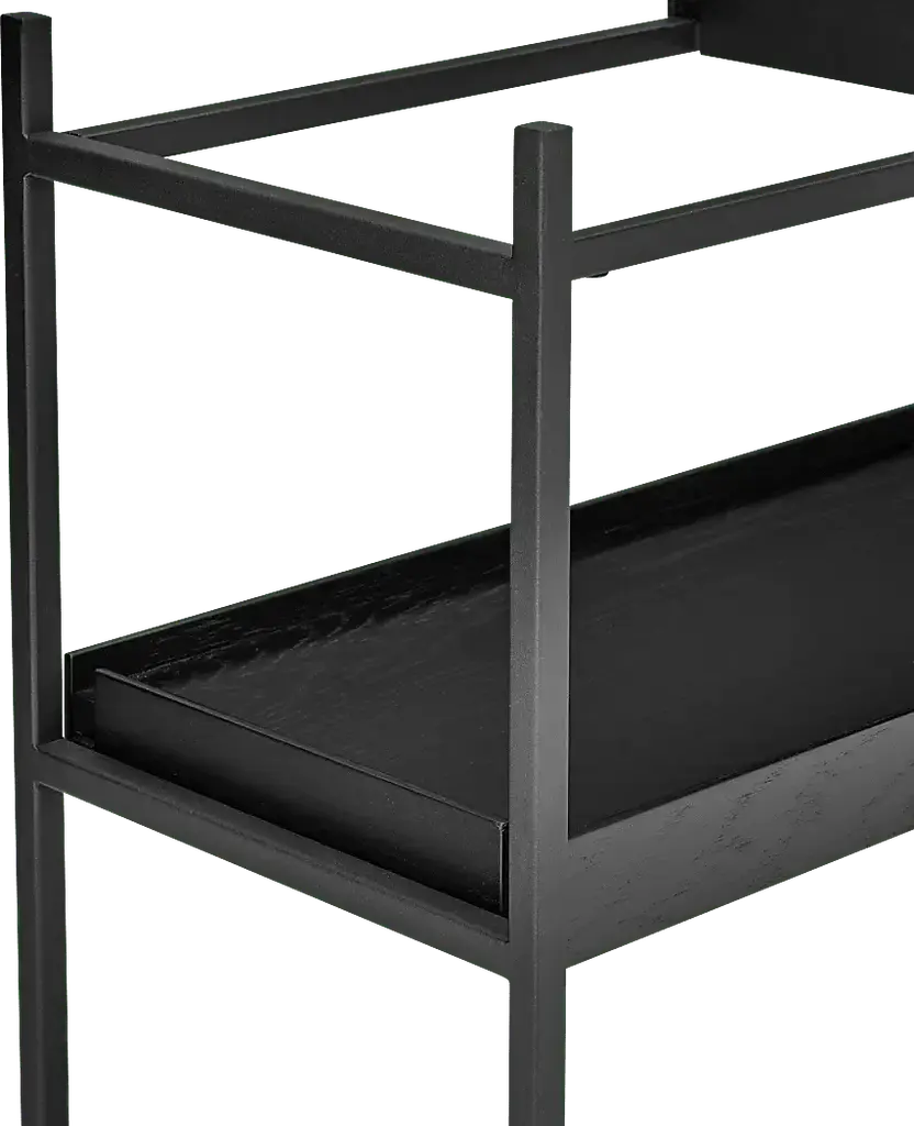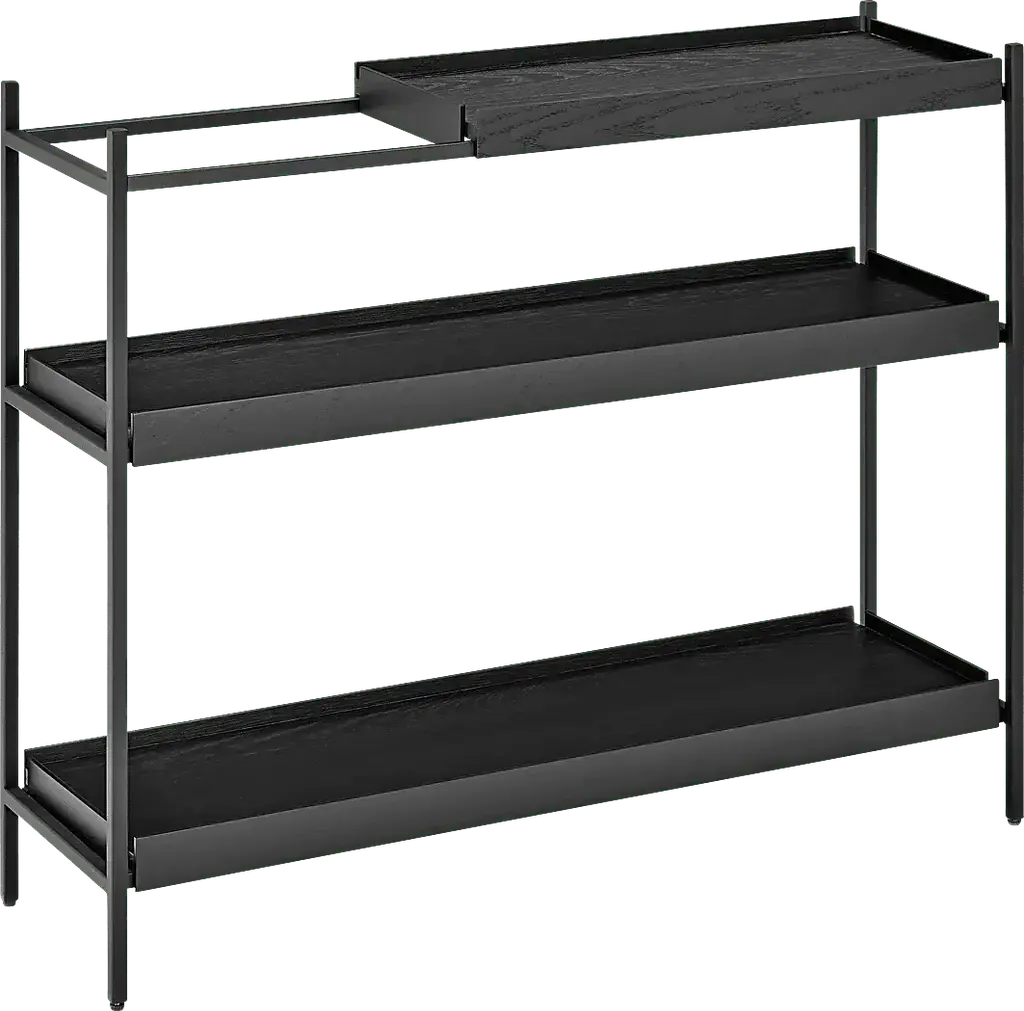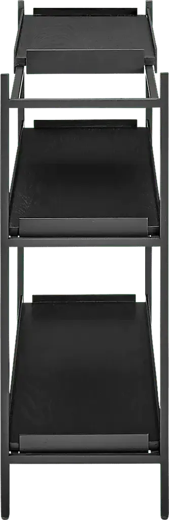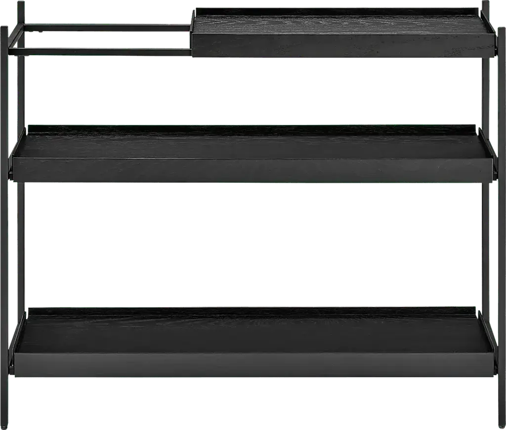 The Leopardcast III black bookcase combines functionality with a striking design. Each shelf features a black powder coated steel frame and black-stained oak veneer shelves, creating a bold, modern aesthetic that suits any room. A standout feature is its movable trays, allowing you to rearrange the shelves effortlessly to fit changing needs or to display items in unique ways. Perfect for organizing, showcasing decor, or adding storage to any space. Customer assembly is required.