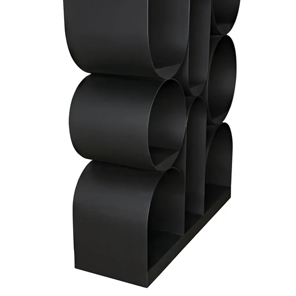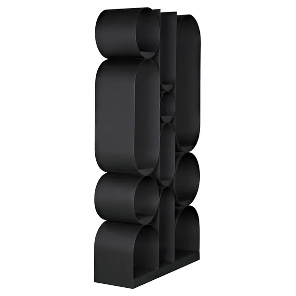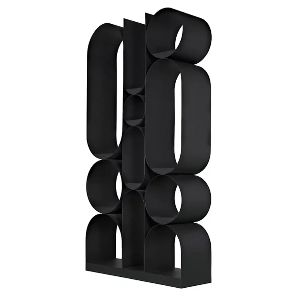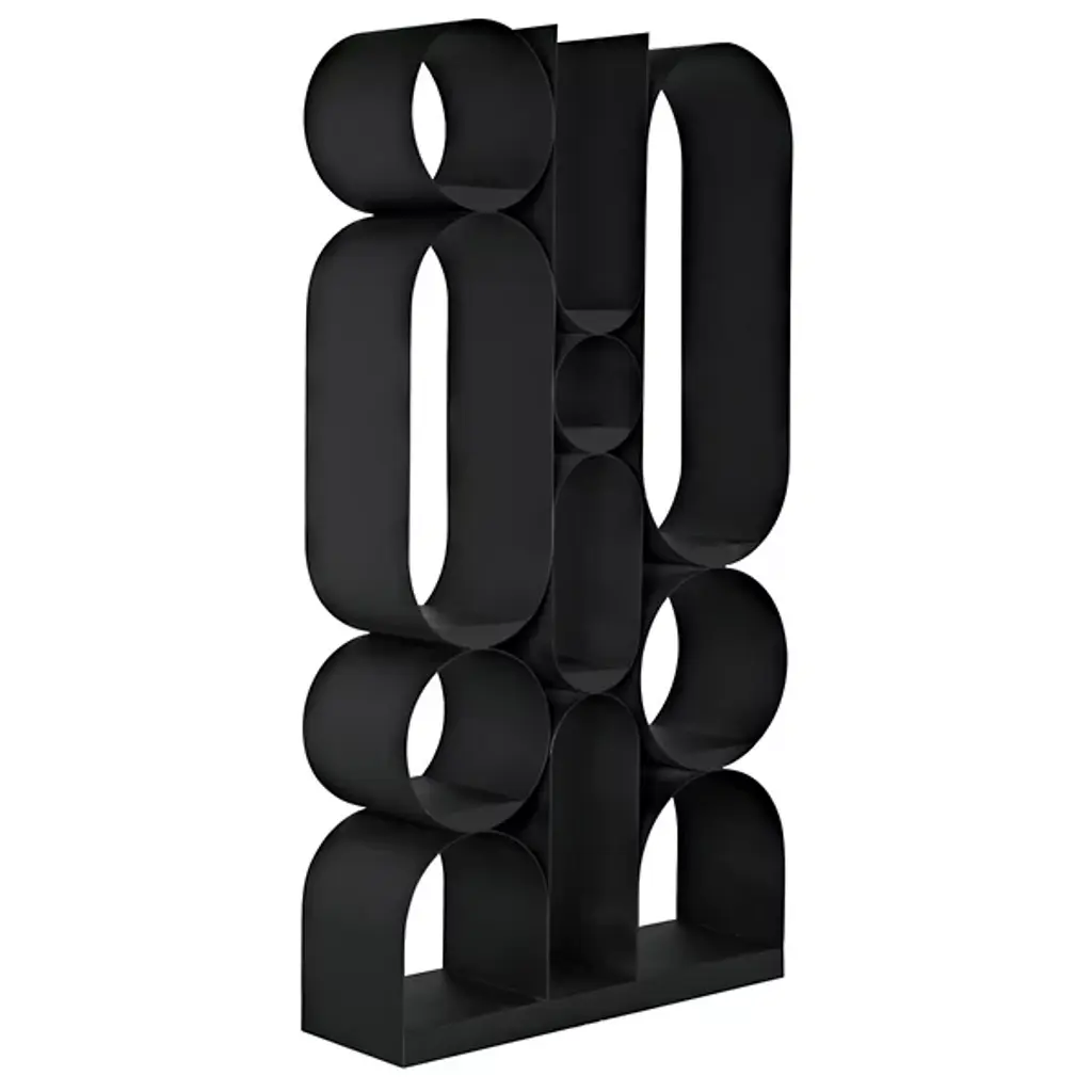 Curving, clever, and contemporary, the open, articulate design of the Letty Bookcase from Noir offers elevated storage with an engaging, unique style. A robust construction of industrial steel, each shelf is created by master artisans welding rounded open shapes together, each with unique imperfections featuring flat shelves in their lower sides able to contain curios or books as needed. The straight lines and flat shelves create a linear contrast to the curving geometric elements, creating a totemic appearance while offering plenty of storage in differently-sized shelf bays.