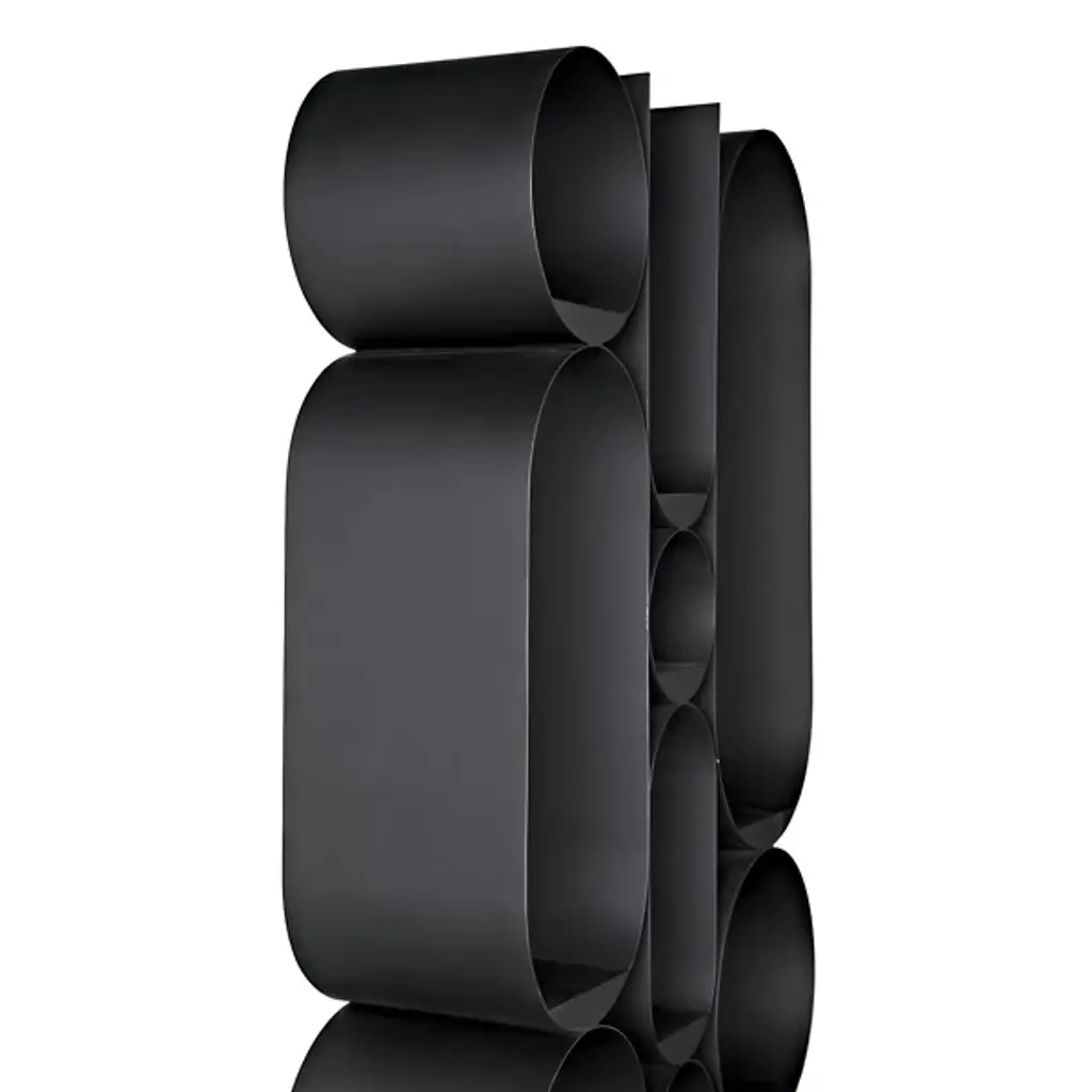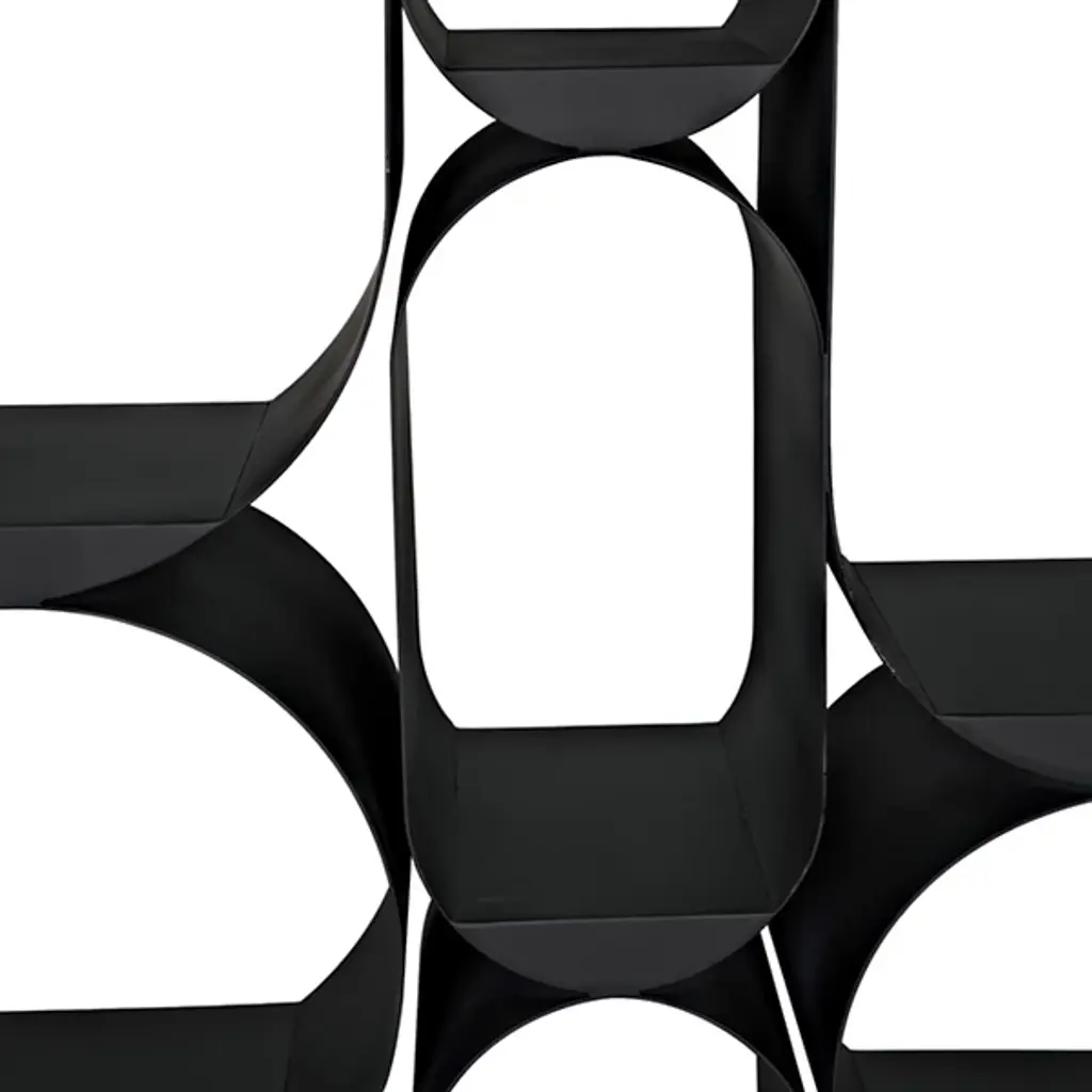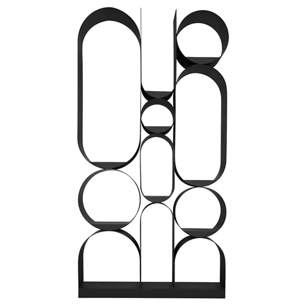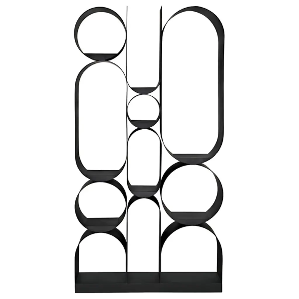 Curving, clever, and contemporary, the open, articulate design of the Letty Bookcase from Noir offers elevated storage with an engaging, unique style. A robust construction of industrial steel, each shelf is created by master artisans welding rounded open shapes together, each with unique imperfections featuring flat shelves in their lower sides able to contain curios or books as needed. The straight lines and flat shelves create a linear contrast to the curving geometric elements, creating a totemic appearance while offering plenty of storage in differently-sized shelf bays.