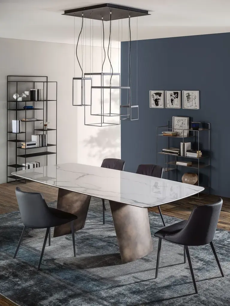 Levia is a painted metal bookcase with minimalist features, where the light figure is combined with a robust soul. Characterized by a geometric play of heights and joints, it reveals an exclusive design and a surprising aesthetic. It is available in three sizes and in nine finishes.Levia is a bookcase that comes from a minimalist, almost abstract trait. The fine lines and light figure, which make it extremely versatile, design a painted metal structure that reveals a strong, robust and spacious soul.A geometric game of heights and joints is created by the particular and asymmetrical arrangement of the capacious shelves which, supported by the thin vertical bars of the structure, seem to hang from tapered metal wires. The result is an exclusive and surprising design.Materials: metal